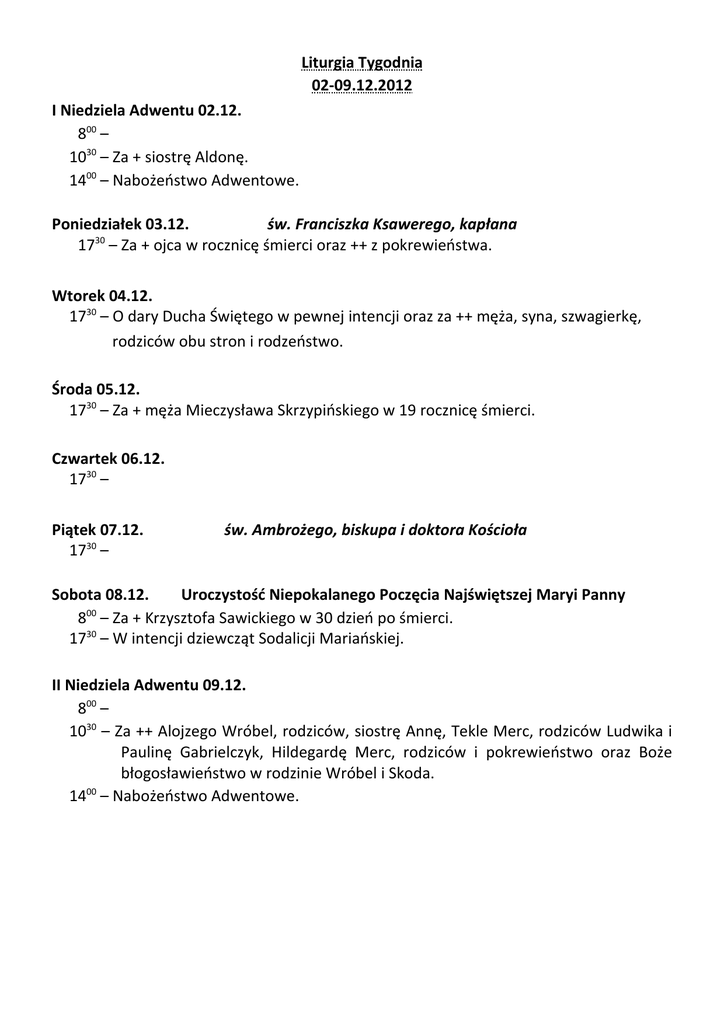 Liturgia Tygodnia 02-09.12.2012 I Niedziela Adwentu 02.12. 800 – 1030 – Za + siostrę Aldonę. 1400 – Nabożeństwo Adwentowe. Poniedziałek 03.12. św. Franciszka Ksawerego, kapłana 30 17 – Za + ojca w rocznicę śmierci oraz ++ z pokrewieństwa. Wtorek 04.12. 1730 – O dary Ducha Świętego w pewnej intencji oraz za ++ męża, syna, szwagierkę, rodziców obu stron i rodzeństwo. Środa 05.12. 1730 – Za + męża Mieczysława Skrzypińskiego w 19 rocznicę śmierci. Czwartek 06.12. 1730 – Piątek 07.12. 1730 – św. Ambrożego, biskupa i doktora Kościoła Sobota 08.12. Uroczystość Niepokalanego Poczęcia Najświętszej Maryi Panny 00 8 – Za + Krzysztofa Sawickiego w 30 dzień po śmierci. 1730 – W intencji dziewcząt Sodalicji Mariańskiej. II Niedziela Adwentu 09.12. 800 – 1030 – Za ++ Alojzego Wróbel, rodziców, siostrę Annę, Tekle Merc, rodziców Ludwika i Paulinę Gabrielczyk, Hildegardę Merc, rodziców i pokrewieństwo oraz Boże błogosławieństwo w rodzinie Wróbel i Skoda. 00 14 – Nabożeństwo Adwentowe. Informacje duszpasterskie 1. 2. 3. 4. 5. 6. Zapraszam dzisiaj na nabożeństwo Adwentowe na godz. 1400. Zapraszam do udziału w czasie Adwentu na Msze św. roratnie. W sobotę obchodzimy Uroczystość Niepokalanego Poczęcia Najświętszej Maryi Panny. Msze św. w tym dniu będą odprawione o godz. 800 i 1730. Msza św. o godz. 1730 będzie odprawiona w intencji dziewczyn z Sodalicji Mariańskiej. Po Mszy św. w sobotę zapraszam na plebanię na kolejny film religijny. W przyszłą niedzielę zapraszam chętne małżeństwa na wyjazd do Biskupowa na adwentowy dzień skupienia. Chętnych proszę o zgłoszenia u mnie. Okazja do spowiedzi św. codziennie o godz. 1700.