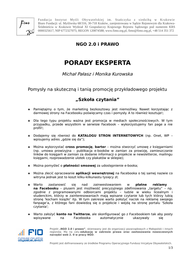 Funda cj a Inst yt ut Myśl i Obywat el ski ej im . St ań czyka z si edzi bą w Kr akowi e Biuro Fundacji: ul. Myśliwska 68/316, 30-718 Kraków, zarejestrowana w Sądzie Rejonowym dla KrakowaŚródmieścia w Krakowie Wydział XI Gospodarczy Krajowego Rejestru Sądowego pod numerem KRS 0000325617, NIP 6772327075; REGON 120874588; www.fimo.org.pl, [email protected], +48 514 351 372 NGO 2.0 i PRAWO PORADY EKSPERTA Michał Pałasz i Monika Kurowska Pomysły na skuteczną i tanią promocję przykładowego projektu „Szkoła czytania” ♣ Pamiętajmy o tym, że marketing bezkosztowy jest niemożliwy. Nawet korzystając z darmowej strony na Facebooku poświęcamy czas i pomysły. A to również kosztuje!; ♣ Dla tego typu projektu ważna jest promocja w mediach społecznościowych. W tym przypadku, przede wszystkim w serwisie Facebook – wykorzystujemy fan page a nie profil!; ♣ Dodajemy się również do KATALOGU STRON INTERNETOWYCH (np. Onet, WP – wpisujemy adres „gdzie się da”); ♣ Można wykorzystać cross promocję, barter – można stworzyć umowę z księgarniami (np. umowa prowizyjna – publikacja e-booków w zamian za prowizję, zamieszczanie linków do księgarń w zamian za dodanie informacji o projekcie w newsletterze, mailingu księgarni, rozprowadzenie ulotek czy plakatów w sklepie); ♣ Można pomyśleć o płatności smsowej za udostępnienie e-booka; ♣ Można zlecić opracowanie aplikacji wewnętrznej na Facebooka o tej samej nazwie co witryna jednak jest to koszt kilku-kilkunastu tysięcy zł; ♣ Warto zastanowić się nad zainwestowaniem w płatne reklamy na Facebooku – plusem jest możliwość precyzyjnego zdefiniowania „targetu” – np. zgodnie z programowanymi odbiorcami projektu – ludzie w wieku licealnym i studenckim, którzy w zainteresowaniach mają wpisane czytanie lub tych którzy lubią stronę 'kocham książki’ itp. W tym zakresie warto położyć nacisk na reklamę swojego fanpage’a, z którego fani dowiedzą się o projekcie i wejdą na stronę portalu 'Szkoła czytania'; ♣ Warto założyć konto na Twitterze, ale skonfigurować go z Facebookiem tak aby posty wpisywane na Facebooka automatycznie ukazywały się Projekt „NGO 2.0 i prawo”, skierowany jest do organizacji pozarządowych z Małopolski i innych regionów. Ma na celu edukację w zakresie prawa oraz zastosowania nowoczesnych narzędzi web 2. 0 w pracy NGO. Projekt jest dofinansowany ze środków Programu Operacyjnego Fundusz Inicjatyw Obywatelskich. 1/3 na Twitterze. Skupianie zbytniej uwagi na Twitterze będzie pracochłonne i mało efektywne; ♣ Jak efektywnie wykorzystać fanpage na Facebooku do promocji projektu 'Szkoła czytania'? o Fanpage zakładamy jak najszybciej – to na nim rozpoczynamy kampanię społeczną (sam projekt wydaje się taką kampanią - dzięki temu każdy chętnie się dopisze na Facebooku jako fan). Budujemy świadomość marki dzięki Facebookowi; o Założyć stronę powitalną, najlepiej oddzielną dla fanów (dziękujemy, że zostałeś fanem, stwórz grupę) a osobno dla osób tylko odwiedzających stronę, zachęcającą by kliknąć na „lubię to” (dołącz do strony, czytaj, recenzuj i polecaj książki, dobry slogan, hasło); Ważna jest promocja eventów, wydarzeń około projektowych – Facebook świetnie się do tego nadaje; o Przed zapraszamy wszystkich, publikujemy informacje i ciekawostki, stwarzamy napięcie wokół wydarzenia, W trakcie można pomyśleć o tzw. Live streaming – np. transmitowanie konferencji, seminarium, spotkania z ekspertem na żywo, Po – zamieszczamy krótki opis, pobudzamy dyskusję, wszystko okraszamy zdjęciami i filmami! Ponadto tagujemy osoby obecne na wydarzeniu – dzięki temu ich znajomi dowiedzą się o evencie i zainteresują projektem; o Publikujemy ankiety dotyczące projektu – nie korzystamy w tym celu z aplikacji czy zakładek, ale bezpośrednio w poście; o Ewentualnie ogłaszamy konkurs – nagroda to oczywiście książka. Ale zwracamy uwagę na regulamin Facebooka. Można też korzystać z aplikacji konkursowych (więcej na megafoni.pl, socialapps.pl); o Wykorzystujemy Facebooka do obsługi klienta – zadawać pytania, informować. Zastępujemy kontakt mailowy kontaktem na Facebooku; o Wykorzystujemy fanpage jako platformę do komentowania – podobnie do forum internetowego; o Proponujemy fanom stworzenie swojego „Indeksu Ksiąg Nakazanych”. Poza ekspertami również beneficjenci projektu powinni mieć możliwość wypowiedzenia się i wytypowania swoim zdaniem wartościowych książek. Dajmy im możliwość udziału w tworzeniu kanonu. Dzięki najlepszym recenzjom, czy wygranej w plebiscycie dana książka może np. trafić na 'Indeks Ksiąg Nakazanych' w projekcie; o Łączymy i polecamy się między stronami – np. eksperci projektowi, pisarze itp. sami mają konta na facebooku – udostępnić te konta (jeśli nie mają – zachęcić do założenia!), wzajemne polecenia się ze stronami księgarni, kawiarni, miejsc, w których organizujemy wydarzenia projektowe; o Recenzje opracowane przez beneficjentów zamieszczamy również na Facebooku; wypowiadania projektu oraz się i ekspertów Projekt „NGO 2.0 i prawo”, skierowany jest do organizacji pozarządowych z Małopolski i innych regionów. Ma na celu edukację w zakresie prawa oraz zastosowania nowoczesnych narzędzi web 2. 0 w pracy NGO. Projekt jest dofinansowany ze środków Programu Operacyjnego Fundusz Inicjatyw Obywatelskich. 2/3 o Sterujemy ruchem między witryną projektu a Facebookiem dzięki social plugins – poza like boxem na stronie głównej witryny odnoszącym do fanpage'a również pluginy „lubię to” pod recenzjami, komentarzami, aktualnościami na witrynie. Pod każdą książką „lubię to”, tweetnięcie, plugin 'add this' (dodaj to); o Zachęcamy gospodarzy klasy lub edytorów do zakładania grup na Facebooku – odpowiedników klas, dzięki temu użytkownicy będą mogli por