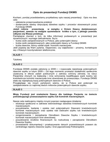 Opis do prezentacji Fundacji DKMS Kochani, poniżej przedstawiamy przykładowy opis naszej prezentacji. Opis ma dwa cele: - ułatwienie przeprowadzania prelekcji - dostarczenie wiedzy dotyczącej dawstwa szpiku i procedur stosowanych przez Fundację DKMS Jeżeli robicie prezentację w związku z Dniem Dawcy dedykowanym pacjentowi, zawsze na wstępie opowiedzcie krótko o tym, z jakiego powodu odbywa się Wasza prelekcja. Pamiętajcie również o tym, że kilka informacji podawanych w prezentacji jest dynamicznych i wymaga uaktualnienia. Są to: - liczba osób zarejestrowanych w Polsce, jako potencjalni dawcy - liczba osób zarejestrowanych, jako potencjalni dawcy w Fundacji DKMS - liczba dawców, którzy oddali szpik i komórki macierzyste Jeśli pojawią się Wam pytania, niejasności, czy wątpliwości - prosimy, kontaktujcie się z Waszym koordynatorem telefonicznie. SLAJD 1 Tytułowy SLAJD 2 Fundacja DKMS została założona w 2008 r. i rozpoczęła rejestrację potencjalnych dawców szpiku w lutym 2009 r. Od tego momentu prowadzi działalność społecznie użyteczną w sferze zadań publicznych z zakresu ochrony zdrowia, na rzecz Pacjentów chorych na białaczkę i inne schorzenia kwalifikujące szpik kostny lub krwiotwórcze komórki macierzyste krwi obwodowej do przeszczepu. Fundacja DKMS stała się największą bazą potencjalnych dawców w Polsce. Przyglądając się innym państwom wiemy, że w Polsce jest potencjał na zarejestrowanie co najmniej dwóch milionów potencjalnych dawców szpiku. SLAJD 3 Misją Fundacji jest znalezienie Dawcy dla każdego Pacjenta na świecie potrzebującego przeszczepienia szpiku lub komórek macierzystych. Nasze cele realizujemy między innymi poprzez następujące działania: - edukacja społeczna w zakresie dobrowolnego dawstwa krwiotwórczych komórek macierzystych; - pozyskiwanie, badanie i opieka nad potencjalnymi Dawcami krwiotwórczych komórek macierzystych oraz opieka nad Dawcami szpiku lub krwiotwórczych komórek macierzystych; - zorganizowanie i zarządzanie Ośrodkiem Dawców Szpiku i krwiotwórczych komórek macierzystych krwi obwodowej; - pozyskiwanie środków finansowych na rozbudowę i zarządzanie Ośrodkiem Dawców Szpiku; - prowadzenie dokumentacji i przekazywanie danych przewidzianych prawem do centralnego rejestru Dawców szpiku i krwi pępowinowej Poltransplant; - współpraca z innymi Ośrodkami Dawców Szpiku, ośrodkami transplantacyjnymi i rejestrem Dawców szpiku i krwi pępowinowej na terenie Polski i poza jej granicami; - badaniach i wspieraniu badań w zakresie poszukiwania i dopasowywania niespokrewnionych Dawców krwiotwórczych komórek macierzystych; - badaniu potrzeb osób chorych na białaczkę i inne schorzenia oraz ich rodzin i lekarzy; - działalności mającej na celu pozyskiwanie funduszy na działania na rzecz osób chorych na białaczkę i inne schorzenia; - wspieraniu osób chorych na białaczkę i inne schorzenia oraz ich rodzin w zakresie wielospecjalistycznych konsultacji (wsparcie psychoonkologiczne, medyczne, socjalne, dietetyczne, rehabilitacyjne itp.); - inicjowaniu grup wsparcia dla osób chorych na białaczkę i inne schorzenia; - współpracy oraz wspieraniu innych organizacji pozarządowych oraz instytucji działających w podobnym do Fundacji obszarze. SLAJD 4 Rodzina DKMS na całym świecie zarejestrowała (do końca września 2016 r.) 6 780 069 potencjalnych dawców. Fundacja DKMS (od lutego 2009r.) zarejestrowała ponad 970 515 potencjalnych dawców (wrzesień 2016 r.) – jesteśmy obecnie największą bazą potencjalnych dawców komórek macierzystych w Polsce. Patrząc na liczby na możecie zobaczyć proporcje. 3 440 osób, które dotychczas zostało dawcami z bazy Fundacji DKMS to zaledwie 0,35% ze wszystkich zarejestrowanych ponad 970 515. SLAJD 5 Polska – 1 092 060 potencjalnych dawców szpiku Obecnie jest zarejestrowanych w Polsce 1 100 515 potencjalnych dawców szpiku we wszystkich bazach. Kiedy rozpoczynaliśmy rejestrować dawców 7 lat temu, w Polsce było zarejestrowanych tylko około 40 000 osób. Obecnie sytuacja wygląda znacznie lepiej. Mogłoby się wydawać, że 1 100 515, to ogromna liczba. Jednak cały czas jest w Polsce wielu pacjentów, którzy czekają na znalezienie zgodnego niespokrewnionego dawcy. (jeśli akcja jest organizowana dla konkretnego pacjenta, wówczas można tu o nim powiedzieć). Kombinacji zapisu fragmentu informacji genetycznej, dzięki której dopasowuje się zgodnego dawcę do pacjenta jest kilkanaście miliardów. Więcej niż ludzi na ziemi. Dlatego może zdarzyć się tak, że są osoby, dla których nie uda znaleźć się zgodnych dawców. Jednak im więcej osób zarejestruje się, tym większą szansa na znalezienie dawcy dla każdego pacjenta. SLAJD 6 Potencjalni dawcy szpiku kostnego - sytuacja w Polsce 1. W Polsce, co godzinę stawiana jest komuś diagnoza: nowotwór krwi – co roku słyszy tę diagnozę ok. 10 000 osób. Wśród nowotworów krwi, najpopularniejsze są białaczki. Liczba ta zwiększa się, co roku o około 4 %. Oprócz białaczek przeszczepienie szpiku może pomóc w powrocie do zdrowia pacjentom przy około 100 różnych chorobach, np. anemii aplastycznej, chłoniakach, ziarnicy złośliwej itd. Pacjentów, których nie udaje się wyleczyć chemioterapią kwalifikuje się do przeszczepienia. Po kwalifikacji pacjenta do przeszczepienia, sprawdzane jest czy osoby najbliżej spokrewnione z chorym są z nim zgodne. Największe prawdopodobieństwo zgodności istnieje pomiędzy rodzeństwem i wynosi 25%. Między dziećmi i rodzicami, to już tylko 3 %. Jeżeli nie uda się znaleźć dawcy w rodzinie, pacjent jest kwalifikowany do przeszczepienia od dawcy niespokrewnionego. SLAJD 7 Prawdopodobieństwo bycia realnym dawcą 5% zarejestrowanych potencjalnych dawców przeszczepienia w przeciągu 10 lat od rejestracji. oddaje komórki do Prawdopodobieństwo, że zostanie się rzeczywistym dawcą wynosi około 5% w ciągu 10 