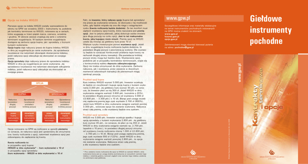 Giełdowe instrumenty pochodne OPCJA KUPNA Nabywca (posiadacz długiej pozycji) prawo kupna instrumentu bazowego SPRZEDAŻY Sprzedawca (wystawca) posiadacz krótkiej pozycji Nabywca (posiadacz długiej pozycji) Sprzedawca (wystawca) posiadacz krótkiej pozycji obowiązek sprzedaży instrumentu bazowego prawo sprzedaży instrumentu bazowego obowiązek kupna instrumentu bazowego Opcje notowane na GPW są rozliczane w sposób pieniężny co oznacza, że nabywca opcji jest uprawniony do otrzymania tzw. kwoty rozliczenia z opcji, natomiast wystawca opcji jest zobowiązany do zapłacenia tej kwoty. Kwota rozliczenia to: w przypadku opcji kupna: (WIG20 w dniu wykonania* – kurs wykonania) x 10 zł w przypadku opcji sprzedaży: (kurs wykonania – WIG20 w dniu wykonania) x 10 zł Giełdowe instrumenty pochodne www.gpw.pl Szczegółowe informacje oraz materiały edukacyjne na temat instrumentów pochodnych notowanych na GPW można znaleźć na stronach: www.gpw.pl futures.gpw.pl opcje.gpw.pl Zainteresowani mogą również kierować pytania na adres: [email protected] www.gpw.pl Pierwsze opcje na indeks WIG20 zostały wprowadzone do obrotu na GPW we wrześniu 2003 r. Instrumenty te, podobnie jak kontrakty terminowe na WIG20, notowane są w seriach, które wygasają w trzeci piątek marca, czerwca, września i grudnia. W obrocie zawsze znajdują się serie z czterema terminami wygaśnięcia. W każdym terminie wygaśnięcia dostępne są zarówno opcje kupna, jak i sprzedaży, z licznymi kursami wykonania. Opcja kupna daje nabywcy prawo do kupna indeksu WIG20 w dniu jej wygaśnięcia po cenie wykonania. Jej sprzedawca (wystawca) ma natomiast obowiązek dostarczenia indeksu, jeżeli nabywca opcji zdecyduje się skorzystać ze swojego prawa. Opcja sprzedaży daje nabywcy prawo do sprzedania indeksu WIG20 w dniu jej wygaśnięcia po cenie wykonania. Jej sprzedawca (wystawca) ma natomiast obowiązek odkupienia indeksu, jeżeli nabywca opcji zdecyduje się skorzystać ze swojego prawa. Fakt, że inwestor, który nabywa opcję (kupna lub sprzedaży) ma prawo jej wykonania oznacza, że skorzysta z tej możliwość tylko, gdy będzie wiązała się ona dla niego z osiągnięciem zysku (kwota rozliczenia będzie dodatnia). Za ten komfort musi zapłacić wystawcy opcji kwotę, która nazywana jest premią opcji. Jest to jedyna płatność, jakiej dokonuje osoba otwierająca długą pozycję na rynku opcji. Jest to też maksymalna kwota, jaką kupujący może stracić. Premię opcji na WIG20 ustala się mnożąc jej giełdowy kurs przez 10 zł. Większe ryzyko inwestycyjne ponosi wystawca opcji. Jeżeli w dniu wygaśnięcia kwota rozliczenia będzie dodatnia, to posiadacz długiej pozycji z pewnością ją wykona. Dla wystawcy będzie to oznaczać konieczność przelania tejże kwoty na rachunek drugiej strony transakcji. Dla posiadacza krótkiej pozycji straty mogą być bardzo duże. Wystawianie opcji, podobnie jak w przypadku kontraktów terminowych, wiąże się z koniecznością wpłaty depozytu zabezpieczającego. Opcji nie trzeba utrzymywać do dnia wykonania. Zarówno nabywca, jak i wystawca, przez zawarcie w dowolnym momencie odwrotnych transakcji do pierwotnych mogą zamknąć pozycję. Przykład opcji kupna Kurs indeksu WIG20 wynosi 3.000 pkt. Inwestor oczekuje, że będzie on zwyżkował i kupuje opcję kupna z kursem wykonania 3.300 pkt. Jej giełdowy kurs wynosi 30 pkt, co oznacza, że inwestor płaci za nią 300 zł. Jeżeli WIG20 w dniu wykonania osiągnie wartość 3.600 pkt. (wzrośnie o 20%), to posiadacz długiej pozycji otrzyma od wystawcy 3.000 zł ([3.600 pkt. – 3.300 pkt.] x 10 zł). Biorąc pod uwagę wcześniej zapłaconą premię jego zysk wyniesie 2.700 zł (900%). Jeżeli kurs WIG20 w dniu wykonania osiągnie wartość poniżej 3.300 pkt., wówczas opcja nie zostanie wykonana. Nabywca straci całą premię, a dla wystawcy będzie ona zyskiem. Przykład opcji sprzedaży WIG20 ma 3.000 pkt. Inwestor oczekuje spadku i kupuje opcję sprzedaży z kursem wykonania 2.800 pkt. Jej giełdowy kurs wynosi 45 pkt., co oznacza, że płaci za nią 450 zł. Jeżeli WIG20 w dniu wykonania osiągnie wartość np. 2.700 pkt. (spadnie o 10 proc.), to posiadacz długiej pozycji otrzyma od wystawcy kwotę rozliczenia równą 1.000 zł ([2.800 pkt. – 2.700 pkt.] x 10 zł). Biorąc pod uwagę zapłaconą premię, jego zysk wyniesie 550 zł (122%). Jeżeli WIG20 w dniu wykonania osiągnie wartość powyżej 2.800 pkt., to opcja nie zostanie wykonana. Nabywca straci całą premię, a dla wystawcy będzie ona zyskiem. * Przy ustalaniu kwoty rozliczenia dla opcji na WIG20 za wartość WIG20 z dnia wykonania brana jest po uwagę średnia arytmetyczna ze wszystkich wartości tego indeksu z ostatniej godziny notowań ciągłych oraz wartości tego indeksu ustalonej na zamknięcie sesji giełdowej. Giełda Papierów Wartościowych w Warszawie SA, luty 2008 Opcje na indeks WIG20 Giełda Papierów Wartościowych w Warszawie Zysk wynagrodzeniem za ryzyko Cechą charakterystyczną instrumentów pochodnych jest dźwignia finansowa. Sprawia ona, że wartość zainwestowanych pieniędzy, w zależności od sytuacji rynkowej, rośnie lub maleje w znacznie większym tempie niż na rynku akcji. Możliwe jest więc osiąganie bardzo wysokich stóp zwrotu. Ryzykuje się jednak przy tym także utratę znacznej części zainwestowanych pieniędzy, a w skrajnych przypadkach nawet większej kwoty, niż pierwotnie ulokowana. W rzeczywistości, poziom ryzyka inwestycyjnego zależy głównie od samego inwestora – od tego, w jakim celu będzie wykorzystywał instrumenty pochodne i jak bardzo będzie bazował na wbudowanej w nie dźwigni finansowej. Zyskowne inwestowanie w instrumenty pochodne wymaga: • starannego planowania inwestycji włącznie ze sposobem jej zamknięcia • ugruntowanej wiedzy • cierpliwości • żelaznej dyscypliny. Konstrukcję i zasady funkcjonowania derywatów powinien znać każdy inwestor. Rezy
