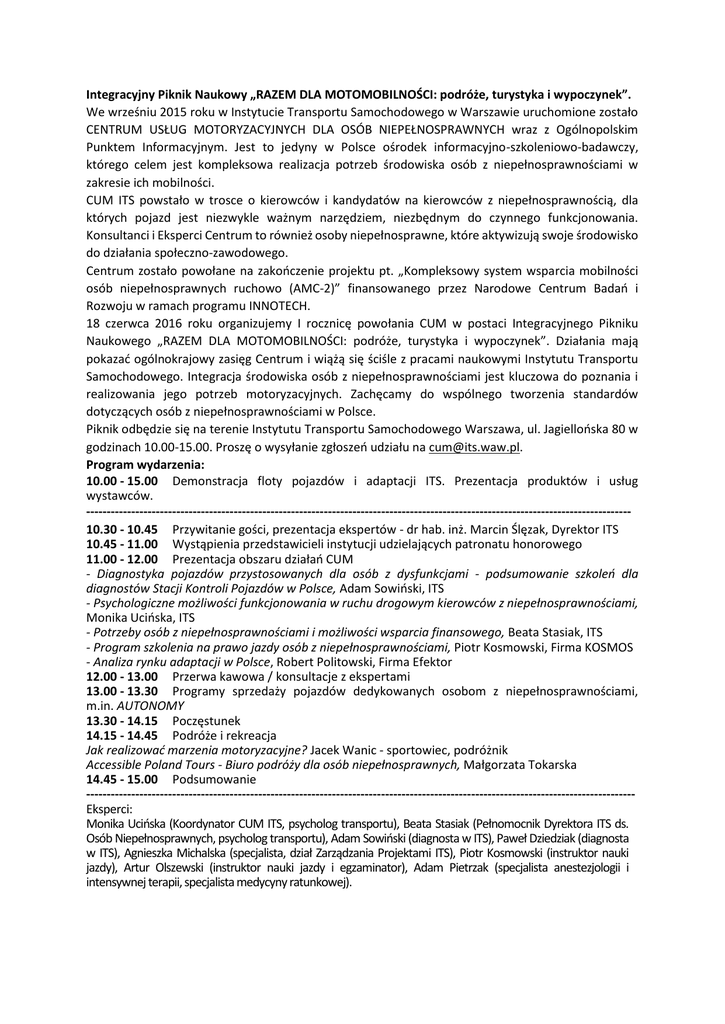 Integracyjny Piknik Naukowy „RAZEM DLA MOTOMOBILNOŚCI: podróże, turystyka i wypoczynek”. We wrześniu 2015 roku w Instytucie Transportu Samochodowego w Warszawie uruchomione zostało CENTRUM USŁUG MOTORYZACYJNYCH DLA OSÓB NIEPEŁNOSPRAWNYCH wraz z Ogólnopolskim Punktem Informacyjnym. Jest to jedyny w Polsce ośrodek informacyjno-szkoleniowo-badawczy, którego celem jest kompleksowa realizacja potrzeb środowiska osób z niepełnosprawnościami w zakresie ich mobilności. CUM ITS powstało w trosce o kierowców i kandydatów na kierowców z niepełnosprawnością, dla których pojazd jest niezwykle ważnym narzędziem, niezbędnym do czynnego funkcjonowania. Konsultanci i Eksperci Centrum to również osoby niepełnosprawne, które aktywizują swoje środowisko do działania społeczno-zawodowego. Centrum zostało powołane na zakończenie projektu pt. „Kompleksowy system wsparcia mobilności osób niepełnosprawnych ruchowo (AMC-2)” finansowanego przez Narodowe Centrum Badań i Rozwoju w ramach programu INNOTECH. 18 czerwca 2016 roku organizujemy I rocznicę powołania CUM w postaci Integracyjnego Pikniku Naukowego „RAZEM DLA MOTOMOBILNOŚCI: podróże, turystyka i wypoczynek”. Działania mają pokazać ogólnokrajowy zasięg Centrum i wiążą się ściśle z pracami naukowymi Instytutu Transportu Samochodowego. Integracja środowiska osób z niepełnosprawnościami jest kluczowa do poznania i realizowania jego potrzeb motoryzacyjnych. Zachęcamy do wspólnego tworzenia standardów dotyczących osób z niepełnosprawnościami w Polsce. Piknik odbędzie się na terenie Instytutu Transportu Samochodowego Warszawa, ul. Jagiellońska 80 w godzinach 10.00-15.00. Proszę o wysyłanie zgłoszeń udziału na [email protected]. Program wydarzenia: 10.00 - 15.00 Demonstracja floty pojazdów i adaptacji ITS. Prezentacja produktów i usług wystawców. ------------------------------------------------------------------------------------------------------------------------------------10.30 - 10.45 Przywitanie gości, prezentacja ekspertów - dr hab. inż. Marcin Ślęzak, Dyrektor ITS 10.45 - 11.00 Wystąpienia przedstawicieli instytucji udzielających patronatu honorowego 11.00 - 12.00 Prezentacja obszaru działań CUM - Diagnostyka pojazdów przystosowanych dla osób z dysfunkcjami - podsumowanie szkoleń dla diagnostów Stacji Kontroli Pojazdów w Polsce, Adam Sowiński, ITS - Psychologiczne możliwości funkcjonowania w ruchu drogowym kierowców z niepełnosprawnościami, Monika Ucińska, ITS - Potrzeby osób z niepełnosprawnościami i możliwości wsparcia finansowego, Beata Stasiak, ITS - Program szkolenia na prawo jazdy osób z niepełnosprawnościami, Piotr Kosmowski, Firma KOSMOS - Analiza rynku adaptacji w Polsce, Robert Politowski, Firma Efektor 12.00 - 13.00 Przerwa kawowa / konsultacje z ekspertami 13.00 - 13.30 Programy sprzedaży pojazdów dedykowanych osobom z niepełnosprawnościami, m.in. AUTONOMY 13.30 - 14.15 Poczęstunek 14.15 - 14.45 Podróże i rekreacja Jak realizować marzenia motoryzacyjne? Jacek Wanic - sportowiec, podróżnik Accessible Poland Tours - Biuro podróży dla osób niepełnosprawnych, Małgorzata Tokarska 14.45 - 15.00 Podsumowanie -------------------------------------------------------------------------------------------------------------------------------------Eksperci: Monika Ucińska (Koordynator CUM ITS, psycholog transportu), Beata Stasiak (Pełnomocnik Dyrektora ITS ds. Osób Niepełnosprawnych, psycholog transportu), Adam Sowiński (diagnosta w ITS), Paweł Dziedziak (diagnosta w ITS), Agnieszka Michalska (specjalista, dział Zarządzania Projektami ITS), Piotr Kosmowski (instruktor nauki jazdy), Artur Olszewski (instruktor nauki jazdy i egzaminator), Adam Pietrzak (specjalista anestezjologii i intensywnej terapii, specjalista medycyny ratunkowej).