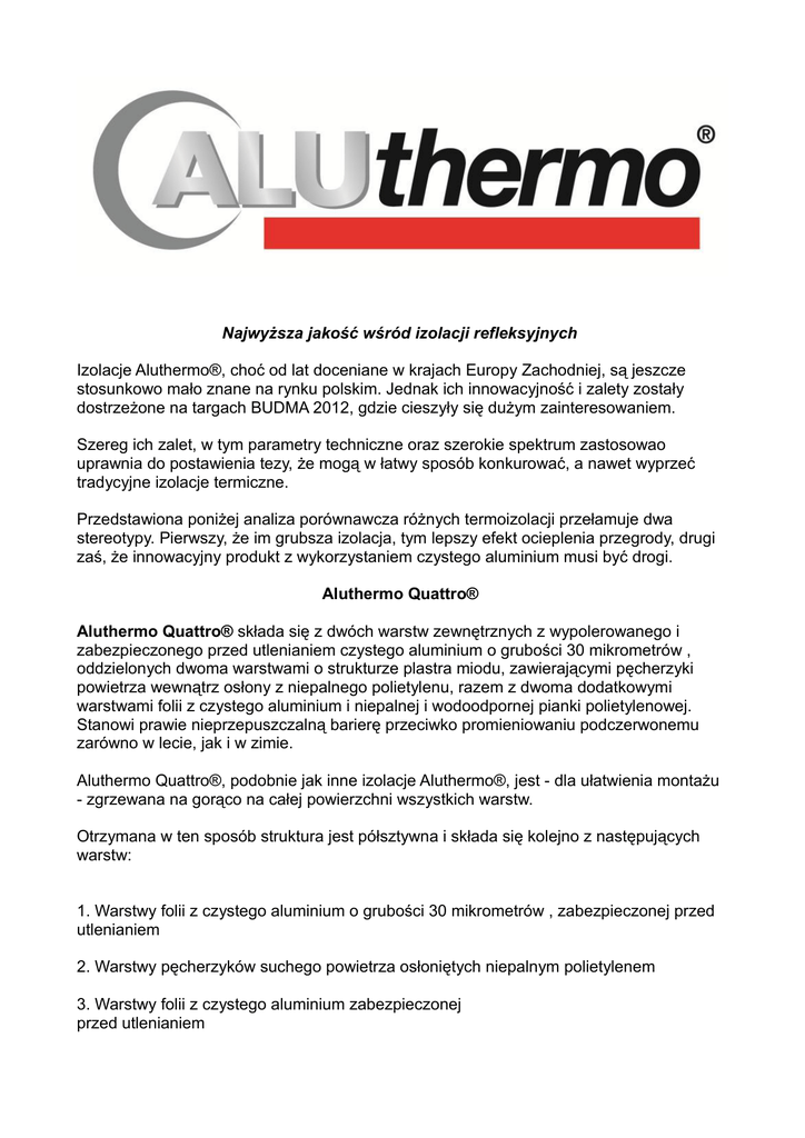 Najwyższa jakość wśród izolacji refleksyjnych Izolacje Aluthermo®, choć od lat doceniane w krajach Europy Zachodniej, są jeszcze stosunkowo mało znane na rynku polskim. Jednak ich innowacyjność i zalety zostały dostrzeżone na targach BUDMA 2012, gdzie cieszyły się dużym zainteresowaniem. Szereg ich zalet, w tym parametry techniczne oraz szerokie spektrum zastosowao uprawnia do postawienia tezy, że mogą w łatwy sposób konkurować, a nawet wyprzeć tradycyjne izolacje termiczne. Przedstawiona poniżej analiza porównawcza różnych termoizolacji przełamuje dwa stereotypy. Pierwszy, że im grubsza izolacja, tym lepszy efekt ocieplenia przegrody, drugi zaś, że innowacyjny produkt z wykorzystaniem czystego aluminium musi być drogi. Aluthermo Quattro® Aluthermo Quattro® składa się z dwóch warstw zewnętrznych z wypolerowanego i zabezpieczonego przed utlenianiem czystego aluminium o grubości 30 mikrometrów , oddzielonych dwoma warstwami o strukturze plastra miodu, zawierającymi pęcherzyki powietrza wewnątrz osłony z niepalnego polietylenu, razem z dwoma dodatkowymi warstwami folii z czystego aluminium i niepalnej i wodoodpornej pianki polietylenowej. Stanowi prawie nieprzepuszczalną barierę przeciwko promieniowaniu podczerwonemu zarówno w lecie, jak i w zimie. Aluthermo Quattro®, podobnie jak inne izolacje Aluthermo®, jest - dla ułatwienia montażu - zgrzewana na gorąco na całej powierzchni wszystkich warstw. Otrzymana w ten sposób struktura jest półsztywna i składa się kolejno z następujących warstw: 1. Warstwy folii z czystego aluminium o grubości 30 mikrometrów , zabezpieczonej przed utlenianiem 2. Warstwy pęcherzyków suchego powietrza osłoniętych niepalnym polietylenem 3. Warstwy folii z czystego aluminium zabezpieczonej przed utlenianiem 4. Niepalnej i wodoszczelnej pianki polietylenowej 5. Warstwy folii z czystego aluminium zabezpieczonej przed utlenianiem 6. Warstwy pęcherzyków suchego powietrza osłoniętych niepalnym polietylenem 7.Warstwy folii z czystego aluminium o grubości 30 mikrometrów, zabezpieczonej przed utlenianiem Parametry techniczne: Współczynnik oporu cieplnego: R= 5,70 m2 K/W (około 20 cm wełny mineralnej) Współczynnik przenikania ciepła: U=0,175 W/m2 K Klasa ogniowa: B - s1 - d0 Grubośd: 10 mm Waga: +/- 750g/m2 Temperatura robocza -40oC do + 80oC Odpornośd na zgniatanie: 573kg/m2 przy 10% odkształcenia 1232kg/m2 przy 20% odkształcenia Wymiary rolki: (30 m2): szer. 1,20mb x dł.= 25mb ZALETY ● Całkowicie wodoodporna ● Klasa ogniowa: B - s1 – d0 ● Warstwa czystego aluminium o grubości 30 mikrometrów zabezpieczona przeciw utlenianiu ● Niealergenna i nietoksyczna ● Artystyczna ● Niegnijąca ● Lekka ● Przetwarzalna ● Mała kubatura składowania ● Półsztywna, wykonana w jednym kawałku ● Brak kondensacji ● Łatwe operowanie ● Możliwośd adaptacji do wszystkich kształtów i powierzchni ● Nie opada i nie przesuwa się ● Szybki i prosty montaż ● Uzyskiwanie dodatkowej przestrzeni ZASTOSOWANIE ● ● ● ● ● ● ● ● izolacje dachów i poddaszy izolacje ścian izolacje posadzek izolacje stropów izolacje garaży izolacje nadproży i pilastrów izolacje płyt balkonowych izolacje sieci ciepłowniczych i kotłów Dobór grubości tradycyjnych termoizolacji dla uzyskania parametrów Aluthermo Quatro. Wsp. oporu cieplnego: R=d/λ *W/(m²K)+ Wsp. przenikania ciepła: U = 1/R [W/m2 K] Aluthermo QUATTRO R = 5,70 U=0,175 Styropian zwykły R = 5,70 U=0,175 Styropian Silver R = 5,70 Styropian Platinum Plus Rodzaj termoizolacji Wsp. Równoważna przewodności grubośd cieplnej: λ W/ izolacji [mm] (m²K) Cena katalogowa netto za m2 *zł/m2] 10 57,53* λ = 0,042 239,4 28,52 U=0,175 λ = 0,04 228 37,5 R = 5,70 U=0,175 λ = 0,031 176,7 54,51 Wełna skalna Rockmin Plus R = 5,70 U=0,175 λ = 0,037 210,9 46,77 Wełna kamienna Paroc FAS 3 R = 5,70 U=0,175 λ = 0,036 205,2 83,39 Pianka Bauder PIR R = 5,70 U=0,175 λ = 0,023 131,1 95,66 *Cena katalogowa netto Aluthermo Quattro: 13,7 € wg kursu z dn. 02.02.2012. 1€ = 4,1995 zł Aluthermo® 7mm Aluthermo® 7mm jest systemem izolacji działającym na zasadzie odbijania. Składa się z dwóch warstw oddzielonych strukturą plastra miodu wypełnioną pęcherzykami powietrza zamkniętymi w ognioodpornej powłoce polietylenowej, która jest z obu stron pokryta folią czystego aluminium o grubości 30 mikrometrów, wypolerowaną i zabezpieczoną przed utlenianiem. Wszystkie elementy struktury Aluthermo® 7mm są połączone na całej powierzchni metodą zgrzewania na gorąco. W ten sposób uzyskano strukturę półsztywną. Powietrze w pęcherzykach jest suche i stabilne. Pozwala to uniknąd efektu kondensacji w zalecanym zakresie temperatur dla Aluthermo® 7 mm o dowolnej grubości. A+D warstwa czystego aluminium o grubości 30 mikrometrów. B+C Ognioodporna warstwa polietylenowa zawierająca bąbelki suchego i stabilnego powietrza o średnicy 10 mm i 4 mm wysokości Poszczególne warstwy są zgrzane ze sobą na całości powierzchni Parametry techniczne: Współczynnik oporu cieplnego: R= 2,639 m2 K/W (około 10 cm wełny mineralnej) Współczynnik przenikania ciepła: U=0,378 W/m2 K Klasa ogniowa: B - s1 - d0 Grubośd: 7 mm Waga: +/- 550 g/m2 Temperatura robocza -40oC do + 80oC Odpornośd na zgniatanie: 250 kg / m2 przy 10 % odkształcenia Wymiary rolki: (30,25 m2): szer. 1,25 mb x dł.= 25 mb ZALETY ● Całkowicie wodoodporna ● Klasa ogniowa: B - s1 – d0 ● Warstwa czystego aluminium o grubości 30 mikrometrów zabezpieczona przeciw utlenianiu ● Niealergenna i nietoksyczna ● Artystyczna ● Niegnijąca ● Lekka ● Przetwarzalna ● Mała kubatura składowania ZASTOSOWANIE izolacje dachów i poddaszy izolacje ścian izolacje kanałów wentylacyjnych izolacje instalacji c.o. i c.t. oraz pod grzejniki ● izolacje garaży ● izolacje piwnic ● ● ● ● ● Półsztywna, wykonana w jednym kawałku ● Brak kondensacji