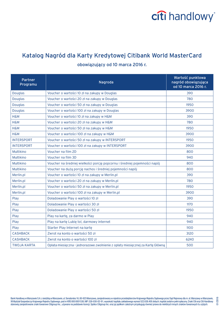 Katalog Nagród dla Karty Kredytowej Citibank World MasterCard obowiązujący od 10 marca 2016 r. Nagroda Wartość punktowa nagród obowiązująca od 10 marca 2016 r. Douglas Voucher o wartości 10 zł na zakupy w Douglas 390 Douglas Voucher o wartości 20 zł na zakupy w Douglas 780 Douglas Voucher o wartości 50 zł na zakupy w Douglas 1950 Douglas Voucher o wartości 100 zł na zakupy w Douglas 3900 H&M Voucher o wartości 10 zł na zakupy w H&M 390 H&M Voucher o wartości 20 zł na zakupy w H&M 780 H&M Voucher o wartości 50 zł na zakupy w H&M 1950 H&M Voucher o wartości 100 zł na zakupy w H&M 3900 INTERSPORT Voucher o wartości 50 zł na zakupy w INTERSPORT 1950 INTERSPORT Voucher o wartości 100 zł na zakupy w INTERSPORT 3900 Multikino Voucher na film 2D 800 Multikino Voucher na film 3D 940 Multikino Voucher na średniej wielkości porcję popcornu i średniej pojemności napój 800 Multikino Voucher na dużą porcję nachos i średniej pojemności napój 800 Merlin.pl Voucher o wartości 10 zł na zakupy w Merlin.pl 390 Merlin.pl Voucher o wartości 20 zł na zakupy w Merlin.pl 780 Merlin.pl Voucher o wartości 50 zł na zakupy w Merlin.pl 1950 3900 Merlin.pl Voucher o wartości 100 zł na zakupy w Merlin.pl Play Doładowanie Play o wartości 10 zł 390 Play Doładowanie Play o wartości 30 zł 1170 Play Doładowanie Play o wartości 50 zł 1950 Play Play na kartę, za darmo w Play 940 Play Play na kartę Lubię to!, darmowy internet 940 Play Starter Play Internet na kartę 1100 CASHBACK Zwrot na konto o wartości 50 zł 3120 CASHBACK Zwrot na konto o wartości 100 zł 6240 TWOJA KARTA Opłata miesięczna – jednorazowe zwolnienie z opłaty miesięcznej za Kartę Główną 500 Bank Handlowy w Warszawie S.A. z siedzibą w Warszawie, ul. Senatorska 16, 00-923 Warszawa, zarejestrowany w rejestrze przedsiębiorców Krajowego Rejestru Sądowego przez Sąd Rejonowy dla m. st. Warszawy w Warszawie, XII Wydział Gospodarczy Krajowego Rejestru Sądowego, pod nr KRS 000 0001538; NIP: 526-030-02-91; wysokość kapitału zakładowego wynosi 522.638.400 złotych; kapitał został w pełni opłacony. Znaki Citi oraz Citi Handlowy stanowią zarejestrowane znaki towarowe Citigroup Inc., używane na podstawie licencji. Spółce Citigroup Inc. oraz jej spółkom zależnym przysługują również prawa do niektórych innych znaków towarowych tu użytych. 01/2016 Partner Programu