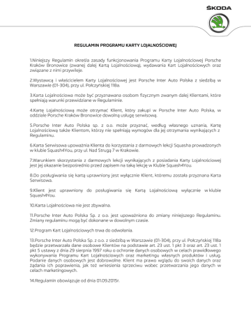REGULAMIN PROGRAMU KARTY LOJALNOŚCIOWEJ 1.Niniejszy Regulamin określa zasady funkcjonowania Programu Karty Lojalnościowej Porsche Kraków Bronowice (zwanej dalej Kartą Lojalnościową), wydawania Kart Lojalnościowych oraz związane z nimi przywileje. 2.Wystawcą i właścicielem Karty Lojalnościowej jest Porsche Inter Auto Polska z siedzibą w Warszawie (01-304), przy ul. Połczyńskiej 118a. 3.Karta Lojalnościowa może być przyznawana osobom fizycznym zwanym dalej Klientami, które spełniają warunki przewidziane w Regulaminie. 4.Kartę Lojalnościową może otrzymać Klient, który zakupi w Porsche Inter Auto Polska, w oddziale Porsche Kraków Bronowice dowolną usługę serwisową. 5.Porsche Inter Auto Polska sp. z o.o. może przyznać, według własnego uznania, Kartę Lojalnościową także Klientom, którzy nie spełniają wymogów dla jej otrzymania wynikających z Regulaminu. 6.Karta Serwisowa upoważnia Klienta do korzystania z darmowych lekcji Squasha prowadzonych w klubie Squash4You, przy ul. Nad Strugą 7 w Krakowie. 7.Warunkiem skorzystania z darmowych lekcji wynikających z posiadania Karty Lojalnościowej jest jej okazanie bezpośrednio przed zapisem na taką lekcję w Klubie Squash4You. 8.Do posługiwania się kartą uprawniony jest wyłącznie Klient, któremu została przyznana Karta Serwisowa. 9.Klient jest uprawniony do posługiwania się Kartą Lojalnościową wyłącznie w klubie Squash4You. 10.Karta Lojalnościowa nie jest zbywalna. 11.Porsche Inter Auto Polska Sp. z o.o. jest upoważniona do zmiany niniejszego Regulaminu. Zmiany regulaminu mogą być dokonane w dowolnym czasie. 12.Program Kart Lojalnościowych trwa do odwołania. 13.Porsche Inter Auto Polska Sp. z o.o. z siedzibą w Warszawie (01-304), przy ul. Połczyńskiej 118a będzie przetwarzała dane osobowe Klientów na podstawie art. 23 ust. 1 pkt 3 oraz art. 23 ust. 1 pkt 5 ustawy z dnia 29 sierpnia 1997 roku o ochronie danych osobowych w celach prawidłowego wykonywania Programu Kart Lojalnościowych oraz marketingu własnych produktów i usług. Podanie danych osobowych jest dobrowolne. Klient ma prawo wglądu do swoich danych oraz żądania ich poprawienia, jak też wniesienia sprzeciwu wobec przetwarzania jego danych w celach marketingowych. 14.Regulamin obowiązuje od dnia 01.09.2015r.