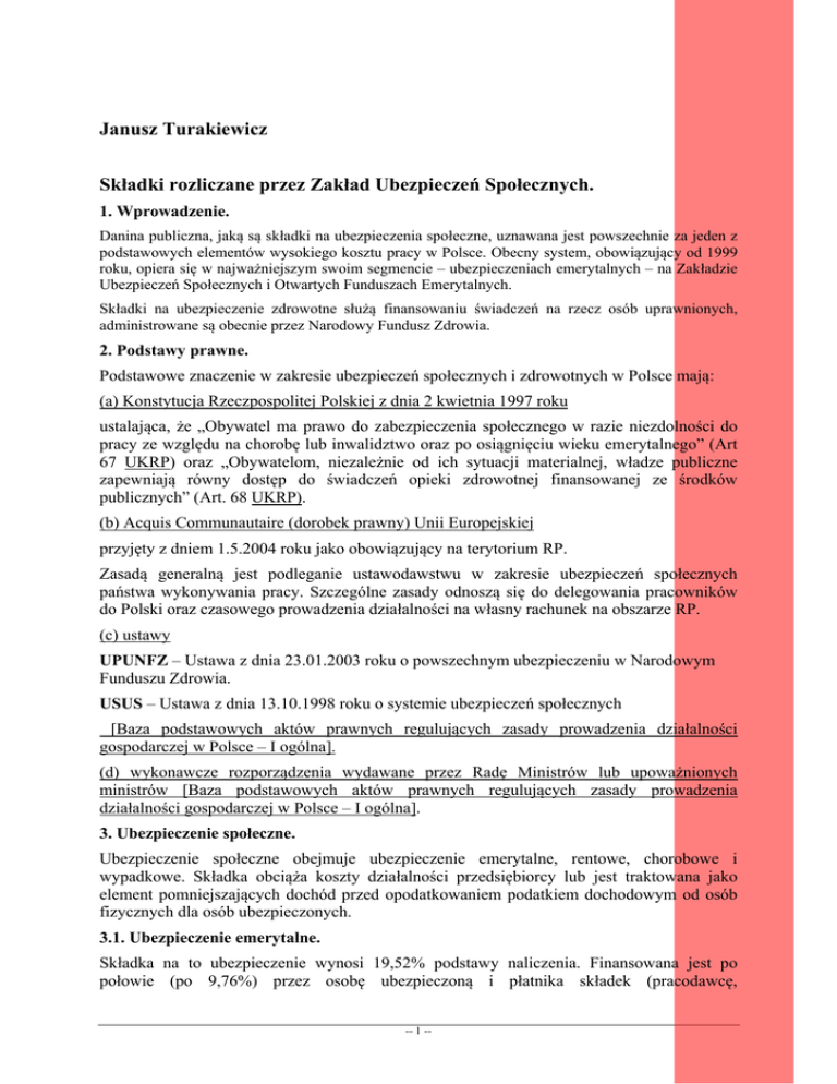 Janusz Turakiewicz Składki rozliczane przez Zakład Ubezpieczeń Społecznych. 1. Wprowadzenie. Danina publiczna, jaką są składki na ubezpieczenia społeczne, uznawana jest powszechnie za jeden z podstawowych elementów wysokiego kosztu pracy w Polsce. Obecny system, obowiązujący od 1999 roku, opiera się w najważniejszym swoim segmencie – ubezpieczeniach emerytalnych – na Zakładzie Ubezpieczeń Społecznych i Otwartych Funduszach Emerytalnych. Składki na ubezpieczenie zdrowotne służą finansowaniu świadczeń na rzecz osób uprawnionych, administrowane są obecnie przez Narodowy Fundusz Zdrowia. 2. Podstawy prawne. Podstawowe znaczenie w zakresie ubezpieczeń społecznych i zdrowotnych w Polsce mają: (a) Konstytucja Rzeczpospolitej Polskiej z dnia 2 kwietnia 1997 roku ustalająca, że „Obywatel ma prawo do zabezpieczenia społecznego w razie niezdolności do pracy ze względu na chorobę lub inwalidztwo oraz po osiągnięciu wieku emerytalnego” (Art 67 UKRP) oraz „Obywatelom, niezależnie od ich sytuacji materialnej, władze publiczne zapewniają równy dostęp do świadczeń opieki zdrowotnej finansowanej ze środków publicznych” (Art. 68 UKRP). (b) Acquis Communautaire (dorobek prawny) Unii Europejskiej przyjęty z dniem 1.5.2004 roku jako obowiązujący na terytorium RP. Zasadą generalną jest podleganie ustawodawstwu w zakresie ubezpieczeń społecznych państwa wykonywania pracy. Szczególne zasady odnoszą się do delegowania pracowników do Polski oraz czasowego prowadzenia działalności na własny rachunek na obszarze RP. (c) ustawy UPUNFZ – Ustawa z dnia 23.01.2003 roku o powszechnym ubezpieczeniu w Narodowym Funduszu Zdrowia. USUS – Ustawa z dnia 13.10.1998 roku o systemie ubezpieczeń społecznych [Baza podstawowych aktów prawnych regulujących zasady prowadzenia działalności gospodarczej w Polsce – I ogólna]. (d) wykonawcze rozporządzenia wydawane przez Radę Ministrów lub upoważnionych ministrów [Baza podstawowych aktów prawnych regulujących zasady prowadzenia działalności gospodarczej w Polsce – I ogólna]. 3. Ubezpieczenie społeczne. Ubezpieczenie społeczne obejmuje ubezpieczenie emerytalne, rentowe, chorobowe i wypadkowe. Składka obciąża koszty działalności przedsiębiorcy lub jest traktowana jako element pomniejszających dochód przed opodatkowaniem podatkiem dochodowym od osób fizycznych dla osób ubezpieczonych. 3.1. Ubezpieczenie emerytalne. Składka na to ubezpieczenie wynosi 19,52% podstawy naliczenia. Finansowana jest po połowie (po 9,76%) przez osobę ubezpieczoną i płatnika składek (pracodawcę, -- 1 -- zleceniodawcę). W przypadku przedsiębiorców – osób fizycznych i osób z nimi współpracujących całą składkę opłaca przedsiębiorca. Podstawa naliczenia składek na ubezpieczenie emerytalne podlega ograniczeniu. Kwota rocznego ograniczenia podstawy wymiaru składek na to ubezpieczenia w 2010 roku wynosi 94 380 PLN. 3.2. Ubezpieczenie rentowe. Składka na to ubezpieczenie wynosi 6% podstawy naliczenia. Finansowana jest przez osobę ubezpieczoną (1,5%) i płatnika składek (pracodawcę, zleceniodawcę) (4,5%). W przypadku przedsiębiorców – osób fizycznych i osób z nimi współpracujących całą składkę opłaca przedsiębiorca. Podstawa naliczenia składek na ubezpieczenie rentowe podlega ograniczeniu. Kwota rocznego ograniczenia podstawy wymiaru składek na to ubezpieczenia w 2010 roku wynosi 94 380 PLN. 3.3. Ubezpieczenie wypadkowe. Wysokość składki na ubezpieczenie wypadkowe wynosi 0,67-3,33% podstawy naliczenia. Stopa procentowa składki na ubezpieczenie wypadkowe dla płatników składek, którzy byli zobowiązani i przekazali informację ZUS IWA za trzy kolejne ostatnie lata kalendarzowe jest ustalona przez Zakład. O jej wysokości Zakład zobowiązany jest powiadomić płatników w terminie do 20 kwietnia danego roku. Szczegółowe zasady ustalania składek na ubezpieczenie wypadkowe zawiera poradnik pt. "Ustalanie stopy procentowej składki na ubezpieczenie wypadkowe" na stronach internetowych ZUS www.zus.pl. Składka ta finansowana w całości przez płatnika składek (pracodawcę, zleceniodawcę). W przypadku przedsiębiorców – osób fizycznych i osób z nimi współpracujących całą składkę opłaca przedsiębiorca. 3.4. Ubezpieczenie chorobowe. Składka na to ubezpieczenie chorobowe wynosi 2,45% podstawy naliczenia. Finansowana jest w całości przez osobę ubezpieczoną. W przypadku przedsiębiorców – osób fizycznych i osób z nimi współpracujących (dla których ma ona charakter dobrowolny) całą składkę opłaca przedsiębiorca. 3.5. Wysokość składek * przedsiębiorcy za 2010 rok wynosi: Z dobrowolnym ubezpieczeniem chorobowym Rodzaj składki konto Bez dobrowolnego ubezpieczenia chorobowego Ubezpieczenia społeczne ** konto: 83 1010 1023 0000 2613 9510 0000 559,49 PLN 513,24 PLN Ubezpieczenie zdrowotne konto: 78 1010 1023 0000 2613 9520 0000 233,32 PLN 233,32 PLN Fundusz Pracy konto: 73 1010 1023 0000 2613 9530 0000 46,25 PLN 46,25 PLN * dotyczy osób prowadzących pozarolniczą działalność, dla których minimalną podstawę wymiaru stanowi kwota 1887,60 zł (60% prognozowanego przeciętnego wynagrodzenia miesięcznego, przyjętego do ustalenia kwoty ograniczenia rocznej podstawy wymiaru składek na rok 2010) ** kwota składki na ubezpieczenie wypadkowe obliczona stopą procentową w wysokości 1,67% obowiązującą od 1 kwietnia 2009 r., właściwą dla płatników składek zgłaszających w poprzednim roku kalendarzowym do -- 2 -- ubezpieczenia wypadkowego przeciętnie miesięcznie nie więcej niż 9 osób. W okresie od 1 kwietnia 2006 r. do 31 marca 2009 r. stopa procentowa dla takich płatników wynosiła 1,8%. Osoby prowadzące pozarolniczą działalność gospodarczą, które: 1. rozpoczęły wykonywanie działalności gospodarczej nie wcześniej niż 25.08.2005 roku, 2. nie prowadzą lub w okresie ostatnich 60 miesięcy kalendarzowych przed