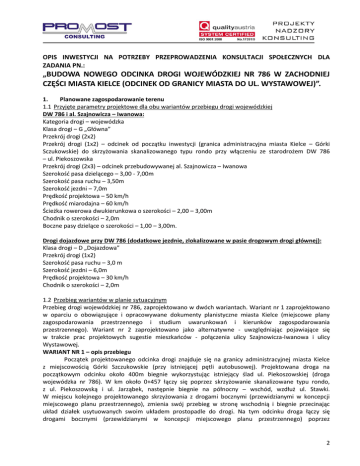 OPIS INWESTYCJI NA POTRZEBY PRZEPROWADZENIA KONSULTACJI SPOŁECZNYCH DLA ZADANIA PN.: „BUDOWA NOWEGO ODCINKA DROGI WOJEWÓDZKIEJ NR 786 W ZACHODNIEJ CZĘŚCI MIASTA KIELCE (ODCINEK OD GRANICY MIASTA DO UL. WYSTAWOWEJ)”. 1. Planowane zagospodarowanie terenu 1.1 Przyjęte parametry projektowe dla obu wariantów przebiegu drogi wojewódzkiej DW 786 i al. Szajnowicza – Iwanowa: Kategoria drogi – wojewódzka Klasa drogi – G „Główna” Przekrój drogi (2x2) Przekrój drogi (1x2) – odcinek od początku inwestycji (granica administracyjna miasta Kielce – Górki Sczukowskie) do skrzyżowania skanalizowanego typu rondo przy włączeniu ze starodrożem DW 786 – ul. Piekoszowska Przekrój drogi (2x3) – odcinek przebudowywanej al. Szajnowicza – Iwanowa Szerokość pasa dzielącego – 3,00 - 7,00m Szerokość pasa ruchu – 3,50m Szerokość jezdni – 7,0m Prędkość projektowa – 50 km/h Prędkość miarodajna – 60 km/h Ścieżka rowerowa dwukierunkowa o szerokości – 2,00 – 3,00m Chodnik o szerokości – 2,0m Boczne pasy dzielące o szerokości – 1,00 – 3,00m. Drogi dojazdowe przy DW 786 (dodatkowe jezdnie, zlokalizowane w pasie drogowym drogi głównej): Klasa drogi – D „Dojazdowa” Przekrój drogi (1x2) Szerokość pasa ruchu – 3,0 m Szerokość jezdni – 6,0m Prędkość projektowa – 30 km/h Chodnik o szerokości – 2,0m 1.2 Przebieg wariantów w planie sytuacyjnym Przebieg drogi wojewódzkiej nr 786, zaprojektowano w dwóch wariantach. Wariant nr 1 zaprojektowano w oparciu o obowiązujące i opracowywane dokumenty planistyczne miasta Kielce (miejscowe plany zagospodarowania przestrzennego i studium uwarunkowań i kierunków zagospodarowania przestrzennego). Wariant nr 2 zaprojektowano jako alternatywne - uwzględniając pojawiające się w trakcie prac projektowych sugestie mieszkańców - połączenia ulicy Szajnowicza-Iwanowa i ulicy Wystawowej. WARIANT NR 1 – opis przebiegu Początek projektowanego odcinka drogi znajduje się na granicy administracyjnej miasta Kielce z miejscowością Górki Szczukowskie (przy istniejącej pętli autobusowej). Projektowana droga na początkowym odcinku około 400m biegnie wykorzystując istniejący ślad ul. Piekoszowskiej (droga wojewódzka nr 786). W km około 0+457 łączy się poprzez skrzyżowanie skanalizowane typu rondo, z ul. Piekoszowską i ul. Jarząbek, następnie biegnie na północny – wschód, wzdłuż ul. Stawki. W miejscu kolejnego projektowanego skrzyżowania z drogami bocznymi (przewidzianymi w koncepcji miejscowego planu przestrzennego), zmienia swój przebieg w stronę wschodnią i biegnie przecinając układ działek usytuowanych swoim układem prostopadle do drogi. Na tym odcinku droga łączy się drogami bocznymi (przewidzianymi w koncepcji miejscowego planu przestrzennego) poprzez 2 skrzyżowanie. W kolejnym odcinku droga wykorzystuje układ działek i biegnie równolegle do ich granic, a następnie łączy się z ul. Malików. Połączenie nowej drogi i ul. Malików, odbywać się będzie na zasadzie relacji prawoskrętnych. Następnie projektowana droga wykorzystuje istniejący ślad al. Szajnowicza – Iwanowa i poprzez skrzyżowanie zmienia swój kierunek o 900, a następnie biegnie na północ w kierunku istniejących wiaduktów kolejowych. Droga na tym odcinku biegnie wykorzystując korytarz wyznaczony wg. Miejscowego planu zagospodarowania przestrzennego „Malików” w Kielcach zatwierdzonego uchwałą nr 1108/2002. Na tym odcinku droga krzyżuje się poprzez skrzyżowanie z ul. Kaznowskiego i łącznikiem z ul. Malików oraz skrzyżowanie z ul. Kolejarzy i z drogą przewidzianą w miejscowym planie zagospodarowania przestrzennego „Malików”. Na przedmiotowym odcinku zaprojektowano pasy dla autobusów (BUS pasy) oraz pas zieleni izolacyjnej od strony zabudowy wielorodzinnej. Następnie droga wraca na istniejący ślad ul. Malików i biegnie pod wiaduktami kolejowymi. W kolejnym odcinku droga wykorzystuje starodroże ul. Malików i ul. Wystawowej. Na tym odcinku łączy się poprzez skrzyżowanie z ul. Skrajną i z drogą przewidzianą w miejscowym planie zagospodarowania przestrzennego „Kielce Zachód – Obszar Niewachlów II” oraz poprzez nowoprojektowane skrzyżowanie łączące ul. Malików z ul. Batalionów Chłopskich, której przebieg został poprowadzony po południowej stronie kościoła (pierwotnie przebieg ul. Batalionów Chłopskich znajduje się po stronie północnej kościoła) i z drogą przewidzianą w miejscowym planie zagospodarowania przestrzennego „Kielce Zachód – Obszar Niewachlów II”. Wzdłuż ul. Wystawowej droga łączy się poprzez skrzyżowanie z ul. Miedzianą oraz ul. Markowskiego. Odcinek projektowanej drogi kończy się przy istniejącym skrzyżowaniu (rondo) ul. Wystawowej z ul. Kongresową, ul. Kazimierza Smolaka i drogą dojazdową przy DK 74. WARIANT NR 2 – opis przebiegu Przebieg drogi w wariancie nr 2 zaprojektowano jako alternatywny, uwzględniając jak najbardziej korzystne korytarze przebiegu drogi oraz jak najmniejszą ingerencję w istniejące zagospodarowanie terenu. Wariant 2 swoim przebiegiem różni się od wariantu 1 tym, że nowoprojektowany odcinek wzdłuż ul. Malików, zostanie poprowadzony po jej zachodniej stronie za znajdującymi się w jej sąsiedztwie zabudowaniami wzdłuż lini wysokiego napięcia, gdzie obecnie występują grunty rolne. Różnice dotyczą również rozwiązań technicznych na skrzyżowaniach oraz lokalizacji skrzyżowania ul. Malików, Batalionów Chłopskich oraz ul. Wystawowej, gdzie wykorzystano istniejącą lokalizację skrzyżowania. 2. Obsługa terenu przyległego Teren przyległy do projektowanej drogi wojewódzkiej zarówno w wariancie I jak i II będzie prowadzony poprzez skrzyżowania oraz dodatkowe jezdnie (drogi dojazdowe). Zjazdy indywidualne i publiczne z drogi wojewódzkiej występują jedynie w miejscach, w których inna obsługa komunikacyjna nie jest możliwa Zgod