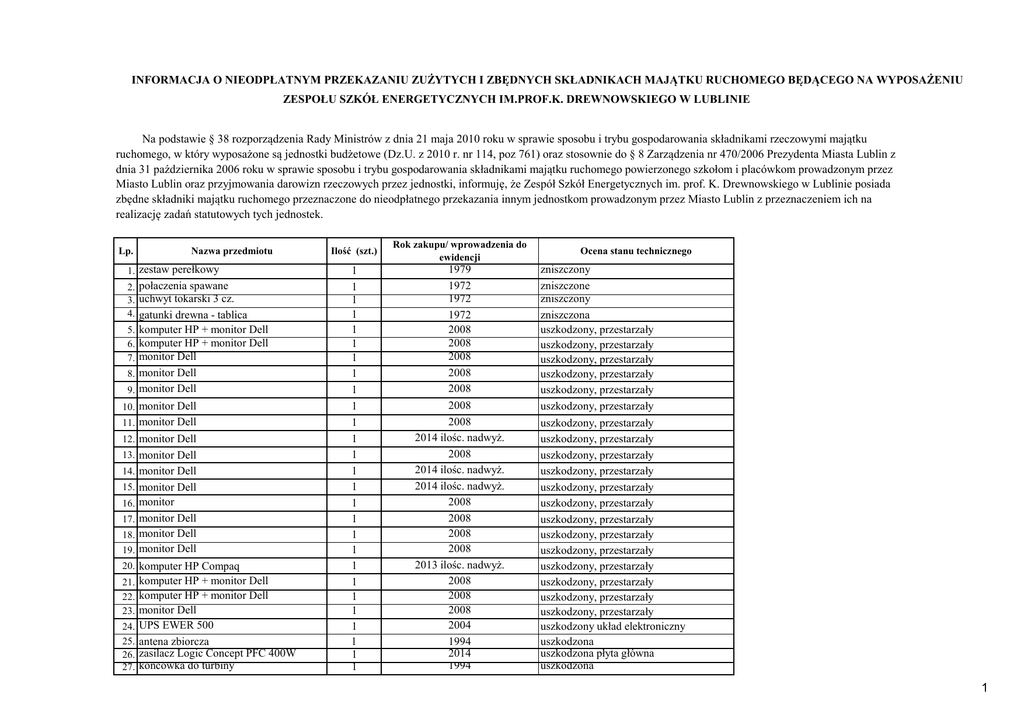 INFORMACJA O NIEODPŁATNYM PRZEKAZANIU ZUŻYTYCH I ZBĘDNYCH SKŁADNIKACH MAJĄTKU RUCHOMEGO BĘDĄCEGO NA WYPOSAŻENIU ZESPOŁU SZKÓŁ ENERGETYCZNYCH IM.PROF.K. DREWNOWSKIEGO W LUBLINIE Na podstawie § 38 rozporządzenia Rady Ministrów z dnia 21 maja 2010 roku w sprawie sposobu i trybu gospodarowania składnikami rzeczowymi majątku ruchomego, w który wyposażone są jednostki budżetowe (Dz.U. z 2010 r. nr 114, poz 761) oraz stosownie do § 8 Zarządzenia nr 470/2006 Prezydenta Miasta Lublin z dnia 31 października 2006 roku w sprawie sposobu i trybu gospodarowania składnikami majątku ruchomego powierzonego szkołom i placówkom prowadzonym przez Miasto Lublin oraz przyjmowania darowizn rzeczowych przez jednostki, informuję, że Zespół Szkół Energetycznych im. prof. K. Drewnowskiego w Lublinie posiada zbędne składniki majątku ruchomego przeznaczone do nieodpłatnego przekazania innym jednostkom prowadzonym przez Miasto Lublin z przeznaczeniem ich na realizację zadań statutowych tych jednostek. Lp. Nazwa przedmiotu 1. zestaw perełkowy 2. połaczenia spawane 3. uchwyt tokarski 3 cz. 4. gatunki drewna - tablica 5. komputer HP + monitor Dell 6. komputer HP + monitor Dell 7. monitor Dell 8. monitor Dell 9. monitor Dell 10. monitor Dell 11. monitor Dell 12. monitor Dell 13. monitor Dell 14. monitor Dell 15. monitor Dell 16. monitor 17. monitor Dell 18. monitor Dell 19. monitor Dell 20. komputer HP Compaq 21. komputer HP + monitor Dell 22. komputer HP + monitor Dell 23. monitor Dell 24. 25. 26. 27. UPS EWER 500 antena zbiorcza zasilacz Logic Concept PFC 400W końcówka do turbiny Ilość (szt.) Rok zakupu/ wprowadzenia do ewidencji 1 1 1 1 1 1 1 1 1 1 1 1 1 1 1 1 1 1 1 1 1 1 1 1 1 1 1 1979 1972 1972 1972 2008 2008 2008 2008 2008 2008 2008 2014 ilośc. nadwyż. 2008 2014 ilośc. nadwyż. 2014 ilośc. nadwyż. 2008 2008 2008 2008 2013 ilośc. nadwyż. 2008 2008 2008 2004 1994 2014 1994 Ocena stanu technicznego zniszczony zniszczone zniszczony zniszczona uszkodzony, przestarzały uszkodzony, przestarzały uszkodzony, przestarzały uszkodzony, przestarzały uszkodzony, przestarzały uszkodzony, przestarzały uszkodzony, przestarzały uszkodzony, przestarzały uszkodzony, przestarzały uszkodzony, przestarzały uszkodzony, przestarzały uszkodzony, przestarzały uszkodzony, przestarzały uszkodzony, przestarzały uszkodzony, przestarzały uszkodzony, przestarzały uszkodzony, przestarzały uszkodzony, przestarzały uszkodzony, przestarzały uszkodzony układ elektroniczny uszkodzona uszkodzona płyta główna uszkodzona 1 28. gablota oszklona 29. komputer AMD 16/256 30. switch SURE COM 10/100 19" 31. gablota - dyplom 32. gablota oszklona 33. gablota mała Toruń 34. gablota na ogłoszenia 35. gablota na ogłoszenia 36. plan ewakuacji 37. prądownica p. poż. 38. regał składany 39. gablota 40. 41. 42. 43. 44. 45. 46. 47. regał składany regał składany miernik cyfrowy 890G amperomierz 25 A mikroamperomierz oscyloskop oscyloskop multimetr KEW1009 1 1 1 1 1 2 2 1 1 3 4 1 1 1 1 1 1 1 1 1 1977 2004 2001 zniszczona uszkodzony, przestarzały uszkodzona płyta główna 1989 1977 1988 1983 1972 1989 2000 1997 1975 1997 1997 1968 1968 1968 1998 2001 1968 zniszczona zniszczona zniszczona zniszczona zniszczona nieaktualny niesprawna zniszczony zniszczona zniszczony zniszczony uszkodzony przetwornik pomiarowy uszkodzony ustrój uszkodzony ustrój uszkodzony zasilacz uszkodzony blok odchylania uszkodzony przetwornik Nieodpłatne przekazanie nastąpi na pisemny wniosek złożony przez zainteresowanego do Dyrektora Zespołu Szkół Energetycznych w Lublinie, zawierający: 1. Nazwę, siedzibę i adres jednostki. 2. Informację o zadaniach publicznych realizowanych przez jednostkę. 3. Wskazanie składnika majątku ruchomego o który występuje jednostka. 4. Wskazanie terminu i miejsca odbioru składników majątku. Przekazanie nastąpi na podstawie protokołu zdawczo- odbiorczego podpisanego przez osoby upoważnione do odbioru. Wnioski należy składać do dnia 13. 05.2015 r. w sekretariacie Zespołu Szkół Energetycznych im. prof. K. Drewnowskiego, ul. Długa 6 w Lublinie. Dyrektor Zespołu Szkół Energetycznych im. prof. K. Drewnowskiego w Lublinie mgr inż. Anna Smolińska 2
