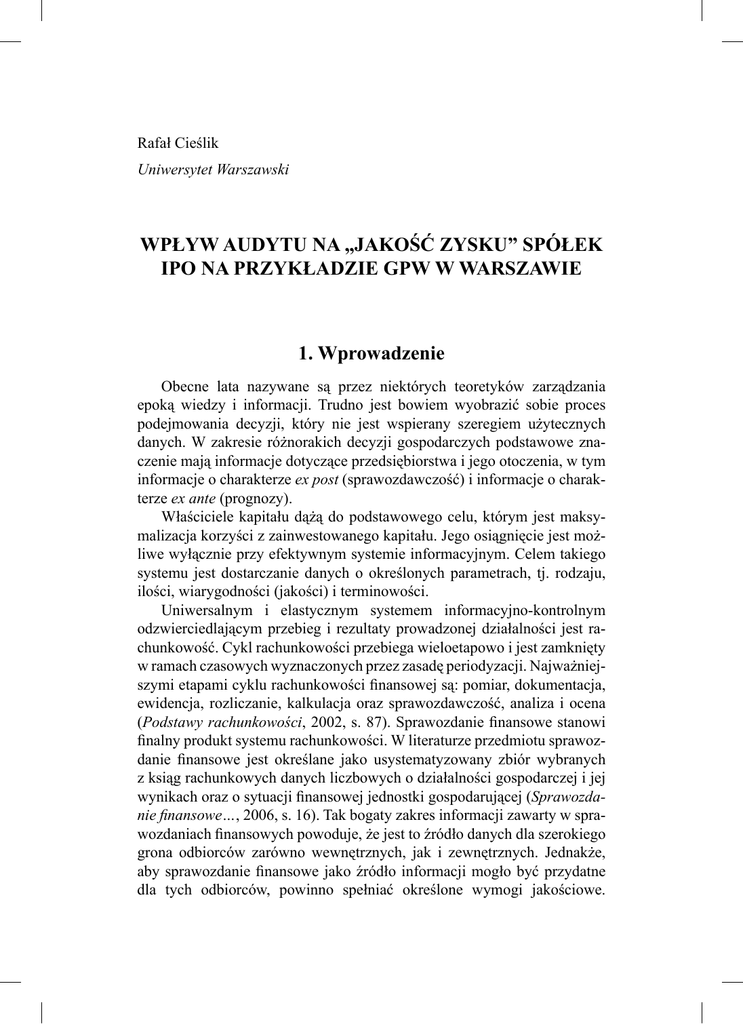 Rafał Cieślik Uniwersytet Warszawski WPŁYW AUDYTU NA „JAKOŚĆ ZYSKU” SPÓŁEK IPO NA PRZYKŁADZIE GPW W WARSZAWIE 1. Wprowadzenie Obecne lata nazywane są przez niektórych teoretyków zarządzania epoką wiedzy i informacji. Trudno jest bowiem wyobrazić sobie proces podejmowania decyzji, który nie jest wspierany szeregiem użytecznych danych. W zakresie różnorakich decyzji gospodarczych podstawowe znaczenie mają informacje dotyczące przedsiębiorstwa i jego otoczenia, w tym informacje o charakterze ex post (sprawozdawczość) i informacje o charakterze ex ante (prognozy). Właściciele kapitału dążą do podstawowego celu, którym jest maksymalizacja korzyści z zainwestowanego kapitału. Jego osiągnięcie jest możliwe wyłącznie przy efektywnym systemie informacyjnym. Celem takiego systemu jest dostarczanie danych o określonych parametrach, tj. rodzaju, ilości, wiarygodności (jakości) i terminowości. Uniwersalnym i elastycznym systemem informacyjno-kontrolnym odzwierciedlającym przebieg i rezultaty prowadzonej działalności jest rachunkowość. Cykl rachunkowości przebiega wieloetapowo i jest zamknięty w ramach czasowych wyznaczonych przez zasadę periodyzacji. Najważniejszymi etapami cyklu rachunkowości finansowej są: pomiar, dokumentacja, ewidencja, rozliczanie, kalkulacja oraz sprawozdawczość, analiza i ocena (Podstawy rachunkowości, 2002, s. 87). Sprawozdanie finansowe stanowi finalny produkt systemu rachunkowości. W literaturze przedmiotu sprawozdanie finansowe jest określane jako usystematyzowany zbiór wybranych z ksiąg rachunkowych danych liczbowych o działalności gospodarczej i jej wynikach oraz o sytuacji finansowej jednostki gospodarującej (Sprawozdanie finansowe…, 2006, s. 16). Tak bogaty zakres informacji zawarty w sprawozdaniach finansowych powoduje, że jest to źródło danych dla szerokiego grona odbiorców zarówno wewnętrznych, jak i zewnętrznych. Jednakże, aby sprawozdanie finansowe jako źródło informacji mogło być przydatne dla tych odbiorców, powinno spełniać określone wymogi jakościowe. 68 Rafał Cieślik Te wymogi są w literaturze określane jako atrybuty informacji finansowej z rachunkowości, które przyczyniają się do zwiększenia jej użyteczności (Hendriksen, van Breda, 2002, s. 140). Orientacja rachunkowości na dostarczanie informacji wielu różnym użytkownikom wymaga zatem przestrzegania w procesie pomiaru, ewidencji, przetwarzania i prezentowania danych nadrzędnych zasad rachunkowości oraz wypracowania i przyjęcia wspólnych reguł i metod określających funkcjonowanie tego systemu. W. Brzezin (1998, s. 23) podkreśla, iż normowanie metod i zasad rachunkowości jest warunkiem jednolitości, a co za tym idzie, także porównywalności informacji dostarczanych przez rachunkowość. Należy jednak stwierdzić, że pomiar dokonywany w rachunkowości nie jest tak jednoznacznie obiektywny, jak np. w naukach ścisłych (matematyka, fizyka). Zgodnie z obowiązującymi przepisami za przygotowanie sprawozdania finansowego odpowiedzialny jest kierownik jednostki, dokonując przy tym wyboru metod i zasad wyceny aktywów i pasywów. Oznacza to, że menedżer zarządzający jednostką ma wpływ na informacje zawarte w raporcie finansowym. Należy jednocześnie pamiętać, że raport finansowy może również wpływać na zarządzających. Informacje w nim zawarte stanowią bowiem sumaryczną ocenę efektywności zarządzania i często decydują o utrzymaniu stanowisk przez członków zarządu. Także system premiowania menedżerów najwyższego szczebla nierzadko uzależniony jest od poziomu osiągniętego zysku. Wszystko to wywiera nacisk na zarządzających do prezentowania w raporcie pozytywnego obrazu przedsiębiorstwa, czasem za cenę intencjonalnej ingerencji w księgi rachunkowe. Motywacja do tego typu praktyk jest tym większa, iż system raportowania finansowego nie daje odbiorcy uprawnień do bezpośredniej (w oparciu o księgi rachunkowe) weryfikacji wiarygodności informacji prezentowanych w udostępnianych publicznie sprawozdaniach finansowych. Wiarygodność muszą zapewnić przewidziane w systemie procedury kontroli zewnętrznej (procedury obiektywnego badania). Obiektywne badanie sprawozdania finansowego bez wątpienia przyczynia się do podniesienia wiarygodności obrazu jednostki prezentowanego w tym sprawozdaniu, a współczesny biegły rewident pełni ważną rolę w procesie poprawy bezpieczeństwa obrotu gospodarczego. Jednakże szereg skandali związanych z manipulacjami danymi sprawozdawczymi, jakie miały miejsce na początku XXI wieku i w ostatnich latach, muszą uświadamiać użytkownikom sprawozdań finansowych fakt, iż istniejący system nadzoru i kontroli nad rachunkowością ma pewne słabości. Wśród nich wskazuje się m.in. to, że standardy rewizji finansowej nie zawsze nadążają za rzeczywistością oraz fakt, że w procesie badania uzyskiwana jest przez biegłego rewidenta tzw. wystarczająca, a nie całkowita pewność z powodu Wpływ audytu na „jakość zysku” spółek IPO na przykładzie GPW… 69 badania metodą wyrywkową, a nie pełną. Dodatkowo wskazuje się na faktyczne ograniczenie niezależności biegłego rewidenta ze względu na silną dodatnią korelację między wydaniem opinii nieprzychylnej jednostce a rezygnacją z usług audytora, co powoduje niechęć do wydawania takich opinii (Gut, 2006) oraz silną konkurencję cenową na rynku usług audytorskich i związany z tym fakt badania sprawozdań przez firmy audytorskie nieposiadające wystarczającego doświadczenia branżowego (brak rozumienia specyfiki sektora, który może wpływać na wnioski z badania), za to oferujące niską cenę usługi. Szczególnie ten ostatni element wzbudza wiele kontrowersji. Zwolennicy tezy o wpływie wielkości firmy audytorskiej na jakość badania wskazują, że tylko duże firmy audytorskie, mające wysoki udział w rynku i wystarczające doświadczenie z