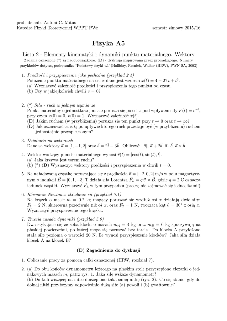 prof. dr hab. Antoni C. Mituś Katedra Fizyki Teoretycznej WPPT PWr semestr zimowy 2015/16 Fizyka A5 Lista 2 - Elementy kinematyki i dynamiki punktu materialnego. Wektory Zadania oznaczone (*) sa, nadobowiazkowe. (D) - dyskusja inspirowana przez prowadzacego. Numery , , przykładów dotycza, podrecznika “Podstawy fizyki t.1”(Halliday, Resnick, Walker (HRW), PWN SA, 2003) , 1. Predkość i przyspieszenie jako pochodne (przykład 2.4) , Położenie punktu materialnego na osi x dane jest wzorem x(t) = 4 − 27 t + t3 . (a) Wyznaczyć zależność predkości i przyspieszenia tego punktu od czasu. , (b) Czy w jakiejkolwiek chwili v = 0? 2. (*) Siła - ruch w jednym wymiarze Punkt materialny o jednostkowej masie porusza sie, po osi x pod wpływem siły F (t) = e−t , przy czym x(0) = 0, v(0) = 1. Wyznaczyć zależność x(t). (D) Jakim ruchem (w przybliżeniu) porusza sie, ten punkt przy t → 0 oraz t → ∞? (D) Jak oszacować czas t0 po upływie którego ruch przestaje być (w przybliżeniu) ruchem jednostajnie przyspieszonym? 3. Działania na wektorach Dane sa, wektory ~a = [1, −1, 2] oraz ~b = 2î − 3k̂. Obliczyć: |~a|, ~a + 2~b, ~a · ~b, ~a × ~b. punktu materialnego wynosi ~r(t) = [cos(t), sin(t), t]. 4. Wektor wodzacy , (a) Jaka krzywa jest torem ruchu? (b) (*) (D) Wyznaczyć wektory predkości i przyspieszenia w chwili t = 0. , 5. Na naładowana, czastk e, poruszajac a, ~v = [−2, 0, 2] m/s w polu magnetycz, , a, sie, z predkości , ~ = [0, 1, −3] T działa siła Lorentza F~L = q ~v × B, ~ gdzie q = 2 C oznacza nym o indukcji B ładunek czastki. Wyznaczyć F~L w tym przypadku (prosze, nie zajmować sie, jednostkami!) , 6. Równanie Newtona: składanie sił (przykład 5.1) Na krażek o masie m = 0.2 kg mogacy poruszać sie, wzdłuż osi x działaja, dwie siły: , , ◦ F1 = 2 N, skierowna przeciwnie niż oś x, oraz F2 = 1 N, tworzaca kat , , θ = 30 z osia, x. Wyznaczyć przyspieszenie tego krażka. , 7. Trzecia zasada dynamiki (przykład 5.9) Dwa stykajace sie, ze soba, klocki o masach mA = 4 kg oraz mB = 6 kg spoczywaja, na , płaskiej powierzchni, po której moga, sie, poruszać bez tarcia. Do klocka A przyłożono stała, siłe, pozioma, o wartości 20 N. Ile wynosi przyspieszenie klocków? Jaka, siła, działa klocek A na klocek B? (D) Zagadnienia do dyskusji 1. Obliczanie pracy za pomoca, całki oznaczonej (HRW, rozdział 7). 2. (a) Do obu końców dynamometru leżacego na płaskim stole przyczepiono cieżarki o jed, , nakowych masach m, patrz rys. 1. Jaka, siłe, wskaże dynamometr? (b) Do kuli wiszacej na nitce doczepiono taka, sama, nitke, (rys. 2). Co sie, stanie, gdy do , dolnej nitki przyłożymy odpowiednio duża, siłe, (a) powoli i (b) gwałtownie? (1) m (2) m Rys. 1 Rys. 3 astr. K F Rys. 2 Z Rys. 4 m m1 m2 A Rys. 6 M Rys. 5 a0