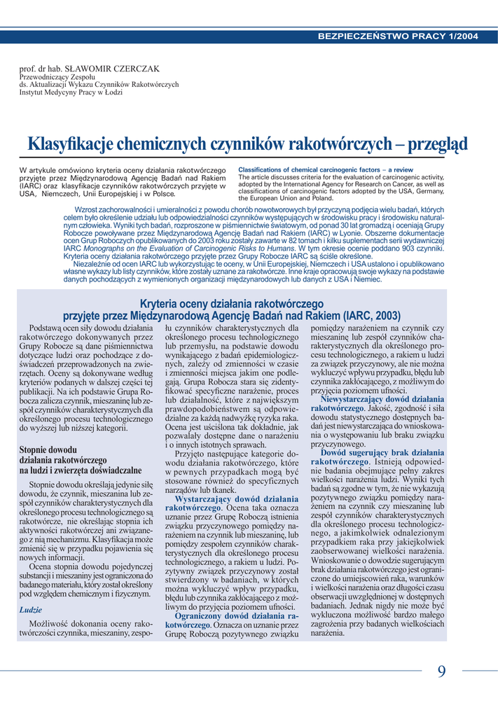 BEZPIECZEŃSTWO PRACY 1/2004 prof. dr hab. SŁAWOMIR CZERCZAK Przewodniczący Zespołu ds. Aktualizacji Wykazu Czynników Rakotwórczych Instytut Medycyny Pracy w Łodzi Klasyfikacje chemicznych czynników rakotwórczych – przegląd W artykule omówiono kryteria oceny działania rakotwórczego przyjęte przez Międzynarodową Agencję Badań nad Rakiem (IARC) oraz klasyfikacje czynników rakotwórczych przyjęte w USA, Niemczech, Unii Europejskiej i w Polsce. Classifications of chemical carcinogenic factors – a review The article discusses criteria for the evaluation of carcinogenic activity, adopted by the International Agency for Research on Cancer, as well as classifications of carcinogenic factors adopted by the USA, Germany, the European Union and Poland. Wzrost zachorowalności i umieralności z powodu chorób nowotworowych był przyczyną podjęcia wielu badań, których celem było określenie udziału lub odpowiedzialności czynników występujących w środowisku pracy i środowisku naturalnym człowieka. Wyniki tych badań, rozproszone w piśmiennictwie światowym, od ponad 30 lat gromadzą i oceniają Grupy Robocze powoływane przez Międzynarodową Agencję Badań nad Rakiem (IARC) w Lyonie. Obszerne dokumentacje ocen Grup Roboczych opublikowanych do 2003 roku zostały zawarte w 82 tomach i kilku suplementach serii wydawniczej IARC Monographs on the Evaluation of Carcinogenic Risks to Humans. W tym okresie ocenie poddano 903 czynniki. Kryteria oceny działania rakotwórczego przyjęte przez Grupy Robocze IARC są ściśle określone. Niezależnie od ocen IARC lub wykorzystując te oceny, w Unii Europejskiej, Niemczech i USA ustalono i opublikowano własne wykazy lub listy czynników, które zostały uznane za rakotwórcze. Inne kraje opracowują swoje wykazy na podstawie danych pochodzących z wymienionych organizacji międzynarodowych lub danych z USA i Niemiec. Kryteria oceny działania rakotwórczego przyjęte przez Międzynarodową Agencję Badań nad Rakiem (IARC, 2003) Podstawą ocen siły dowodu działania rakotwórczego dokonywanych przez Grupy Robocze są dane piśmiennictwa dotyczące ludzi oraz pochodzące z doświadczeń przeprowadzonych na zwierzętach. Oceny są dokonywane według kryteriów podanych w dalszej części tej publikacji. Na ich podstawie Grupa Robocza zalicza czynnik, mieszaninę lub zespół czynników charakterystycznych dla określonego procesu technologicznego do wyższej lub niższej kategorii. Stopnie dowodu działania rakotwórczego na ludzi i zwierzęta doświadczalne Stopnie dowodu określają jedynie siłę dowodu, że czynnik, mieszanina lub zespół czynników charakterystycznych dla określonego procesu technologicznego są rakotwórcze, nie określając stopnia ich aktywności rakotwórczej ani związanego z nią mechanizmu. Klasyfikacja może zmienić się w przypadku pojawienia się nowych informacji. Ocena stopnia dowodu pojedynczej substancji i mieszaniny jest ograniczona do badanego materiału, który został określony pod względem chemicznym i fizycznym. Ludzie Możliwość dokonania oceny rakotwórczości czynnika, mieszaniny, zespo- łu czynników charakterystycznych dla określonego procesu technologicznego lub przemysłu, na podstawie dowodu wynikającego z badań epidemiologicznych, zależy od zmienności w czasie i zmienności miejsca jakim one podlegają. Grupa Robocza stara się zidentyfikować specyficzne narażenie, proces lub działalność, które z największym prawdopodobieństwem są odpowiedzialne za każdą nadwyżkę ryzyka raka. Ocena jest uściślona tak dokładnie, jak pozwalały dostępne dane o narażeniu i o innych istotnych sprawach. Przyjęto następujące kategorie dowodu działania rakotwórczego, które w pewnych przypadkach mogą być stosowane również do specyficznych narządów lub tkanek. Wystarczający dowód działania rakotwórczego. Ocena taka oznacza uznanie przez Grupę Roboczą istnienia związku przyczynowego pomiędzy narażeniem na czynnik lub mieszaninę, lub pomiędzy zespołem czynników charakterystycznych dla określonego procesu technologicznego, a rakiem u ludzi. Pozytywny związek przyczynowy został stwierdzony w badaniach, w których można wykluczyć wpływ przypadku, błędu lub czynnika zakłócającego z możliwym do przyjęcia poziomem ufności. Ograniczony dowód działania rakotwórczego. Oznacza on uznanie przez Grupę Roboczą pozytywnego związku pomiędzy narażeniem na czynnik czy mieszaninę lub zespół czynników charakterystycznych dla określonego procesu technologicznego, a rakiem u ludzi za związek przyczynowy, ale nie można wykluczyć wpływu przypadku, błędu lub czynnika zakłócającego, z możliwym do przyjęcia poziomem ufności. Niewystarczający dowód działania rakotwórczego. Jakość, zgodność i siła dowodu statystycznego dostępnych badań jest niewystarczająca do wnioskowania o występowaniu lub braku związku przyczynowego. Dowód sugerujący brak działania rakotwórczego. Istnieją odpowiednie badania obejmujące pełny zakres wielkości narażenia ludzi. Wyniki tych badań są zgodne w tym, że nie wykazują pozytywnego związku pomiędzy narażeniem na czynnik czy mieszaninę lub zespół czynników charakterystycznych dla określonego procesu technologicznego, a jakimkolwiek odnalezionym przypadkiem raka przy jakiejkolwiek zaobserwowanej wielkości narażenia. Wnioskowanie o dowodzie sugerującym brak działania rakotwórczego jest ograniczone do umiejscowień raka, warunków i wielkości narażenia oraz długości czasu obserwacji uwzględnionej w dostępnych badaniach. Jednak nigdy nie może być wykluczona możliwość bardzo małego zagrożenia przy badanych wielkościach narażenia. 9 BEZPIECZEŃSTWO PRACY 1/2004 Zwierzęta doświadczalne Wystarczający dowód działania rakotwórczego. Ocena taka oznacza uznanie przez Grupę Roboczą istnienia przyczynowego związku pomiędzy narażeniem na czynnik lub mieszaninę, a