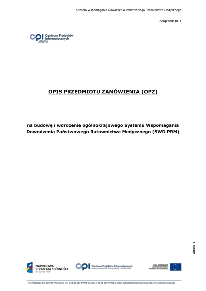 System Wspomagania Dowodzenia Państwowego Ratownictwa Medycznego Załącznik nr 1 OPIS PRZEDMIOTU ZAMÓWIENIA (OPZ) na budowę i wdrożenie ogólnokrajowego Systemu Wspomagania Strona 1 Dowodzenia Państwowego Ratownictwa Medycznego (SWD PRM) System Wspomagania Dowodzenia Państwowego Ratownictwa Medycznego 1. Wstęp Przedsięwzięcie stanowi element projektu pn.: „System Informatyczny Powiadamiania Ratunkowego (SI PR)” którego realizacja podyktowana jest koniecznością wdrożenia jednolitych w skali kraju narzędzi informatycznych wspierających współdziałanie i realizację zadań służb ustawowo powołanych do przyjęcia i obsługi wywołań alarmowych. System ten będzie stanowił główny element wyposażenia Państwowego Ratownictwa Medycznego funkcjonującego w ramach systemu powiadamiania ratunkowego (SPR), o których mowa w rozporządzeniu Ministra Spraw Wewnętrznych i Administracji z dnia 31 lipca 2009 r. w sprawie organizacji i funkcjonowania centrów powiadamiania ratunkowego i wojewódzkich centrów powiadamiania ratunkowego (Dz. U. z 2009 r. Nr 130, poz. 1073), oraz komórek organizacyjnych Policji. Przedmiotowe zamówienie dotyczy realizacji Systemu Wspomagania Dowodzenia Państwowego Ratownictwa Medycznego (SWD PRM) stanowiącego moduł Systemu Informatycznego Powiadamiania Ratunkowego, którego głównym zadaniem jest zapewnienie sprawnej obsługi zdarzeń przekazanych przez Centra Powiadamiania Ratunkowego i Wojewódzkie Centra Powiadamiania Ratunkowego, wsparcie procesu dysponowania siłami i środkami wykorzystywanymi w celach obsługi zdarzeń oraz rozliczeń dokonywanych z Narodowym Funduszem Zdrowia (NFZ). Głównym użytkownikiem SWD PRM będą Dysponenci (dyspozytorzy medyczni) zespołów ratownictwa medycznego oraz SP ZOZ Lotnicze Pogotowie Ratunkowe. W ramach zamówienia zapewniony zostanie uniwersalny interfejs, umożliwiający integrację m.in. z systemami WCPR/ CPR oraz innymi systemami wspomagania dowodzenia PRM i systemami zewnętrznymi służby zdrowia. Zamówienie jest finansowane w ramach przedsięwzięcia pn. ”Budowa i wyposażenie Centrów Powiadamiania Ratunkowego” realizowanego w Programie Operacyjnym Innowacyjna Gospodarka (POIG) Oś priorytetowa VII oraz ”Budowa i wyposażenie Wojewódzkich Centrów Powiadamiania Ratunkowego” realizowanego w Programie Operacyjnym Infrastruktura i Środowisko (POIŚ) Oś priorytetowa XII. 2. Pojęcia i skróty Dla potrzeb niniejszego opracowania przyjmuję się następujące definicje skrótów i pojęć: Skrót/pojęcie Definicja Analiza Dokumentacja sporządzona przez Wykonawcę na podstawie szczegółowej analizy potrzeb Zamawiającego w zakresie wymagań stawianych Systemowi; APL Automatic Person Location – Automatyczna Lokalizacja Osoby; APN (ang. Access Point Name) Sieć pakietowa (np. Internet, intranet operatora) i (opcjonalnie) usługę (np. MMS, WAP, GPRS) dzięki której w sieciach komórkowych GSM i UMTS użytkownik terminala może korzystać z transmisji danych przesyłanych z zewnętrznych sieci (kanał transmisyjny GRE over IP sec); Aplikacja SI WCPR Aplikacja użytkownika Systemu Informatycznego Wojewódzkich Centrów Powiadamiania Ratunkowego; AVL Automatic Vehicle Location – Automatyczna Lokalizacja Pojazdu; Awaria Krytyczna brak działania środowiska produkcyjnego Systemu, praca nie może być kontynuowana, operacja krytyczna dla procesu biznesowego jest niemożliwa. Awarie Krytyczne mają jedną lub więcej z poniższych cech: System Wspomagania Dowodzenia Państwowego Ratownictwa Medycznego Skrót/pojęcie Definicja a) Dane biznesowe zostały uszkodzone; b) Funkcjonalność krytyczna („Funkcjonalność Krytyczna”) udokumentowana w Projekcie Technicznym nie działa; c) System w zakresie Funkcjonalności Krytycznych przerywa działania i nie daje się uruchomić pomimo prób; Awaria Niekrytyczna Utrudnia działanie Systemu w środowisku produkcyjnym w zakresie Funkcjonalności Krytycznej i uniemożliwia działanie Systemu w zakresie pozostałych funkcjonalności. W tym kontekście „utrudnia” oznacza istnienie sposobu jego obejścia (co może mieć wpływ na wygodę w użyciu Systemu lub wymagać procedur ręcznych). „Uniemożliwia” oznacza brak możliwości znalezienia sposobu na jego obejście; Awaria Zwykła Wszelka awaria nie będąca Awarią Krytyczną lub Awarią Niekrytyczną; CPR Centrum Powiadamiania Ratunkowego; Dokumentacja medyczna Książka pracy Pogotowia Ratunkowego, karta zlecenia wyjazdu zespołu PRM ratownictwa medycznego, karta medycznych czynności ratunkowych, karta drogowa, karta medyczna dla potrzeb LPR. Dokumentacja będzie zgodna z rozporządzeniem MZ, gdzie zawarte są jej wzory; Dokumentacja Oznacza dokumentację wykonaną przez Wykonawcę i dostarczoną projektowa Zamawiającemu w ramach realizacji Umowy, podlegająca zatwierdzeniu przez Zamawiającego, materiały w formie papierowej, jak również informacje zapisane na innych nośnikach, w tym nośnikach elektronicznych, w szczególności PZP Dysponent Zakład opieki zdrowotnej, w którego skład wchodzą jednostki systemu Państwowe Ratownictwo Medyczno, podmiot odpowiedzialny za dysponowanie zespołów ratownictwa medycznego. Rolę Dysponenta pełni również SP ZOZ Lotnicze Pogotowie Ratunkowe (Samodzielny Publiczny Zakład Opieki Zdrowotnej Lotnicze Pogotowie Ratunkowe); Dyspozytor Użytkownik realizujący obsługę zgłoszeń przyjętych od Operatora, wykorzystujący system SWD PRM. Rola i zakres działania Dyspozytora jest zdefiniowany w ustawie o Państwowym Ratownictwie Medycznym oraz Rozporządzeniu Ministra Zdrowia w sprawie ramowych procedur przyjmowania wezwań przez dyspozytora medycznego i dysponowania zespołami ratownictwa medycznego; Funkcjonalność Krytyczna Cechy funkcjonalne systemu uniemożliwiające realizację operacji krytycznych z punktu widzenia przyjęcia i obsługi zgłoszeń alarmowych; GPS (ang. Global Positioning System) system nawigacji satelitarnej;