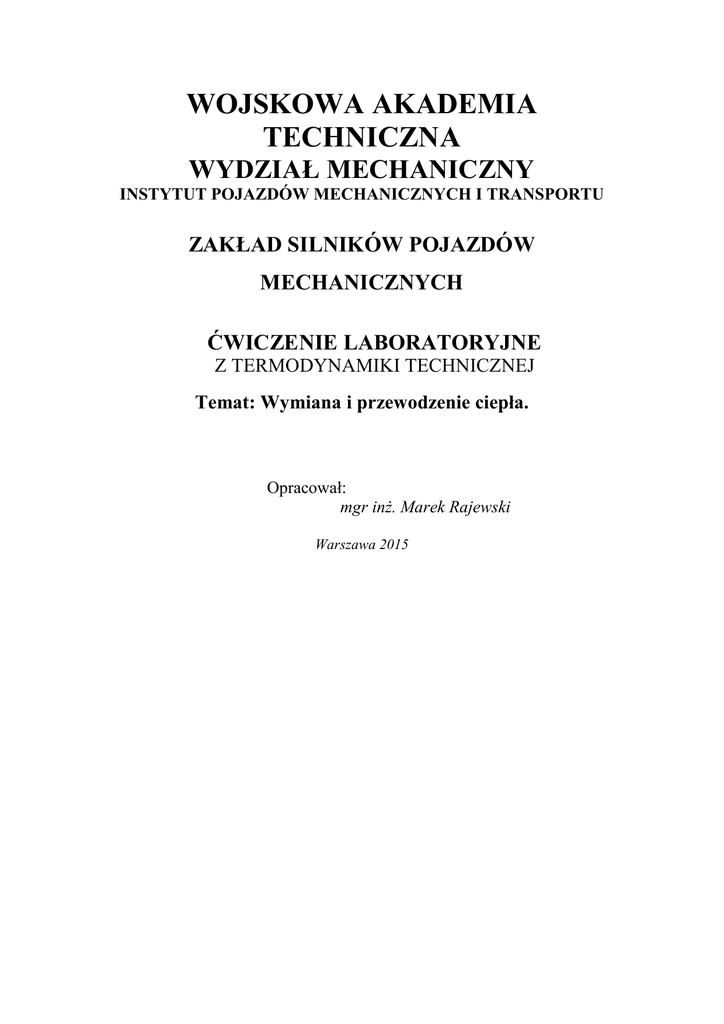 WOJSKOWA AKADEMIA TECHNICZNA WYDZIAŁ MECHANICZNY INSTYTUT POJAZDÓW MECHANICZNYCH I TRANSPORTU ZAKŁAD SILNIKÓW POJAZDÓW MECHANICZNYCH ĆWICZENIE LABORATORYJNE Z TERMODYNAMIKI TECHNICZNEJ Temat: Wymiana i przewodzenie ciepła. Opracował: mgr inż. Marek Rajewski Warszawa 2015 1. POJĘCIA PODSTAWOWE Podstawowym warunkiem wymiany ciepła miedzy ciałami jest różnica temperatur. Wymiana ciepła może następować przez: - przewodzenie, - unoszenie (konwekcję), - promieniowanie. Poza tym istnieją jeszcze złożone przypadki wymiany ciepła, do których zaliczamy: - przejmowanie, - przenikanie. Przewodzenie to wymiana ciepła w obrębie tego samego ciała, najczęściej stałego. Polega ono na tym, że cząstki części ciała o wyższej temperaturze przekazują część ciepła cząstkom o niższej temperaturze. Schemat przewodzenia ciepła przedstawiono na poniższym schemacie: Gęstość strumienia ciepła określamy z prawa Fouriera: T1 q = Q g T2 g λ (T 1 − T 2 ) [W/m2], g Natomiast strumień ciepła przewodzony przez ściankę: Q = λ S (T 1 − T 2 ) [w] g gdzie: T1, T2 – temperatury ścianki [K], g – grubość ścianki [m], S – pole powierzchni ścianki [m2], λ – przewodność cieplna ścianki [W/m K]. Natomiast rozkład temperatury w ściance płaskiej : (T − T 2 ) T ( x) = 1 x + T1 g Przy ustalonym przewodzeniu ciepła przez ściankę cylindryczną stosujemy nastepujące zależności: rozkład temperatury w ściance: (T − T 2 ) r T (r) = 1 ln + T2 r1 r2 ln r2 strumień ciepła przewodzonego przez ściankę: (T − T 2 ) Q = 2Π Lλ 1 r ln 2 r1 gęstość strumienia ciepła: (T − T 2 ) Q q = = 2Π λ 1 r L ln 2 r1 gdzie: r1, r2 – promienie ścianki [m], T1, T2 – temperatury ścianki [K], L – długość cylindra [m]. Przejmowanie ciepła zachodzi wtedy, gdy wzdłuż nieruchomej ścianki o pewnej temperaturze przepływa ciecz lub gaz o temperaturze wyższej lub niższej od temperatury ścianki. Ilość ciepła przepływającą w procesie przejmowania obliczamy z zależności Newtona: Q = α S (T 1 − T 2 ) [w] gdzie: T1, T2 – temperatury ścianki oraz cieczy lub gazu [K], S – pole powierzchni ścianki [m2], α – współczynnik przejmowania ciepła [W/m2 K]. Natomiast przenikanie ciepła to zjawisko przechodzenia ciepła od jednego płynu (cieczy lub gazu) do drugiego przez oddzielajacą je ściankę. W przypadku przedstawionym na schemacie wymiana ciepła między środowiskiem A i B odbywa się w trzech etapach: λ g T1 g α2 g T2 A α1 g B Q T3 g T4 g - przejmowanie ciepła przez ściankę od płynu o temperaturze T1, przewodzenie ciepła przez ściankę, przejmowanie ciepła od ścianki przez płyn o temperaturze T4. g 2. PRZEBIEG ĆWICZENIA 2.1. Wyznaczanie rozkładu temperatury w ściankach oraz przewodności cieplnej cieczy Celem ćwiczenia jest zapoznanie ze sposobami wymiany i przepływu ciepła oraz z metodami wyznaczania jego wartości. Ćwiczenie polega na wyznaczeniu parametrów wymiany ciepła w naczyniu cylindrycznym wykonanym z określonego materiału. Do naczynia należy wlać ilość wrzącej wody tak, aby możliwe było zamknięcie go korkiem z zamontowaną termoparą. Przed zalaniem wody należy określić stan wyjściowy poprzez pomiar temperatur ścianki zewnętrznej wody przed wlaniem i otoczenia, wyniki należy wpisać w tabeli 1 protokołu. Następnie, co określony odstęp czasu dokonywać pomiaru temperatury ścianek naczynia wyniki zapisywać w tabeli 1. Na podstawie wyników pomiarów należy wyznaczyć: • rozkład temperatury w ściance naczynia dla wszystkich punktów pomiarowych, • strumień ciepła przewodzonego przez ściankę, • strumień ciepła przejmowanego od ścianki do otoczenia, W obliczeniach przyjąć następujące uproszczenia: - temperatura wewnętrznej ścianki naczynia jest równa temperaturze omywającej ją cieczy, Następnie zamieścić wyniki obliczeń, wykonać wykresy: - rozkładu temperatury w ściance (w funkcji grubości ścianki) dla poszczególnych punktów pomiarowych; - przebieg strumienia ciepła przewodzonego przez ściankę w czasie; - przebieg strumienia ciepła przejmowanego od ścianki do otoczenia w czasie; - własne wnioski i spostrzeżenia. T1 L2 L1 T2 V – gorąca woda d1 d2 Rys. 1. Schemat naczynia do wykonania ćwiczenia. Dane : Cylinder pierwszy: Materiał stal: Mosiądz l1 =100 mm, l2 =1106 mm, d1 =40 mm, d2 =70 mm, Cylinder drugi: Materiał: stal l1 =95 mm, l2 =110 mm, d1 =47 mm, d2 =64 mm, 2.3. Wyznaczanie rozkładu temperatury i przewodności cieplnej różnych materiałów Ćwiczenia polega na określeniu rozkładu temperatury i strumienia ciepła w prętach wykonanych z różnego materiału: stal, miedź i stop aluminium. Schemat układu przedstawiono na rys. 2. Pręt (2) umieszczany jest jednym końcem w elektrycznej nagrzewnicy (1) natomiast drugi koniec jest swobodny w powietrzu. W czasie trwania ćwiczenia należy co określony czas wykonać pomiar temperatury w kolejnych punktach, których rozmieszczenie podano na schemacie. Wyniki pomiaru zamieścić w tabeli 3. Pomiary wykonać kolejno na trzech prętach. 230 Rys. 2. Schemat układu pomiarowego 1- nagrzewnica, 2- pręt pomiarowy, 3- termopara Na podstawie wyników pomiarów określić rozkład temperatury w poszczególnych prętach dla kolejnych faz nagrzewania, temperaturę średnią oraz ilość ciepła dostarczonego do pręta. Wyniki obliczeń zamieścić w tabeli 3. Rozkład temperatury zamieścić na wykresie. 2.4. Wyznaczanie ciepła właściwego ciał stałych. Schemat kalorymetru wykorzystywanego do zajęć przedstawiono na rysunku 1. Naczynie kalorymetryczne 2 umieszczone jest w naczyniu zewnętrznym 1 wykonanym z tworzywa sztucznego. Od góry kalorymetr wraz z naczyniem zewnętrznym zamknięte są pokrywa 3, której dolna cześć wykonana jest z aluminium. Ćwiczenie rozpoczynamy od określenia masy mk kalorymetru wraz z pokrywą i mieszadłem (na wadze laboratoryjnej). Następnie do kalorymetru w