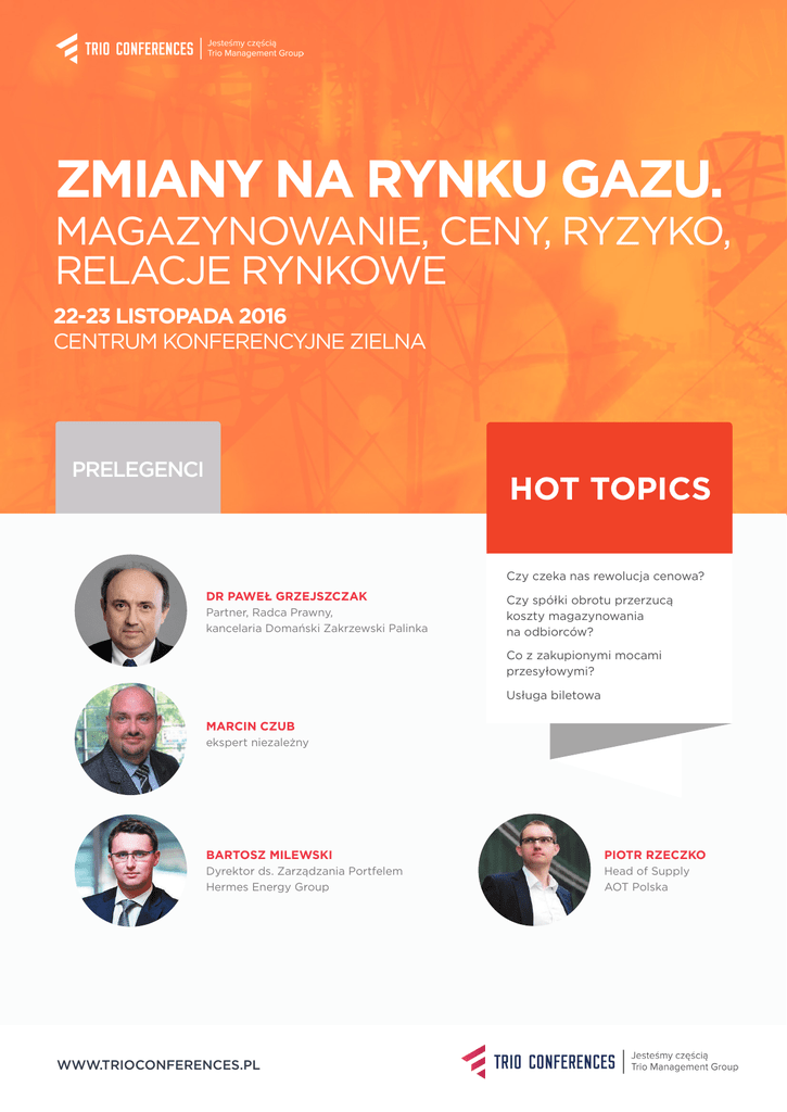 ZMIANY NA RYNKU GAZU. MAGAZYNOWANIE, CENY, RYZYKO, RELACJE RYNKOWE 22-23 LISTOPADA 2016 CENTRUM KONFERENCYJNE ZIELNA PRELEGENCI HOT TOPICS Czy czeka nas rewolucja cenowa? DR PAWEŁ GRZEJSZCZAK Partner, Radca Prawny, kancelaria Domański Zakrzewski Palinka Czy spółki obrotu przerzucą koszty magazynowania na odbiorców? Co z zakupionymi mocami przesyłowymi? Usługa biletowa MARCIN CZUB ekspert niezależny BARTOSZ MILEWSKI PIOTR RZECZKO Dyrektor ds. Zarządzania Portfelem Hermes Energy Group Head of Supply AOT Polska WWW.TRIOCONFERENCES.PL ZMIANY NA RYNKU GAZU. MAGAZYNOWANIE, CENY, RYZYKO, RELACJE RYNKOWE 22-23 LISTOPADA 2016 | CENTRUM KONFERENCYJNE ZIELNA Rewolucyjne, nowe zasady magazynowania gazu zaczną wkrótce obowiązywać. Spowodują one lawinę zmian na rynku. Ich skutki odczują nie tylko bezpośredni beneficjenci nowego obowiązku, spółki sprowadzające gaz z zagranicy, ale praktycznie wszyscy więksi odbiorcy. Jednym z głównych pytań, które zadają sobie uczestnicy rynku, jest bowiem „Co dalej z umowami podpisanymi z alternatywnymi dostawcami gazu?”. Ponadto w programie : • Jak będą kształtować się ceny w obliczu nadchodzących zmian? • Jak będą wyglądać import i tranzyt? • Jak najlepiej przygotować się do nowych obowiązków? • Co z zakupionymi na aukcjach mocami przesyłowymi? • Czy korzystać z usługi biletowej? • Jak skutecznie zarządzać ryzykiem? • Kupować na giełdzie czy na rynku OTC? • Jak polityka zakupowa gazu wygląda w największych firmach produkcyjnych? Warsztaty „Zmiany na rynku gazu” to unikalne na skalę polską wydarzenie, podczas którego wystąpią najbardziej rozpoznawalni eksperci-praktycy, aktywni w ramach sektora gazowego. Warsztatowa formuła umożliwi pełną interakcję z prelegentami podczas wydarzenia. Zachęcamy do uczestnictwa wszystkich tych, którzy odpowiadają w firmach za obrót i zakup gazu, by już dzisiaj mogli się przygotować do nadchodzących zmian i uniknąć negatywnych skutków wprowadzanych regulacji. JUSTYNA KOSTKA Project Manager M. +48 519 407 681 E. [email protected] WWW.TRIOCONFERENCES.PL PRELEGENCI DR PAWEŁ GRZEJSZCZAK | Partner, Radca Prawny, kancelaria Domański Zakrzewski Palinka Specjalista w zakresie prawa energetycznego, transakcji typu project finance, projektów prywatyzacyjnych, fuzji i przejęć oraz projektów restrukturyzacyjnych w energetyce. Partner w Praktyce Infrastruktury i Energetyki kancelarii DZP. Od ponad 20 lat doradza klientom z sektora elektroenergetycznego, ciepłownictwa, branży paliwowej oraz gazowej, we wszystkich aspektach działalności przedsiębiorstw energetycznych, a głównie w kwestiach regulacyjnych i transakcyjnych, realizacji inwestycji, finansowania projektów infrastrukturalnych, kontraktów handlowych, pomocy publicznej oraz zamówień sektorowych. Jest ekspertem w zakresie realizacji projektów inwestycyjnych w obszarze kogeneracji oraz energetyki odnawialnej. Doradca prawny w pierwszym polskim projekcie jądrowym. Zaangażowany w realizację szeregu przedsięwzięć związanych z liberalizacją rynku gazu w Polsce. MARCIN CZUB | ekspert niezależny Marcin Czub posiada bogate doświadczenie na rynku gazu w Polsce i zagranicą. Podczas pracy w Krajowej Dyspozycji Gazu odpowiedzialny za obszar dyspozycji handlowej oraz sterowanie ruchem krajowego systemu przesyłowego oraz polskiego odcinka gazociągu tranzytowego Jamał – Europa Zachodnia jak także bilansowanie, zarządzanie przepustowością, programowanie ruchu i przepisy techniczne oraz zarządzanie Instrukcją Ruchu i Eksploatacji Sieci Przesyłowej. Odpowiedzialny za współpracę operatorską z operatorami sieci gazowych w Niemieczech, Czechach, Białorusi i Ukrainie. Uczestniczył w pracach międzynarodowych grup roboczych w tym w ramach ENTSO-g (Capacity Working Group, Early Warninig System). Absolwent Politechniki Warszawskiej, Wydział Mechaniczny Energetyki i Lotnictwa, specjalność: Mechanika i Budowa Maszyn Energetyki Cieplnej. Od 18 lat związany jest z branżą gazowniczą. BARTOSZ MILEWSKI | Dyrektor ds. Zarządzania Portfelem, Hermes Energy Group Bartosz Milewski jest absolwentem Szkoły Głównej Handlowej w Warszawie na kierunku Ekonomia. Swoją karierę zawodową rozpoczynał w PGNiG S.A. w Departamencie Regulacji, gdzie zajmował się prowadzeniem analiz rynku gazu w Polsce jak również w Europie oraz kalkulacją taryfy m.in. w zakresie magazynowania gazu jak również sprzedaży. W ramach restrukturyzacji GK PGNiG objął stanowisko Kierownika Działu Zarządzania Portfelem Gazu, gdzie był odpowiedzialny za optymalizację kosztów pozyskania gazu przez PGNiG S.A. oraz prowadzenie wyceny kontraktów oferowanych na TGE. Od czerwca 2014 roku objął stanowisko Dyrektora ds. Zarządzania Portfelem w Hermes Energy Group S.A., gdzie zajmuje się optymalizacją kosztu pozyskania gazu na potrzeby Klientów, jak również wdrożeniem kompleksowego systemu IT do zarządzania portfelem i obsługi odbiorców końcowych. PIOTR RZECZKO | Head of Supply, AOT Polska Od lat związany z obrotem gazem. Doświadczenia rynkowe zbierał podczas 5 lat pracy w PGNiG SA, gdzie rozpoczynał jako trader, a następnie kolejno obejmował stanowiska związane z zarządzaniem działalnością operacyjną, aż po pełnienie funkcji zastępcy dyrektora Departamentu Transakcyjnego OOH. Zanim rozpoczął pracę w PGNiG SA, pracował jako trader w firmie OSTC, gdzie odpowiadał za obrót kapitałem firmy na światowych giełdach surowcowych. Posiada doświadczenia w obrocie na giełdach (TGE, Powernext, ICE), jak również na rynkach OTC. Doświadczony w wykorzystaniu arbitrażu i różnic cen pomiędzy poszczególnymi rynkami. Absolwent ekonomiki przedsiębiorstw na Uniwersytecie Europejskim Viadrina we Frankfurcie nad Odrą. Obecnie zatrudniony w AOT Energy Poland, gdzie jest odpowiedzialny za budowę i rozwój funkcji obrotu gazem na rynkach krajowych i zagranicznych. KORNEL KORONOWSKI | Dy