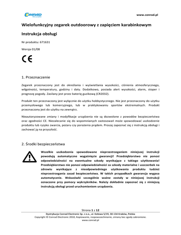 www.conrad.pl Wielofunkcyjny zegarek outdoorowy z zapięciem karabinkowym Instrukcja obsługi Nr produktu: 671631 Wersja 01/08 1. Przeznaczenie Zegarek przeznaczony jest do określania i wyświetlania wysokości, ciśnienia atmosferycznego, wilgotności, temperatury, godziny i daty. Dodatkowo, posiada alert wysokości, alarm, stoper i prognozę pogody. Zasilany jest przez baterię guzikową (CR2032). Produkt ten przeznaczony jest wyłącznie do użytku hobbystycznego. Nie jest przeznaczony do użytku przemysłowego lub komercyjnego, lub w praktykowaniu sportów ekstremalnych. Produkt przeznaczony jest do użytku na zewnątrz. Nieautoryzowane zmiany i modyfikacje urządzenia nie są dozwolone z powodów bezpieczeństwa oraz zgodności CE. Niezalecanie się do wspomnianych zastosowań może spowodować uszkodzenie produktu lub ryzyko zwarcia, pożaru czy porażenia prądem. Proszę zapoznać się z instrukcją obsługi i zachować ją na przyszłość. 2. Środki bezpieczeństwa Wszelkie uszkodzenia spowodowane nieprzestrzeganiem niniejszej instrukcji powodują automatyczne wygaśnięcie gwarancji! Przedsiębiorstwo nie ponosi odpowiedzialności na ewentualne szkody wynikające z takiego użytkowania! Przedsiębiorstwo nie ponosi odpowiedzialności za szkody materialne i uszczerbek na zdrowiu wynikające z nieodpowiedniego użytkowania produktu tudzież nieprzestrzegania zasad bezpieczeństwa. W takich przypadkach gwarancja wygasa automatycznie. Wskazówki szczególnie ważne zostały w niniejszej instrukcji oznaczone przy pomocy wykrzykników. Należy dokładnie zapoznać się z niniejszą instrukcją obsługi przed uruchomieniem urządzenia. Strona 1 z 12 Dystrybucja Conrad Electronic Sp. z o.o., ul. Kołowa 5/19, 30-‐134 Kraków, Polska Copyright © Conrad Electronic 2010, Kopiowanie, rozpowszechnianie, zmiany bez zgody zabronione. www.conrad.pl www.conrad.pl Bezpieczeństwo produktu • Nie poddawaj produktu silnemu naciskowi mechanicznemu. • Chroń produkt przed skrajnymi temperaturami, bezpośrednim słońcem, silnymi wstrząsami, wysoką wilgocią. • Pomimo, że zewnętrzny czujnik jest odporny na pryskanie wodą, nie powinien być zanurzany pod wodę lub narażony na działanie zraszaczy. • Producent nie ponowi odpowiedzialności za niepoprawne wyświetlanie lub konsekwencje z tego wynikające. Bezpieczeństwo osobiste • Użytkowanie produktu nie może rozpraszać uwagi użytkownika od jej/jego bezpośredniego otoczenia. • Produkt nie jest zabawką i nie powinien być trzymany w miejscu łatwo dostępnym dla dzieci lub zwierząt. Bezpieczeństwo baterii • Podczas wkładania baterii należy uważać na oznaczenie biegunowości. • Baterie należy usunąć, jeśli urządzenie nie jest używane przez dłuższych okres czasu. W ten sposób unikniemy wylania się baterii. Uszkodzone i wylane baterie mogą prowadzić do poważnych poparzeń kwasem. Przy kontakcie z uszkodzonymi bateriami zaleca się korzystanie z rękawic ochronnych. • Baterie należy trzymać z dala od dzieci. Baterii nie należy zostawiać w miejscach łatwo dostępnych (dzieci i zwierzęta mogą je połknąć). • Wszystkie baterie należy wymieniać w tym samym czasie. Mieszanie starych i nowych baterii może doprowadzić do wycieku baterii i uszkodzenia urządzenia. • Baterii nie należy rozkładać na czynniki pierwsze, narażać na zwarcie ani wrzucać do ognia. Nie należy podejmować prób ponownego ładowania baterii, które nie są akumulatorkami wielokrotnego użytku. Zachodzi niebezpieczeństwo wybuchu. • Naprawy urządzenia może dokonać tylko wykwalifikowany personel lub odpowiedni serwis. • W razie jakichkolwiek pytań dotyczących urządzenia, na które nie znajdują Państwo odpowiedzi w niniejszej instrukcji, prosimy o kontakt z naszymi konsultantami technicznymi lub innymi ekspertami. Inne Strona 2 z 12 Dystrybucja Conrad Electronic Sp. z o.o., ul. Kołowa 5/19, 30-‐134 Kraków, Polska Copyright © Conrad Electronic 2010, Kopiowanie, rozpowszechnianie, zmiany bez zgody zabronione. www.conrad.pl www.conrad.pl 3. Elementy obsługi 1. Przycisk wysokościomierza 2. Przycisk zegara 3. Przycisk barometru 4. Wyświetlacz 4.1 Sekcja wyświetlacza 1 4.2 Sekcja wyświetlacza 2 4.3 Sekcja wyświetlacza 3 4.4 Sekcja wyświetlacza 4 4.5 Sekcja wyświetlacza 5 5. Przycisk Set 6. Karabinek 4. Objaśnienie symboli 4.1 Sekcja wyświetlacza 1 Tryb wysokościomierza Tryb barometru Alert wysokościomierza włączony Wychodzenie Schodzenie Strona 3 z 12 Dystrybucja Conrad Electronic Sp. z o.o., ul. Kołowa 5/19, 30-‐134 Kraków, Polska Copyright © Conrad Electronic 2010, Kopiowanie, rozpowszechnianie, zmiany bez zgody zabronione. www.conrad.pl www.conrad.pl Jednostka barometru Jednostka barometru Całkowity przyrost / strata wysokości Tryb pamięci Maksymalna zapisana wartość Minimalna zapisana wartość Wyświetlacz graficzny barometru Jednostka wysokościomierza Jednostka wysokościomierza 4.2 Sekcja wyświetlacza 2 • • • • • • 0 H = Obecnie 1 H = Ostatnia 1 godzina 2 H = Ostatnie 2 godziny 3 H = Ostatnie 3 godziny 6 H = Ostatnie 6 godzin 12 H = Ostatnie 12 godzin 4.3 Sekcja wyświetlacza 3 Wilgotność Maksymalna zapisana wartość Temperatura Minimalna zapisana wartość Strona 4 z 12 Dystrybucja Conrad Electronic Sp. z o.o., ul. Kołowa 5/19, 30-‐134 Kraków, Polska Copyright © Conrad Electronic 2010, Kopiowanie, rozpowszechnianie, zmiany bez zgody zabronione. www.conrad.pl www.conrad.pl 4.4 Sekcja wyświetlacza 4 Wskaźnik alarmu Tryb alarmu Symbol niskiego stanu baterii Tryb stopera 4.5 Sekcja wyświetlacza 5 Wskaźnik tendencji ciśnienia Wyświetlacz prognozy pogody 5. Wkładanie baterii Wymień baterię gdy na wyświetlaczu pojawi się ikona niskiego stanu baterii. 1. Otwórz komorę baterii znajdującą się z tyłu zegarka, przekręcając pokrywę w kierunku zgodnym do ruchu wskazówek zegara. 2. Wymień zużytą baterię guzikową CR2032 na nową, zwracając uwa
