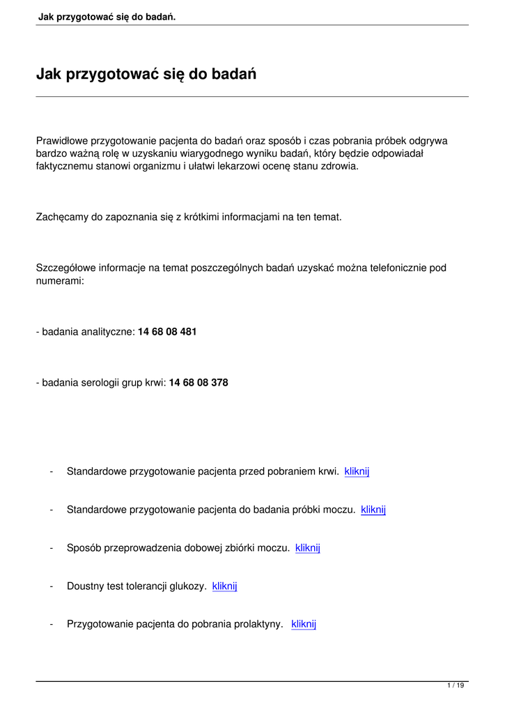Jak przygotować się do badań. Jak przygotować się do badań Prawidłowe przygotowanie pacjenta do badań oraz sposób i czas pobrania próbek odgrywa bardzo ważną rolę w uzyskaniu wiarygodnego wyniku badań, który będzie odpowiadał faktycznemu stanowi organizmu i ułatwi lekarzowi ocenę stanu zdrowia. Zachęcamy do zapoznania się z krótkimi informacjami na ten temat. Szczegółowe informacje na temat poszczególnych badań uzyskać można telefonicznie pod numerami: - badania analityczne: 14 68 08 481 - badania serologii grup krwi: 14 68 08 378 - Standardowe przygotowanie pacjenta przed pobraniem krwi. kliknij - Standardowe przygotowanie pacjenta do badania próbki moczu. kliknij - Sposób przeprowadzenia dobowej zbiórki moczu. kliknij - Doustny test tolerancji glukozy. kliknij - Przygotowanie pacjenta do pobrania prolaktyny. kliknij 1 / 19 Jak przygotować się do badań. - Przygotowanie pacjenta do analizy nasienia. kliknij Przygotowanie pacjenta do wykonania dobowej zbiórki moczu na oznaczenia klirensu kreatyniny z dobowej zbiórki moczu. kliknij - Zasady prawidłowego pobrania kału na wykrywanie pasożytów. kliknij - Przygotowanie pacjenta do wykrywania krwi utajonej w kale. kliknij - Test celofanowy na obecność jaja owsika (instrukcja pobierania wymazu okołoodbytowego). kliknij - Informacja o wykonaniu testu HIV. kliknij - Informacja o wykonaniu IDENTYFIKACYJNEJ KARTY GRUPY KRWI. kliknij STANDARDOWE PRZYGOTOWANIE PACJENTA PRZED POBRANIEM KRWI DO BADAŃ LABORATORYJNYCH. Niezależnie od powodów dla jakich chcemy wykonać badania, do laboratorium przychodzimy rano. Uzasadnia się to faktem, iż wiele parametrów ulega wahaniom dobowym, tj. zmienia się w zależności od pory dnia (nawet o kilkadziesiąt procent). 2 / 19 Jak przygotować się do badań. 1. Krew pobieramy rano między 7:00 a 9:00 godziną. 2. Pacjent powinien być na czczo (12 – 16 godzin po ostatnim posiłku) oraz bez palenia papierosów. 3. Dieta poprzedzająca badanie powinna być standardowa, z wyjątkiem oznaczeń specjalnych wymagających określonych warunków dietetycznych. 4. Wcześniej należy unikać znacznego wysiłku fizycznego. 5. Na minimum 72 godziny przed wykonaniem badania należy odstawić (w miarę możliwości) przyjmowane leki, witaminy i inne preparaty (także ziołowe). 6. Nie należy wykonywać badań jeżeli na 48 godzin przed pobraniem krwi pacjent spożywał znaczne ilości alkoholu. 7. Przed pobraniem materiału do oznaczenia PSA pacjent powinien ograniczyć ucisk okolic gruczołu krokowego (np. przez zaniechanie jazdy na rowerze), zachować wstrzemięźliwość seksualną minimum 3 dni i nie poddawać się zabiegom chirurgicznym czy badaniu per rectum. 8. Podczas pobierania krwi pacjent nie może mieć w ustach pożywienia lub zbędnych przedmiotów. 3 / 19 Jak przygotować się do badań. STANDARDOWE PRZYGOTOWANIE PACJENTA DO BADANIA PRÓBKI MOCZU. Uwagi: - Przed planowanym badaniem moczu nie zaleca się skrajnego ograniczania ani zwiększonego przyjmowania płynów. - Do rutynowego badania moczu zaleca się pobranie pierwszej porannej próbki oddanej bezpośrednio po spoczynku nocnym trwającym ok. 8 godzin (mocz w pęcherzu minimum 4 – 6 godzin). - Przygodna próbka moczu tylko w przypadkach CITO. - Należy unikać znacznych wysiłków fizycznych i długotrwałych marszów. - Przynajmniej dzień przed planowanym oddaniem moczu do badania, należy powstrzymać się od stosunków płciowych. - W przypadku kobiet nie należy wykonywać badania moczu w czasie krwawienia miesięcznego. 1. Oddanie moczu musi być poprzedzone dokładnym umyciem narządów płciowych sąsiadujących z ujściem cewki moczowej, stosując do tego celu wodę oraz czysty ręcznik i unikając środków odkażających. 2. Pobrać mocz ze strumienia środkowego do plastikowego jednorazowego pojemnika zakupionego w aptece. 3. Pojemnik CZYTELNIE opisać imieniem i nazwiskiem i możliwie szybko dostarczyć do laboratorium. 4. Laboratorium nie przyjmuje do badań moczu pobranego do innych niż zalecane pojemników (słoiki, butelki i itp.). 4 / 19 Jak przygotować się do badań. SPOSÓB PRZEPROWADZENIA ZBIÓRKI DOBOWEJ MOCZU 1. Zbiórkę rozpoczyna się po odrzuceniu pierwszej porcji rannej i kończy na pierwszej porannej porcji moczu oddanej w dniu następnym. Rozpoczynamy ją zwykle o godz. 6:00 lub 7:00 dnia pierwszego i kończymy o godz. 6:00 lub 7:00 następnego dnia; 2. Pojemnik zakupiony w aptece, do którego oddaje się mocz, powinien spełniać następujące kryteria: - sterylność, - pojemność 2 000 – 3 000 ml, - średnica otworu przynajmniej 5 cm, - szeroka podstawa, - szczelne zamknięcie, - materiał nie reagujący ze składnikami moczu i nie absorbujący ich (najlepiej plastikowy). 5 / 19 Jak przygotować się do badań. 3. W czasie wykonywania zbiórki, pojemnik z moczem należy przechowywać w temperaturze + 40C (w lodówce). 4. Pojemnik CZYTELNIE opisać imieniem i nazwiskiem i możliwie szybko dostarczyć całość zbiórki dobowej do laboratorium. Uwagi: - Zależnie od rodzaju planowanych oznaczeń możliwe jest stosowanie środków konserwujących, takich jak: tymol, toluen, formalina, kwas solny. - Zbiórkę dobowa moczu na metoksykatecholaminy przeprowadzamy z użyciem 10 ml 6nHCl. Wartość pH zbieranego moczu przesłanego do badania powinna mieścić się w zakresie 2-3. - Jeżeli z jakiejś przyczyny choćby jedna porcja moczu w czasie przeprowadzania zbiórki nie została oddana do pojemnika (pominięta, wylana, itp.), zbiórkę należy przeprowadzić ponownie w innym dniu. DOUSTNY TEST TOLERANCJI GLUKOZY 6 / 19 Jak przygotować się do badań. Doustny test tolerancji glukozy to próba czynnościowa wykonywana w diagnostyce zaburzeń gospodarki węglowodanowej. Pacjent przed przystąpieniem do testu powinien zachować następujące warunki: 1. 3 dni przed wykonaniem testu obowiązuje normalna dieta bez ograniczeń. 2. 3 dni przed testem odstawić w miarę możliwości