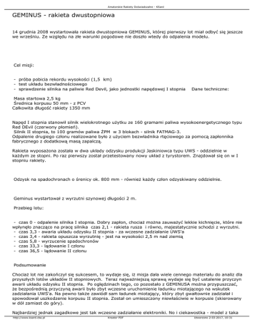 Amatorskie Rakiety Doświadczalne - KSard GEMINUS - rakieta dwustopniowa 14 grudnia 2008 wystartowała rakieta dwustopniowa GEMINUS, której pierwszy lot miał odbyć się jeszcze we wrześniu. Ze względu na złe warunki pogodowe nie doszło wtedy do odpalenia modelu. Cel misji: - próba pobicia rekordu wysokości (1,5 km) - test układu bezwładnościowego - sprawdzenie silnika na paliwie Red Devil, jako jednostki napędowej I stopnia Dane techniczne: Masa startowa 2,5 kg Średnica korpusu 50 mm - z PCV Całkowita długość rakiety 1350 mm Napęd I stopnia stanowił silnik wielokrotnego użytku ze 160 gramami paliwa wysokoenergetycznego typu Red DEvil (czerwony płomień). Silnik II stopnia, to 100 gramów paliwa ŻPM w 3 blokach - silnik FATMAG-3. Odpalenie drugiego członu realizowane było z użyciem bezwładnika rtęciowego za pomocą zapłonnika fabrycznego z dodatkową masą zapalczą. Rakieta wyposażona została w dwa układy odzysku produkcji Jaskiniowca typu UWS - oddzielnie w każdym ze stopni. Po raz pierwszy został przetestowany nowy układ z tyrystorem. Znajdował się on w I stopniu rakiety. Odzysk na spadochronach o śrenicy ok. 800 mm - również każdy człon odzyskiwany oddzielnie. Geminus wystartował z wyrzutni szynowej długości 2 m. Przebieg lotu: - czas 0 - odpalenie silnika I stopnia. Dobry zapłon, chociaż można zauważyć lekkie kichnięcie, które nie wpłynęło znacząco na pracę silnika czas 2,1 - rakieta rusza i równo, majestatycznie schodzi z wyrzutni. - czas 3,3 - awaria układu odzysku II stopnia - za wczesne zadziałanie UWS'a - czas 3,4 - rakieta opuszcza wyrzutnię - jest na wysokości 2,5 m nad ziemią - czas 5,8 - wyrzucenie spadochronów - czas 33,3 - lądowanie I członu - czas 36,5 - lądowanie II członu Podsumowanie Chociaż lot nie zakończył się sukcesem, to wydaje się, iż misja dała wiele cennego materiału do analiz dla przyszłych lotów układów II stopniowych. Teraz najważniejszą sprawą wydaje się być ustalenie przyczyn awarii układu odzysku II stopnia. Po oględzinach tego, co pozostało z GEMINUSA można przypuszczać, że bezpośrednią przyczyną awarii było zbyt wczesne uruchomienie ładunku miotającego na wskutek zadziałania UWS'a. Na pewno także zawiódł sam ładunek miotający, który zbyt gwałtownie zadziałał i spowodował uszkodzenie korpusu II stopnia. Został on umieszczony niewłaściwie w korpusie (skierowany w dół zamiast do góry). Najbardziej jednak zagadkowe jest tak wczesne zadziałanie elektroniki. No i ciekawostka - model z taka http://www.ksard.cba.pl Kreator PDF Utworzono 2-03-2017, 10:31 Amatorskie Rakiety Doświadczalne - KSard wyrwą w burcie kontynuował stabilnie lot! Przyczyna leży być może w stalowej szynie prowadnicy. Film ze startu Analiza - co się wydarzyło? Zapłon - rakieta zaczyna schodzić z wyrzutni. W momencie kiedy UWS II stopnia znalazł się na końcu prowadnicy odpala ładunek miotający II członu. Analiza przyczyn wg Malyro - film Działanie jego jest tak energiczne, że cześć korpusu ulega zniszczeniu. W kadłubie powstaje wyrwa na prawie 1/3 obwodu. Rakieta mimo to kontynuuje lot stabilnie, choć głowica ledwie trzyma się w kadłubie. Nabiera prędkości. Po upływie 2 sekund następuje moment krytyczny lotu. Głowica rakiety odpada od rakiety (przekręca się o 180 stopni w dół), powodując gwałtowny wzrost oporów lotu GEMINUSA. Powodem tego mogła być na przykład lekka zmiana kierunku lotu. Pamiętajmy, że pod głowicą brakuje prawie pół korpusu (patrz zdjęcie poniżej). Jeśli dobrze przypatrzy się na film można zauważyć ten ubytek. Co dzieje się dalej? Głowica wyszarpuje spadochron, co totalnie wyhamowuje rakietę. Uderzenie jest tak potężne, że korpus II stopnia przełamuje się na wysokości silnika, gdzie przyczepiona jest linka nośna spadochronu. W tej samej chwili działa bezwładnik rtęciowy, uruchamiając silnik II stopnia. Silnik I stopnia wciąż pracuje ( widać to wyraźnie na filmie) Hamowanie jest tak duże, iż łoże wraz z silnikiem I stopnia przesuwa się wewnątrz korpusu. Zostają urwane lotki I stopnia przymocowane do łoża, a łoże wypycha spadochron I stopnia (umieszczony bezpośrednio nad silnikiem) oraz moduł z elektroniką. Człony rozdzielają się i w tym momencie zostaje uruchomiony układ UWS I stopnia. Zostaje wyrzucony spadochron. Człony "tańczą" w powietrzu na spadochronach. Na podstawie oryginalnego materiału filmowego z kamery Jaskiniowca bardzo interesująco wygląda klatka, na której widoczne są oba człony rakiety na spadochronach i 3 opadające stateczniki (oznaczone jako 1, 2, 3). Ostateczna Chronologia wydarzeń: 1. czas 0 - start 2. czas 0,2 sek. - zadziałał ładunek miotający II stopnia wyrywając dziurę w kadłubie 3. czas 2,9 sek. - odpada głowica 4. czas 3,3 sek. - pojawia się czarny dym 5. czas 3,7 sek - wyrzucony zostaje spadochron II stopnia 6. czas 3,8 sek - wyrzucony zostaje spadochron I stopnia 7. czas 4,4 sek - odpalenie silnika II stopnia http://www.ksard.cba.pl Kreator PDF Utworzono 2-03-2017, 10:31