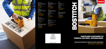 NOWOŚĆ DE AT Bostitch Österreich Stanley Black & Decker Austria GmbH Oberlaaer Strasse 248, 1230 Wien ÖSTERREICH T: +43 1 66 11 66 33 [email protected] www.bostitch.at BE Bostitch Benelux Stanley Black & Decker Belgium BVBA p/a Egide Walschaertsstraat nr. 16 2800 Mechelen BELGIË Tel: +32 15 47 38 00 [email protected] www.stanley-bostitch.be www.stanley-bostitch.nl Bostitch Schweiz Stanley Works (Europe) GmbH Sitz: Dübendorf In der Luberzen 42, 8902 Urdorf SCHWEIZ Tel: +41 (0)44 755 60 70 www.bostitch.ch SK Stanley Black & Decker Czech Republic s.r.o. Türkova 5b, 149 00 Praha 4 - Chodov ČESKÁ REPUBLIKA Tel. +420 602 745440 [email protected] www.bostitch.cz Bostitch Deutschland Stanley Black & Decker Deutschland GmbH Black-&-Decker Str. 40 65510 Idstein DEUTSCHLAND Tel: +49 (0) 6126 21-2985 [email protected] www.stanley-bostitch.de ES PT Stanley Black & Decker Ibérica SLU Parque de Negocios “Mas Blau” Edificio Muntadas C/ Berguedá 08820 El Prat de Llobregat Barcelona, ESPAÑA Tel: +34 93 217 65 02 [email protected] www.bostitch.es Bostitch UK Stanley UK Logistics Centre Gowerton Road Brackmills Industrial Estate Northampton NN4 7BW ENGLAND Tel: +44 (0)870 1 630 630 [email protected] www.bostitch.co.uk IT Stanley Black & Decker Italia S.r.l. Sede Legale: Via Energy Park 6 20871 Vimercate (MB) ITALIA Tel: +39 039 9590.205 Fax: +39 039 9590.312 [email protected] www.bostitch.it FR Bostitch France Stanley Black & Decker France SAS BP No. 90, 112 Avenue Charles de Gaulle 91423 Morangis Cedex FRANCE Tel: +33 0 (1) 69 10 80 41 ou 40 ou 08 [email protected] www.bostitch.fr Stanley Black & Decker Polska Sp. z o.o. Ul. Postępu 21D 02-676 Warszawa POLSKA Tel: +48 22 464 2735 [email protected] www.bostitch.pl JAG-MAR ul. Złota 36 62-800 Kalisz tel. 62 766 31 01 [email protected] www.jag-mar.pl ZAMYKANIE KARTONÓW ZA POMOCĄ ZSZYWEK. GDZIEKOLWIEK. Autoryzowany dystrybutor ZAMYKANIE KARTONÓW ZA POMOCĄ ZSZYWEK. GDZIEKOLWIEK DSA-3519-E / DSA-3522-E NASTĘPNA GENERACJA ZAMYKAREK DO KARTONÓW. Nowy akumulatorowy zszywacz do kartonów firmy Bostitch po raz pierwszy daje użytkownikom prawdziwą mobilność i posiada szereg cech zapewniających świetne osiągi w dowolnym miejscu. BEZPRZEWODOWA ZAMYKARKA DO KARTONÓW SERIA DSA ELASTYCZNE ŁĄCZENIE Dwa modele zszywacza oferują możliwość wbijania zszywek o długości od 15 mm do 22 mm, odpowiednich zarówno do kartonów jedno- jak i dwuwarstwowych. Jesteśmy jednym z największych producentów zszywek na świecie. Dzięki temu masz pewność, że nasze zszywki są najwyższej jakości. Dodatkowy mechanizm zabezpieczający w celu zapewnienia bezpieczeństwa przy pracy Pozycja drugiej ręki to zwiększony komfort i kontrola ZAMYKANIE KARTONÓW ZA POMOCĄ ZSZYWEK. GDZIEKOLWIEK. Li-Ion 2 akumulatory litowo-jonowe są w pełni naładowane już po 45 minutach, a jedno ładowanie akumulatora umożliwia wbicie nawet 800 zszywek. l W pełni przenośny zszywacz do kartonów Regulowany rodzaj zacisku do różnych rodzajów kartonów l Czas ładowania tylko 45 minut l Nawet 800 zszywek po jednym ładowaniu PRACUJ BEZ PRZESTOJÓW W zestawie znajdują się 2 akumulatory litowo-jonowe, a jedno ładowanie akumulatora umożliwia wbicie nawet 800 zszywek. Dzięki temu zarówno na linii produkcyjnej, jak i w terenie możesz pracować bez przestojów przez cały dzień. PRODUKCJA l Zakłady produkcyjne System szybkiego otwierania magazynka w celu łatwego wkładania i usuwania zablokowanych zszywek l Nie ma potrzeby użycia kompresora i przewodów powietrznych l Linie produkcyjne l Drukarnie Szybka zmiana długości zszywek przy pracy z różnymi rodzajami kartonów l Obsługa niewymagająca wysiłku, porównywalna z narzędziami ręcznymi l 2 modele do wbijania zszywek o długości od 15 mm do 22 mm l Regulowana głębokość wbicia zszywki i rodzaj zacisku Wierzymy, że dostarczamy najlepsze narzędzia i łączniki w branży. Kupując produkty firmy Bostitch, możesz polegać na niezrównanej wiedzy, doświadczeniu i pomocy z naszej strony. Nowe, bezprzewodowe zszywacze do kartonów to tylko niektóre produkty z naszej oferty narzędzi do zamykania kartonów i opakowań. Aby dowiedzieć się więcej, skontaktuj się z lokalnym zespołem ds. sprzedaży lub wejdź na stronę internetową: www.bostitch.pl. Gładka podstawa zapewniająca szybsze zszywanie DANE TECHNICZNE Model Waga (bez akumulatora) GAMA ZSZYWEK DSA-3519-E / DSA-3522-E 2.81kg NARZĘDZIA STANLEY BOSTITCH – NASZ SPOSÓB TWORZENIA Waga akumulatora 220g Model akumulatora 9R201498 l Testowane w ekstremalnych temperaturach l Każde narzędzie jest sprawdzane przed zapakowaniem i wysyłką Wibracje w ah/Niepewność pomiaru w K BEZKOMPROMISOWA JAKOŚĆ, TRWAŁOŚĆ I NIEZAWODNOŚĆ. Pojemność magazynka 108 <2.5 m/s2 / 1.25 m/s2 Liczba w pudełku DSA-3519-E DSA-3522-E 1331500Z 15 35 2000 4 - 45 mins 1331800Z 18 35 2000 4 4 10.8V 1332200Z 22 35 2000 - 4 88.6 dB / 3 dB Napięcie ładowania www.bostitch.pl. Szerokość grzbietu mm Poziom hałasu LWA / KWA 9R201515 l Magazynowanie l Składowanie l Firmy kurierskie i spedycyjne l Firmy sprzedaży wysyłkowej Aby uzyskać więcej informacji, wejdź na stronę: Długość mm 77.4 dB / 3 dB Czas ładowania w temp. 20ºc Obydwa modele wykorzystują zszywki typu ‘A’. Model DSA-3519-E jest odpowiedni do wbijania zszywek o długości 15 i 18 mm, a model DSA-3522-E do wbijania zszywek o długości 18 i 22 mm, dzięki czemu stanowi najlepszy wybór do pracy z kartonami dwuwarstwowymi. SKU Poziom hałasu LPA / KPA Model ładowarki DYSTRYBUCJA Łatwa do nastawienia głębokość zszywania do różnych rodzajów tektury PRACA Z DALA OD ZAKŁADU l Firmy przeprowadzkowe l Firmy domowe l Placówki sprzedaży detalicznej www.bostitch.pl