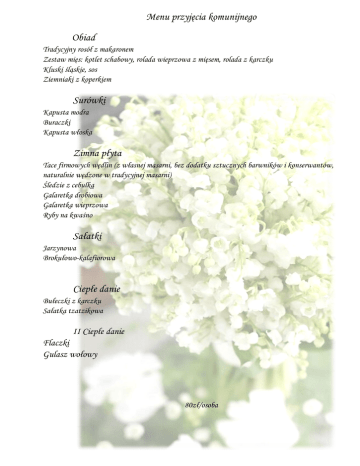 Menu przyjęcia komunijnego Obiad Tradycyjny rosół z makaronem Zestaw mięs: kotlet schabowy, rolada wieprzowa z mięsem, rolada z karczku Kluski śląskie, sos Ziemniaki z koperkiem Surówki Kapusta modra Buraczki Kapusta włoska Zimna płyta Tace firmowych wędlin (z własnej masarni, bez dodatku sztucznych barwników i konserwantów, naturalnie wędzone w tradycyjnej masarni) Śledzie z cebulką Galaretka drobiowa Galaretka wieprzowa Ryby na kwaśno Sałatki Jarzynowa Brokułowo-kalafiorowa Ciepłe danie Bułeczki z karczku Sałatka tzatzikowa II Ciepłe danie Flaczki Gulasz wołowy 80zł/osoba