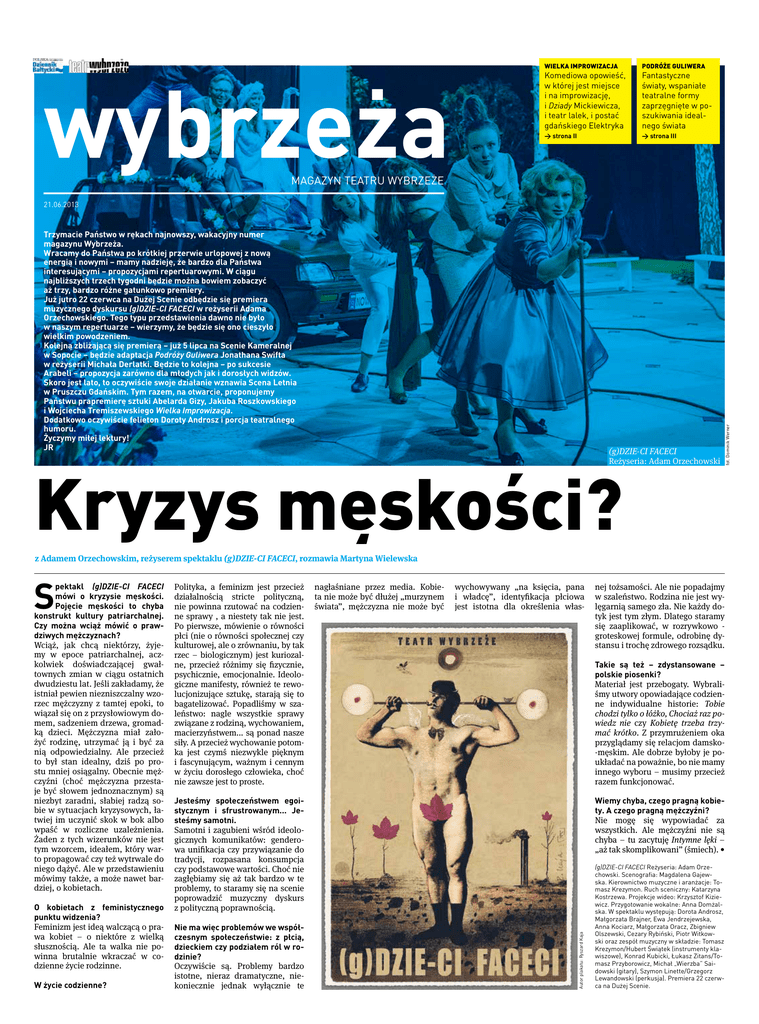 wybrzeża WIELKA IMPROWIZACJA PODRÓŻE GULIWERA Komediowa opowieść, w której jest miejsce i na improwizację, i Dziady Mickiewicza, i teatr lalek, i postać gdańskiego Elektryka Fantastyczne światy, wspaniałe teatralne formy zaprzęgnięte w poszukiwania idealnego świata → strona II → strona III Magazyn Teatru Wybrzeże Trzymacie Państwo w rękach najnowszy, wakacyjny numer magazynu Wybrzeża. Wracamy do Państwa po krótkiej przerwie urlopowej z nową energią i nowymi – mamy nadzieję, że bardzo dla Państwa interesującymi – propozycjami repertuarowymi. W ciągu najbliższych trzech tygodni będzie można bowiem zobaczyć aż trzy, bardzo różne gatunkowo premiery. Już jutro 22 czerwca na Dużej Scenie odbędzie się premiera muzycznego dyskursu (g)DZIE-CI FACECI w reżyserii Adama Orzechowskiego. Tego typu przedstawienia dawno nie było w naszym repertuarze – wierzymy, że będzie się ono cieszyło wielkim powodzeniem. Kolejną zbliżającą się premierą – już 5 lipca na Scenie Kameralnej w Sopocie – będzie adaptacja Podróży Guliwera Jonathana Swifta w reżyserii Michała Derlatki. Będzie to kolejna – po sukcesie Arabeli – propozycja zarówno dla młodych jak i dorosłych widzów. Skoro jest lato, to oczywiście swoje działanie wznawia Scena Letnia w Pruszczu Gdańskim. Tym razem, na otwarcie, proponujemy Państwu prapremierę sztuki Abelarda Gizy, Jakuba Roszkowskiego i Wojciecha Tremiszewskiego Wielka Improwizacja. Dodatkowo oczywiście felieton Doroty Androsz i porcja teatralnego humoru. Życzymy miłej lektury! JR (g)DZIE-CI FACECI Reżyseria: Adam Orzechowski Kryzys męskości? fot. Dominik Werner 21.06.2013 z Adamem Orzechowskim, reżyserem spektaklu (g)DZIE-CI FACECI, rozmawia Martyna Wielewska O kobietach z feministycznego punktu widzenia? Feminizm jest ideą walczącą o prawa kobiet – o niektóre z wielką słusznością. Ale ta walka nie powinna brutalnie wkraczać w codzienne życie rodzinne. W życie codzienne? Polityka, a feminizm jest przecież działalnością stricte polityczną, nie powinna rzutować na codzienne sprawy , a niestety tak nie jest. Po pierwsze, mówienie o równości płci (nie o równości społecznej czy kulturowej, ale o zrównaniu, by tak rzec – biologicznym) jest kuriozalne, przecież różnimy się fizycznie, psychicznie, emocjonalnie. Ideologiczne manifesty, również te rewolucjonizujące sztukę, starają się to bagatelizować. Popadliśmy w szaleństwo: nagle wszystkie sprawy związane z rodziną, wychowaniem, macierzyństwem... są ponad nasze siły. A przecież wychowanie potomka jest czymś niezwykle pięknym i fascynującym, ważnym i cennym w życiu dorosłego człowieka, choć nie zawsze jest to proste. nagłaśniane przez media. Kobieta nie może być dłużej „murzynem świata”, mężczyzna nie może być wychowywany „na księcia, pana i władcę”, identyfikacja płciowa jest istotna dla określenia włas- Jesteśmy społeczeństwem egoistycznym i sfrustrowanym... Jesteśmy samotni. Samotni i zagubieni wśród ideologicznych komunikatów: genderowa unifikacja czy przywiązanie do tradycji, rozpasana konsumpcja czy podstawowe wartości. Choć nie zagłębiamy się aż tak bardzo w te problemy, to staramy się na scenie poprowadzić muzyczny dyskurs z polityczną poprawnością. Nie ma więc problemów we współczesnym społeczeństwie: z płcią, dzieckiem czy podziałem ról w rodzinie? Oczywiście są. Problemy bardzo istotne, nieraz dramatyczne, niekoniecznie jednak wyłącznie te nej tożsamości. Ale nie popadajmy w szaleństwo. Rodzina nie jest wylęgarnią samego zła. Nie każdy dotyk jest tym złym. Dlatego staramy się zaaplikować, w rozrywkowo groteskowej formule, odrobinę dystansu i trochę zdrowego rozsądku. Takie są też – zdystansowane – polskie piosenki? Materiał jest przebogaty. Wybraliśmy utwory opowiadające codzienne indywidualne historie: Tobie chodzi tylko o łóżko, Chociaż raz powiedz nie czy Kobietę trzeba trzymać krótko. Z przymrużeniem oka przyglądamy się relacjom damsko-męskim. Ale dobrze byłoby je poukładać na poważnie, bo nie mamy innego wyboru – musimy przecież razem funkcjonować. Wiemy chyba, czego pragną kobiety. A czego pragną mężczyźni? Nie mogę się wypowiadać za wszystkich. Ale mężczyźni nie są chyba – tu zacytuję Intymne lęki – „aż tak skomplikowani” (śmiech). • Autor plakatu: Ryszard Kaja S pektakl (g)DZIE-CI FACECI mówi o kryzysie męskości. Pojęcie męskości to chyba konstrukt kultury patriarchalnej. Czy można wciąż mówić o prawdziwych mężczyznach? Wciąż, jak chcą niektórzy, żyjemy w epoce patriarchalnej, aczkolwiek doświadczającej gwałtownych zmian w ciągu ostatnich dwudziestu lat. Jeśli zakładamy, że istniał pewien niezniszczalny wzorzec mężczyzny z tamtej epoki, to wiązał się on z przysłowiowym domem, sadzeniem drzewa, gromadką dzieci. Mężczyzna miał założyć rodzinę, utrzymać ją i być za nią odpowiedzialny. Ale przecież to był stan idealny, dziś po prostu mniej osiągalny. Obecnie mężczyźni (choć mężczyzna przestaje być słowem jednoznacznym) są niezbyt zaradni, słabiej radzą sobie w sytuacjach kryzysowych, łatwiej im uczynić skok w bok albo wpaść w rozliczne uzależnienia. Żaden z tych wizerunków nie jest tym wzorcem, ideałem, który warto propagować czy też wytrwale do niego dążyć. Ale w przedstawieniu mówimy także, a może nawet bardziej, o kobietach. (g)DZIE-CI FACECI Reżyseria: Adam Orzechowski. Scenografia: Magdalena Gajewska. Kierownictwo muzyczne i aranżacje: Tomasz Krezymon. Ruch sceniczny: Katarzyna Kostrzewa. Projekcje wideo: Krzysztof Kiziewicz. Przygotowanie wokalne: Anna Domżalska. W spektaklu występują: Dorota Androsz, Małgorzata Brajner, Ewa Jendrzejewska, Anna Kociarz, Małgorzata Oracz, Zbigniew Olszewski, Cezary Rybiński, Piotr Witkowski oraz zespół muzyczny w składzie: Tomasz Krezymon/Hubert