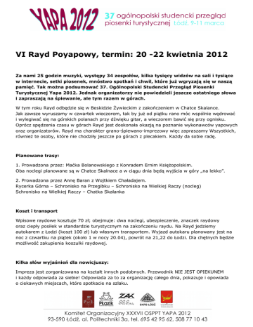 VI Rayd Poyapowy, termin: 20 -22 kwietnia 2012 Za nami 25 godzin muzyki, występy 34 zespołów, kilka tysięcy widzów na sali i tysiące w internecie, setki piosenek, mnóstwo spotkań i chwil, które już wgryzają się w naszą pamięć. Tak można podsumować 37. Ogólnopolski Studencki Przegląd Piosenki Turystycznej Yapa 2012. Jednak organizatorzy nie powiedzieli jeszcze ostatniego słowa i zapraszają na śpiewanie, ale tym razem w górach. W tym roku Rayd odbędzie się w Beskidzie Żywieckim z zakończeniem w Chatce Skalance. Jak zawsze wyruszamy w czwartek wieczorem, tak by już od piątku rano móc wspólnie wędrować i wylegiwać się na górskich polanach przy dźwięku gitar, a wieczorem bawić się przy ognisku. Oprócz spędzenia czasu w górach Rayd jest doskonała okazją na poznanie wykonawców yapowych oraz organizatorów. Rayd ma charakter grano-śpiewano-imprezowy więc zapraszamy Wszystkich, również te osoby, które nie chodziły jeszcze po górach z plecakiem. Każdy da sobie radę. Planowane trasy: 1. Prowadzona przez: Maćka Bolanowskiego z Konradem Ernim Księżopolskim. Oba noclegi planowane są w Chatce Skalnace a w ciągu dnia będą wyjścia w góry „na lekko”. 2. Prowadzona przez Annę Baran z Wojtkiem Chaładajem. Rycerka Górna – Schronisko na Przegibku – Schronisko na Wielkiej Raczy (nocleg) Schronisko na Wielkiej Raczy – Chatka Skalanka Koszt i transport Wpisowe raydowe kosztuje 70 zł; obejmuje: dwa noclegi, ubezpieczenie, znaczek raydowy oraz ciepły posiłek w standardzie turystycznym na zakończeniu raydu. Na Rayd jedziemy autokarem z Łodzi (koszt 100 zł) lub własnym transportem. Wyjazd autokaru planowany jest na noc z czwartku na piątek (około 1 w nocy 20.04), powrót na 21,22 do Łodzi. Dla chętnych będzie możliwość zakupienia koszulki raydowej. Kilka słów wyjaśnień dla nowicjuszy: Impreza jest zorganizowana na kształt innych podobnych. Przewodnik NIE JEST OPIEKUNEM i każdy odpowiada za siebie! Odpowiada za to za organizację całego dnia, pokazuje i opowiada o ciekawych miejscach, które spotkacie na szlaku. Chodzimy po górach od rana do późnego popołudnia z przerwami na jedzenie, podziwianie widoków, odpoczynek i wspólne śpiewogranie. Wieczorem wspólnie przygotowujemy gorący posiłek z zakupionych wcześniej produktów. Po ciepłej kolacji jest ognisko, gitara i śpiewy. Pierwszy nocleg w piątek każda grupa spędza w innym miejscu, w zależności od wyznaczonej trasy. W sobotę spotykamy się przy wspólnym ognisku na zakończeniu Raydu. Regulamin znajduje się tutaj Co ze sobą zabrać? Oto niezbędnik Raydowicza: Plecak – wygodny, najlepiej z pasem biodrowym, tak żeby nam się wszystko do niego zmieściło (tak około 60 l), nie przesadzajmy z wagą po spakowaniu, bo będziemy go nosić na plecach przez trzy dni. Śpiwór – ciepły, bo w połowie kwietnia w górach mogą wystąpić przymrozki Karimata Wygodne wysokie buty – najlepiej ze skóry, powinny być trochę rozchodzone, aby uniknąć otarć. Drugie buty na zmianę – sandały lub trampki Ciepły polar lub sweter Kurtka nieprzemakalna – jeśli nie posiadamy takowej to foliowa pelerynka Kubek, łyżka, nóż Latarka – najlepiej „czołówka” Skarpety – kilka par, do chodzenia i na zmianę Szczoteczkę do zębów, ręcznik, kawałek mydła – tylko brudasy się myją Jedzenie: Weźcie ze sobą suchy prowiant na kanapki, np. kiełbasę (suchą, kabanosy itp.), sery żółte lub do smarowania, mile widziane dżemy, smalec własnej roboty i co tylko wam przyjdzie do głowy. Przydadzą się czekolady, ciastka w każdej ilości oraz inne frykasy itp. Na jedzenie „obiadowe” w piątek w standardach turystycznych tzw. glumza wg fantazji przewodnika i uczestników (będzie niewielka zrzutka). Na zakończeniu każdy uczestnik Raydu dostanie ciepły posiłek. Wszelkie pytania prosimy kierować na adres [email protected] Wszystkich zainteresowanych prosimy o wypełnienie formularza zgłoszeniowego, który znajduje się na strone www.yapa.art.pl . Z turystycznym pozdrowieniem, Marta Pokorska Public Relations OSPPT YAPA 2012 (48) 503 998 498 [email protected] yapa.art.pl