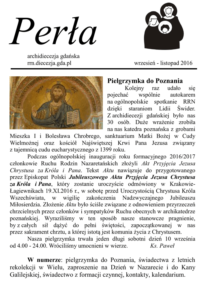 Perła archidiecezja gdańska rrn.diecezja.gda.pl wrzesień - listopad 2016 Pielgrzymka do Poznania Kolejny raz udało się pojechać wspólnie autokarem na ogólnopolskie spotkanie RRN dzięki staraniom Lidii Świder. Z archidiecezji gdańskiej było nas 30 osób. Duże wrażenie zrobiła na nas katedra poznańska z grobami Mieszka I i Bolesława Chrobrego, sanktuarium Matki Bożej w Cudy Wielmożnej oraz kościół Najświętszej Krwi Pana Jezusa związany z tajemnicą cudu eucharystycznego z 1399 roku. Podczas ogólnopolskiej inauguracji roku formacyjnego 2016/2017 członkowie Ruchu Rodzin Nazaretańskich złożyli Akt Przyjęcia Jezusa Chrystusa za Króla i Pana. Tekst Aktu nawiązuje do przygotowanego przez Episkopat Polski Jubileuszowego Aktu Przyjęcia Jezusa Chrystusa za Króla i Pana, który zostanie uroczyście odmówiony w KrakowieŁagiewnikach 19.XI.2016 r., w sobotę przed Uroczystością Chrystusa Króla Wszechświata, w wigilię zakończenia Nadzwyczajnego Jubileuszu Miłosierdzia. Złożenie Aktu było ściśle związane z odnowieniem przyrzeczeń chrzcielnych przez członków i sympatyków Ruchu obecnych w archikatedrze poznańskiej. Wyraziliśmy w ten sposób nasze stanowcze pragnienie, by z całych sił dążyć do pełni świętości, zapoczątkowanej w nas przez sakrament chrztu, a której istotą jest komunia życia z Chrystusem. Nasza pielgrzymka trwała jeden długi sobotni dzień 10 września od 4.00 - 24.00. Wróciliśmy umocnieni w wierze. Ks. Paweł W numerze: pielgrzymka do Poznania, świadectwa z letnich rekolekcji w Wielu, zaproszenie na Dzień w Nazarecie i do Kany Galilejskiej, świadectwo z formacji czynnej, kontakty, kalendarium. Rekolekcje RRN we Wielu Świadectwo Eli W dniach od 21 do 28 sierpnia 2016 roku, obywały się rekolekcje RRN w Wielu, w których uczestniczyło ponad 100 osób z kilku diecezji. Najliczniejsza grupa członków i sympatyków RRN przyjechała z archidiecezji gdańskiej, a ponadto z diecezji: toruńskiej, elbląskiej, koszalińsko-kołobrzeskiej i pelplińskiej. Posługę pasterską w tym darowanym od Pana Boga czasie sprawowało kilku księży: ks. Paweł Jakimcio, ks. Piotr Bonin, ks. kan. Sylwester Ćwikliński, ks. kan. Ryszard Półtorak, ks. Andrzej Adamczyk i ks. Dariusz Kowalczyk - moderator krajowy RRN. Tematem przewodnim tegorocznych rekolekcji były słowa „Uczyń serca nasze, wedle serca Twego”. Nieco oderwani od świata zewnętrznego, z wyłączonymi telefonami i bez telewizji próbowaliśmy przybliżać się do tego, co duchowe. Każdy dzień miał swój konkretny rytm. Skoro świt biegaliśmy na poranną medytację, rzucając w locie spojrzenie na spokojną taflę jeziora, w której odbijały się pierwsze promienie słońca. Tematy medytacji były bardzo różne: Bóg mówi w ciszy, Bóg przychodzi przez człowieka, rodzina zakochana w Bogu. Każde rozmyślanie nad słowem Bożym łączyliśmy z konkretnymi postanowieniami na dany dzień. Wszyscy czekaliśmy na konferencje księży rekolekcjonistów, dzięki którym w nowym świetle mogliśmy spojrzeć na siebie, na swoje życie. Bezpośrednio po nauce rekolekcyjnej były grupy dzielenia. Centralnym punktem dnia była Eucharystia. Przed każdą Mszą św. ćwiczyliśmy śpiewanie pieśni eucharystycznych i maryjnych. Po każdej Eucharystii przez kilka godzin trwała cicha adoracja Najświętszego Sakramentu i Serca Jezusowego. Z niej czerpaliśmy siłę, pociechę i wparcie. Mieliśmy też możliwość przystąpienia do sakramentu pokuty i pojednania. Uczestniczyliśmy w nabożeństwie Drogi Krzyżowej na kalwarii wielewskiej. W ostatnim dniu rekolekcji wzięliśmy udział w odpuście w sanktuarium Matki Bożej Pocieszenia pod przewodnictwem ks. bpa Wiesława Śmigiela. Nad zaspokajaniem naszych przyziemnych potrzeb czuwała, jak dobry anioł, animatorka diecezjalna Jadwiga Cofta. Pan Bóg stawiał nas w różnych sytuacjach, tych chcianych i niechcianych, jak np. prowadzenie pogodnego wieczoru. Podczas rekreacji poznawaliśmy nowe osoby i budowaliśmy relacje z nimi, wychodząc poza swoje horyzonty. Często również, odkrywaliśmy swoje ograniczenia i niedoskonałości. Pan Bóg w sobie tylko znany sposób, przemieniał nasze serca za pośrednictwem delikatnego dotyku dłoni Maryi. Nieustannie uczymy się zapraszać Ją do naszego życia. Udział w rekolekcjach z pewnością zaowocuje w uczynkach miłosierdzia, które z nowym zapałem zamierzamy pełnić po powrocie do naszych domów i środowisk. Świadectwo Leszka Rekolekcje przeżywałem, jako animator wspomagający dla dzieci i animator muzyczny. Grupa dziecięca liczyła 20 „sztuk”. Dzieci przyjechały pod opieką babć, rodziców i ks. Sylwestra. Ks. proboszcz zabrał ze swojej parafii w Ryńsku scholę dziewcząt. Dzieci chętnie angażowały się w śpiew, grę na instrumentach, występy teatralne i prowadziły wieczorny różaniec. Animatorki dziecięce Grażyna i Lucyna przygotowały przedstawienie pt. „Mały książę”, które wzruszyło nas „wielkich” swoją prostotą i autentycznością. Dzieci stały się dla nas nauczycielami. Poranna modlitwa nie była łatwym zadaniem dla dzieci, bo tak jak dla dorosłych rozpoczynała się o 7:30. Dzieci spotykały się w białym namiocie. na modlitwie porannej i na naukach o 10.00. Jednym z tematów rekolekcyjnych były uczynki miłosierdzia względem duszy i ciała. Ks. Paweł przypomniał jak je realizować w codziennym życiu. Nie brakowało okazji do modlitwy: Eucharystia, adoracja, udział w drodze krzyżowej. Dzięki spotkaniom z Bogiem pojawiło się pragnienie Jego obecności w każdym dniu. Uczyliśmy się przyjaźni z Bogiem na dobre i złe. Rekolekcje były też okazją do zabawy i sportu. Niektórzy uczyli się gry na gitarze, inni grali w ping-ponga lub w piłkę nożną pod czułym okiem selekcjonera Kazimierza. Był też czas na rekreację dla wszystkich: bieganie, pływanie, kajaki, rower wodny, zbieranie grzybów i ich suszenie