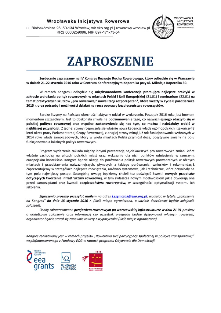 ZAPROSZENIE - Miasta dla Rowerów