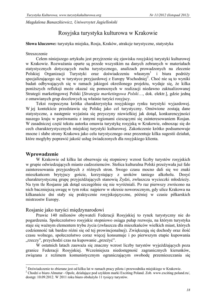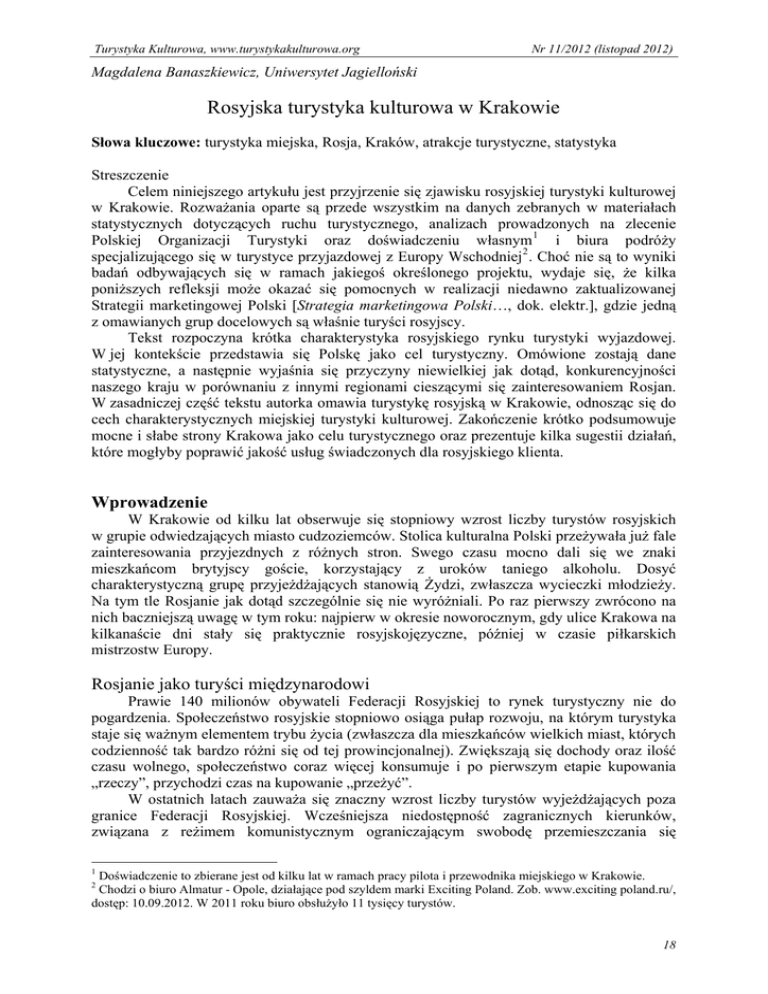 Turystyka Kulturowa, www.turystykakulturowa.org Nr 11/2012 (listopad 2012) Magdalena Banaszkiewicz, Uniwersytet Jagielloński Rosyjska turystyka kulturowa w Krakowie Słowa kluczowe: turystyka miejska, Rosja, Kraków, atrakcje turystyczne, statystyka Streszczenie Celem niniejszego artykułu jest przyjrzenie się zjawisku rosyjskiej turystyki kulturowej w Krakowie. Rozważania oparte są przede wszystkim na danych zebranych w materiałach statystycznych dotyczących ruchu turystycznego, analizach prowadzonych na zlecenie Polskiej Organizacji Turystyki oraz doświadczeniu własnym 1 i biura podróży specjalizującego się w turystyce przyjazdowej z Europy Wschodniej 2 . Choć nie są to wyniki badań odbywających się w ramach jakiegoś określonego projektu, wydaje się, że kilka poniższych refleksji może okazać się pomocnych w realizacji niedawno zaktualizowanej Strategii marketingowej Polski [Strategia marketingowa Polski…, dok. elektr.], gdzie jedną z omawianych grup docelowych są właśnie turyści rosyjscy. Tekst rozpoczyna krótka charakterystyka rosyjskiego rynku turystyki wyjazdowej. W jej kontekście przedstawia się Polskę jako cel turystyczny. Omówione zostają dane statystyczne, a następnie wyjaśnia się przyczyny niewielkiej jak dotąd, konkurencyjności naszego kraju w porównaniu z innymi regionami cieszącymi się zainteresowaniem Rosjan. W zasadniczej część tekstu autorka omawia turystykę rosyjską w Krakowie, odnosząc się do cech charakterystycznych miejskiej turystyki kulturowej. Zakończenie krótko podsumowuje mocne i słabe strony Krakowa jako celu turystycznego oraz prezentuje kilka sugestii działań, które mogłyby poprawić jakość usług świadczonych dla rosyjskiego klienta. Wprowadzenie W Krakowie od kilku lat obserwuje się stopniowy wzrost liczby turystów rosyjskich w grupie odwiedzających miasto cudzoziemców. Stolica kulturalna Polski przeżywała już fale zainteresowania przyjezdnych z różnych stron. Swego czasu mocno dali się we znaki mieszkańcom brytyjscy goście, korzystający z uroków taniego alkoholu. Dosyć charakterystyczną grupę przyjeżdżających stanowią Żydzi, zwłaszcza wycieczki młodzieży. Na tym tle Rosjanie jak dotąd szczególnie się nie wyróżniali. Po raz pierwszy zwrócono na nich baczniejszą uwagę w tym roku: najpierw w okresie noworocznym, gdy ulice Krakowa na kilkanaście dni stały się praktycznie rosyjskojęzyczne, później w czasie piłkarskich mistrzostw Europy. Rosjanie jako turyści międzynarodowi Prawie 140 milionów obywateli Federacji Rosyjskiej to rynek turystyczny nie do pogardzenia. Społeczeństwo rosyjskie stopniowo osiąga pułap rozwoju, na którym turystyka staje się ważnym elementem trybu życia (zwłaszcza dla mieszkańców wielkich miast, których codzienność tak bardzo różni się od tej prowincjonalnej). Zwiększają się dochody oraz ilość czasu wolnego, społeczeństwo coraz więcej konsumuje i po pierwszym etapie kupowania „rzeczy”, przychodzi czas na kupowanie „przeżyć”. W ostatnich latach zauważa się znaczny wzrost liczby turystów wyjeżdżających poza granice Federacji Rosyjskiej. Wcześniejsza niedostępność zagranicznych kierunków, związana z reżimem komunistycznym ograniczającym swobodę przemieszczania się 1 Doświadczenie to zbierane jest od kilku lat w ramach pracy pilota i przewodnika miejskiego w Krakowie. Chodzi o biuro Almatur - Opole, działające pod szyldem marki Exciting Poland. Zob. www.exciting poland.ru/, dostęp: 10.09.2012. W 2011 roku biuro obsłużyło 11 tysięcy turystów. 2 18 Turystyka Kulturowa, www.turystykakulturowa.org Nr 11/2012 (listopad 2012) ludności, wywołała typowy syndrom nowości. Coś, co było do tej pory zarezerwowane dla wąskiej grupy osób, okazało się nareszcie osiągalne, a przez to jeszcze bardziej pożądane. Dla wielu wakacje w Europie równały się z osiągnięciem pewnego statusu społecznego, były swoistym trofeum, którym można się pochwalić przed znajomymi. Zapewne ze względów finansowych zagraniczne wyjazdy póki co nie stały się dla Rosjan zwyczajną praktyką. Zaledwie 17% respondentów posiada paszport zagraniczny 3 . Aż 70% badanych nigdy nie było za granicami dawnego Związku Radzieckiego w celach turystycznych (w sprawach służbowych 78%). 10% jeździło dawniej, dziś już nie podróżuje, 6% wyjeżdża raz na 2-3 lata, raz na rok 4% [70% россиян никогда…, dok. elektr.]. Choć procent turystów wydaje się znikomy, jednak grupa ta zwiększa się z roku na rok. W 2008 roku za granicą było zaledwie 4% badanych. Jako główną przeszkodę wskazywano sytuację finansową. Gdyby nie brak pieniędzy, z możliwości wyjazdu zagranicznego z chęcią skorzystałoby 63% respondentów [Поездки за границу…, dok. elektr.]. Z tego powodu na podróżowanie pozwolić sobie mogą przede wszystkim mieszkańcy wielkich miast: w 2008 roku aż 17% badanych pochodzących z Moskwy było za granicą w celach turystycznych. To ponad czterokrotnie więcej niż średnia krajowa [Поездки за границу…, dok. elektr.]. Niemniej, należy podkreślić, że wzrost zamożności mieszkańców Rosji sprawił, iż wycieczki zagraniczne przestały być symbolem wyjątkowego luksusu. Większa konkurencyjność zagranicznego produktu turystycznego (a więc „lepsze warunki za rozsądne pieniądze”), oznaczała, że rosyjska rodzina mogła za w tej samej cenie wyjechać poza granice kraju, do takich atrakcyjnych miejsc jak Turcja czy Tunezja lub spędzać wakacje na wybrzeżu Morza Czarnego. W ostatnim czasie doszło wręcz do kuriozalnej sytuacji: wczasy w „ciepłych krajach” są dużo tańsze niż pobyt choćby w okolicach Soczi 4 . Jak pokazują najnowsze dane UNWTO Rosja znajduje się na drugim miejscu po Chinach pod względem wzrostu wydatków na podróże zagraniczne (wzrost o 15% względem analogicznego okresu w roku ubiegłym) [UNWT