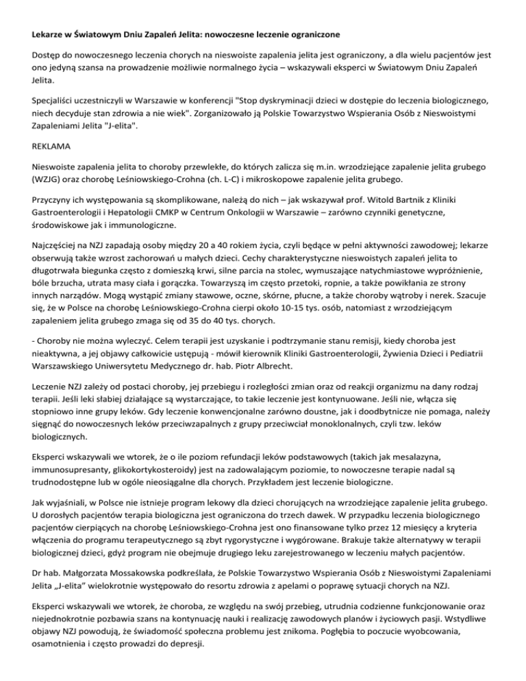 Dostęp do nowoczesnego leczenia chorych na nieswoiste zapalenia jelita jest ograniczony, a dla wielu pacjentów jest