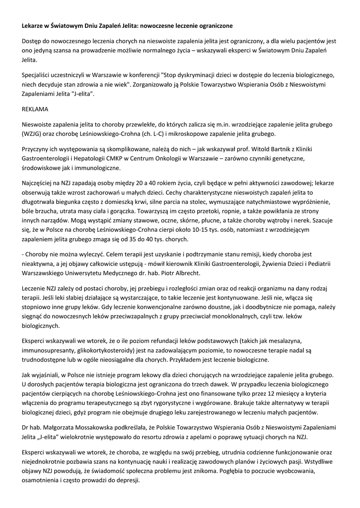 Lekarze w Światowym Dniu Zapaleń Jelita: nowoczesne leczenie ograniczone