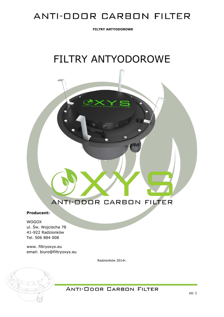 FILTRY ANTYODOROWE FILTRY ANTYODOROWE Producent: WOGOX ul. Św. Wojciecha 78 41-922 Radzionków Tel. 506 884 008 www. filtryoxys.eu email: [email protected] Radzionków 2014r. str. 1 FILTRY ANTYODOROWE filtr podwłazowy filtr wentylacyjny filtr wentylacyjny OXYS 600 OXYS110 OXYS160 Średnica filtra [mm] 580 110 160 Średnica otworu montażowego [mm] 600 110 160 Długość komory filtracyjnej [mm] 260 100 100 Masa wkładu filtracyjnego [kg] 9,5 3,8 6,5 Na indywidualne potrzeby firma WOGOX może zaprojektować i wykonać filtry Antyodorowy o wymiarach żądanych przez klienta, tak by możliwe było dopasowanie się do wszystkich instalacji. Filtry antyodorowe OXYS firmy WOGOX są produktem polskim i są chronione Wzorem Wspólnotowym nr 002507806-0001 na terenie Unii Europejskiej. Wszystkie dane dotyczące tego wzoru zapisane są w Rejestrze Wzorów Wspólnotowych. str. 2 FILTRY ANTYODOROWE Treść dokumentu: ZASTOSOWANIE i OPIS PRODUKTU SPOSÓB MONTAŻU DANE TECHNICZNE EKSPLOATACJA ZASTOSOWANIE i OPIS PRODUKTU Antyodorowe filtry produkowane przez firmę WOGOX znajdują swoje zastosowanie przy kanalizacyjnych, występowaniu w wszelkiego szczególności rodzaju studzienek odorów kanalizacyjnych, przepompowni ścieków i szamb. Głównym celem działania antyodorowych filtrów OXYS jest ograniczenie do minimum skutków uwalniania się substancji chemicznych (zapachowych i bezzapachowych) występujących w sieciach kanalizacyjnych. W związku z bardzo wysokim działaniem absorpcyjnym impregnowanego węgla aktywnego zastosowanego w filtrach firmy WOGOX możliwym jest uzyskanie wysokiego poziomu komfortu życia codziennego. Przyjazny użytkownikowi sposób instalacji i obsługi antyodorowych filtrów OXYS w szybki i bezpieczny sposób umożliwiają uzyskanie wysokiego standardu życia codziennego, niezależnego od sąsiedztwa sieci kanalizacyjnych, Rozwiązują przepompowni problem i oczyszczalni eksploatatorów ścieków zarówno oraz dużych szamb. instalacji kanalizacyjnych, jaki i indywidualnych systemów odprowadzania ścieków str. 3 FILTRY ANTYODOROWE jakimi są odory powstające w trakcie transportu ścieków, ich magazynowania oraz oczyszczania. Oddziaływanie mieszkańców odorów generuje kanalizacyjnych konieczność na codzienne wprowadzania coraz to życie nowych rozwiązań w celu eliminacji tego problemu. Rozwijająca się infrastruktura sieci kanalizacyjnych, przy jednoczesnym rozwoju budownictwa mieszkalnego (zarówno jedno-, jak i wielorodzinnego) stanowią realne zagrożenie związane z pojawiającymi się odorami. Niebezpieczeństwo związane z występowaniem siarkowodorów w odorach kanalizacyjnych obrazuje poniższa tabela: Wpływ zmian stężenia siarkowodoru na reakcje człowieka Stężenie siarkowodoru w powietrzu (ppm) Reakcje człowieka 0,2 Próg wyczuwalności 3–5 Silny zapach 7 Najwyższe dopuszczalne stężenie dla ośmiogodzinnego czasu pracy 10–50 Odczuwalne podrażnienie oczu 50–100 Odczuwalne podrażnienie układu oddechowego 100–200 Kaszel, ból oczu i głowy 300–500 Stałe zagrożenie życia 500–700 Silne podrażnienie systemu nerwowego >700 Natychmiastowe zasłabnięcie z paraliżem oddychania – śmierć Źródło : www.inżynierbudownictwa.pl str. 4 FILTRY ANTYODOROWE Antyodorowe filtry OXYS są urządzeniami w pełni bezobsługowymi, działającymi od pierwszej chwili ich zamontowania. Wykonane zostały z trwałych, odpornych na działanie substancji agresywnych płyt oraz rur PE-HD. Zastosowany materiał gwarantuje sprawne i wieloletnie funkcjonowanie filtrów. GŁÓWNE WYMIARY str. 5 FILTRY ANTYODOROWE SPOSÓB MONTAŻU Antyodorowy filtr podwłazowy OXYS 600 Antyodorowy filtr podwłazowy montowany jest bezpośrednio pod włazem korpusu (Rys. 1.) za pomocą 4 uchwytów montażowych wykonanych ze stali nierdzewnej (Rys. 3.). Uchwyty są fabrycznie przykręcone do górnej części filtra. Po zdjęciu pokrywy wystarczy podnieść filtr za pomocą 2 uchwytów (Rys. 2.) i zawiesić go na obwodzie ramy głównej włazu. Rys. 1. Schemat zamontowania filtra w studzience kanalizacyjnej. Materiały montażowe : - 4x uchwyt mocujący wykonany ze stali nierdzewnej. str. 6 FILTRY ANTYODOROWE Rys. 2. Uchwyty do ręcznego transportu filtra antyodorowego. Rys. 3. Uchwyty montażowe wykonanych ze stali nierdzewnej. str. 7 FILTRY ANTYODOROWE Sposób demontażu: Demontaż antyodorowego filtra podwłazowego przeprowadzany jest poprzez wyjęcie filtra za pomocą uchwytów transportowych przymocowanych do górnej części korpusu filtra (Rys. 4.) Rys. 3. Demontaż filtra antyodorowego poprzez ręczne wyjęcie go ze studzienki kanalizacyjnej. WAŻNE: po dokonaniu kompleksowego montażu antyodorowego filtra OXYS 600 konieczne jest wlanie 0,7 litra wody do syfomu filtra. str. 8 FILTRY ANTYODOROWE Antyodorowe filtry wentylacyjne OXYS110 i OXYS160 Sposób montażu: Antyodorowy filtr kominkowy montowany jest bezpośrednio w otworze wentylacyjnym pokrywy korpusu sanitarnego. Średnica zewnętrzna filtra dostosowana jest do przejścia szczelnego PVC (przejście szczelne tulejowe lub uszczelka). Sposób demontażu: Demontaż antyodorowego filtra podwłazowego przeprowadzany jest poprzez pionowe wyciągnięcie filtra z otworu wentylacyjnego. DANE TECHNICZNE Aktywny węgiel impregnowany Aktywny węgiel impregnowany jest to najwyższej jakości węgiel formowany, produkowany z węgla kamiennego metodą parogazową. Jego powierzchnia modyfikowana jest jodkiem potasu. adsorpcyjną, Charakteryzuje bardzo dobrą się wysoką wytrzymałością zdolnością mechaniczną, dużą pojemnością sorpcyjną. Stanowi bardzo dobry materiał do wypełniania adsorberów. Aktywny węgiel impregnowany jest stosowany m.in. w: biogazowniach do usuwania związków siarki, zwłaszcza H2S z biogazu, różnych procesach dezodoryzacji (np. w procesach fermentacyjnych, str. 9 FILTRY ANTYODOROWE oczyszczalniach ścieków i wielu innych), eliminacji różnych substancji z powietrza i innych gazów, n