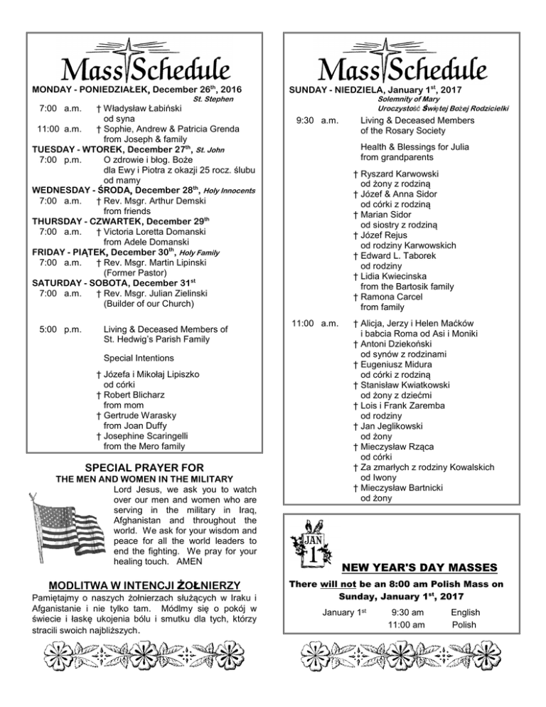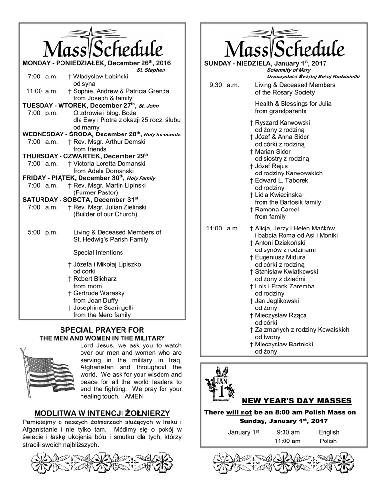 MONDAY - PONIEDZIAŁEK, December 26th, 2016 St. Stephen † Władysław Łabiński od syna 11:00 a.m. † Sophie, Andrew & Patricia Grenda from Joseph & family TUESDAY - WTOREK, December 27th, St. John 7:00 p.m. O zdrowie i błog. Boże dla Ewy i Piotra z okazji 25 rocz. ślubu od mamy WEDNESDAY - ŚRODA, December 28th, Holy Innocents 7:00 a.m. † Rev. Msgr. Arthur Demski from friends THURSDAY - CZWARTEK, December 29th 7:00 a.m. † Victoria Loretta Domanski from Adele Domanski FRIDAY - PIĄTEK, December 30th, Holy Family 7:00 a.m. † Rev. Msgr. Martin Lipinski (Former Pastor) SATURDAY - SOBOTA, December 31st 7:00 a.m. † Rev. Msgr. Julian Zielinski (Builder of our Church) SUNDAY - NIEDZIELA, January 1st, 2017 Solemnity of Mary Uroczystość Świętej Bożej Rodzicielki 7:00 a.m. 5:00 p.m. Living & Deceased Members of St. Hedwig’s Parish Family Special Intentions † Józefa i Mikołaj Lipiszko od córki † Robert Blicharz from mom † Gertrude Warasky from Joan Duffy † Josephine Scaringelli from the Mero family SPECIAL PRAYER FOR THE MEN AND WOMEN IN THE MILITARY Lord Jesus, we ask you to watch over our men and women who are serving in the military in Iraq, Afghanistan and throughout the world. We ask for your wisdom and peace for all the world leaders to end the fighting. We pray for your healing touch. AMEN MODLITWA W INTENCJI ŻOŁNIERZY Pamiętajmy o naszych żołnierzach służących w Iraku i Afganistanie i nie tylko tam. Módlmy się o pokój w świecie i łaskę ukojenia bólu i smutku dla tych, którzy stracili swoich najbliższych. 9:30 a.m. Living & Deceased Members of the Rosary Society Health & Blessings for Julia from grandparents † Ryszard Karwowski od żony z rodziną † Józef & Anna Sidor od córki z rodziną † Marian Sidor od siostry z rodziną † Józef Rejus od rodziny Karwowskich † Edward L. Taborek od rodziny † Lidia Kwiecinska from the Bartosik family † Ramona Carcel from family 11:00 a.m. † Alicja, Jerzy i Helen Maćków i babcia Roma od Asi i Moniki † Antoni Dziekoński od synów z rodzinami † Eugeniusz Midura od córki z rodziną † Stanisław Kwiatkowski od żony z dziećmi † Lois i Frank Zaremba od rodziny † Jan Jeglikowski od żony † Mieczysław Rząca od córki † Za zmarłych z rodziny Kowalskich od Iwony † Mieczysław Bartnicki od żony NEW YEAR'S DAY MASSES There will not be an 8:00 am Polish Mass on Sunday, January 1st, 2017 January 1st 9:30 am 11:00 am English Polish NIEDZIELA NARODZENIA PAŃSKIEGO – Łk 2:1-14: W owym czasie wyszło rozporządzenie Cezara Augusta, żeby przeprowadzić spis ludności w całym państwie. Pierwszy ten spis odbył się wówczas, gdy wielkorządcą Syrii był Kwiryniusz. Wybierali się więc wszyscy, aby się dać zapisać, każdy do swego miasta. Udał się także Józef z Galilei, z miasta Nazaret, do Judei, do miasta Dawidowego, zwanego Betlejem, ponieważ pochodził z domu i rodu Dawida, żeby się dać zapisać z poślubioną sobie Maryją, która była brzemienna. Kiedy tam przebywali, nadszedł dla Maryi czas rozwiązania. Porodziła swego pierworodnego Syna, owinęła Go w pieluszki i położyła w żłobie, gdyż nie było dla nich miejsca w gospodzie. W tej samej okolicy przebywali w polu pasterze i trzymali straż nocną nad swoją trzodą. Naraz stanął przy nich anioł Pański i chwała Pańska zewsząd ich oświeciła, tak że bardzo się przestraszyli. Lecz anioł rzekł do nich: «Nie bójcie się! Oto zwiastuję wam radość wielką, która będzie udziałem całego narodu: dziś w mieście Dawida narodził się wam Zbawiciel, którym jest Mesjasz, Pan. A to będzie znakiem dla was: Znajdziecie Niemowlę, owinięte w pieluszki i leżące w żłobie». I nagle przyłączyło się do anioła mnóstwo zastępów niebieskich, które wielbiły Boga słowami: «Chwała Bogu na wysokościach, a na ziemi pokój ludziom Jego upodobania». OGŁOSZENIA DUSZPASTERSKIE 1. Mszą świętą o północy - Paterką - ogłosiliśmy: „Dziś narodził się nam Zbawiciel”. Przyszedł po to, aby przywrócić naszą więź z Panem Bogiem. Ta dobra nowina przynosi radość ludziom wszystkich czasów. Dodaje otuchy i wlewa nadzieję także w nasze serca, w czasie, kiedy tak wielu ludzi pogrążonych jest w nocy beznadziejności, zwątpienia i lęku o przyszłość. Pełni wiary i radości świętujemy więc ten szczególny czas Bożego nawiedzenia. Niech te święta dla wszystkich Drogich Parafian i Gości będą pełne Bożego błogosławieństwa i miłości, którą przynosi ze sobą Boży Syn pod nasze dachy, w nasze rodziny i serce każdego z nas. Niech ta Boża radość i miłość przedłuża się na kolejne dni naszego świętowania i na całą naszą, nieraz trudną, codzienność. 2. Paterką rozpoczęliśmy oktawę i okres Narodzenia Pańskiego, niezwykle bogaty w znaki Bożej obecności, który będzie trwał do niedzieli Chrztu Pańskiego, 8 stycznia. 3. W święta Bożego Narodzenia radujemy się z faktu, że Pan Bóg wkroczył w dzieje ludzkości, że „Słowo Ciałem się stało i zamieszkało między nami”. Aby przeżyć tę tajemnicę prawdziwie po chrześcijańsku, nie ograniczajmy się tylko do zewnętrznych obrzędów i zwyczajów. Zechciejmy dotrzeć do źródła tej radości, do samej tajemnicy wcielenia. Przeżywajmy te święta w gronie rodzinnym, pochyleni nad dobrą nowiną zwiastującą pokój i miłość. 4. Oktawę Narodzenia Pańskiego ubogacają przypadające w najbliższych dniach kolejne święta. We wtorek, 27 grudnia, wspominamy św. Jana Apostoła, największego teologa wśród Ewangelistów. W środę, 28 grudnia, wspominamy św. Młodzianków, męczenników. Tradycyjnie jest to także dzień modlitw w intencji dzieci nienarodzonych. W piątek, 30 grudnia, zgodnie z kalendarzem liturgicznym, będziemy obchodzili święto Świętej Rodziny: Jezusa, Maryi i Józefa. Kierując myśli ku Świętej Rodzinie, powierzymy Jej nasze rodziny – niech będą 