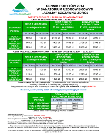 CENNIK POBYTÓW 2014 W SANATORIUM UZDROWISKOWYM „AZALIA” SZCZAWNO-ZDRÓJ POBYTY LECZNICZE I TURNUSY REHABILITACYJNE CENY W SEZONIE: 01.05.2014 – 30.09.2014 CENA Z LECZENIEM STANDARD - za miejsce brutto POKOJU CENA POBYTU LECZNICZEGO 14 dni – za miejsce brutto CENA POBYTU LECZNICZEGO 21 dni – za miejsce brutto Z ŁAZIENKĄ BEZ ŁAZIENKI Z ŁAZIENKĄ BEZ ŁAZIENKI Z ŁAZIENKĄ BEZ ŁAZIENKI POK. 1 OSOBOWY POK. 2 OSOBOWY POK. 3 OSOBOWY 160 zł 120 zł 2170 zł 1630 zł 3195 zł 2395 zł 140 zł 110 zł 1900 zł 1495 zł 2795 zł 2195 zł 125 zł 100 zł 1695 zł 1360 zł 2495 zł 1995 zł CENY POZA SEZONEM: 04.01.2014 – 30.04.2014 ORAZ 01.10.2014 – 20.12.2014 STANDARD POKOJU CENA Z LECZENIEM - za miejsce brutto CENA POBYTU LECZICZEGO 14 dni – za miejsce brutto CENA POBYTU LECZNICZEGO 21 dni – za miejsce brutto Z ŁAZIENKĄ BEZ ŁAZIENKI Z ŁAZIENKĄ BEZ ŁAZIENKI Z ŁAZIENKĄ BEZ ŁAZIENKI POK. 1 OSOBOWY POK. 2 OSOBOWY POK. 3 OSOBOWY 135 zł 100 zł 1835 zł 1360 zł 2695 zł 1995 zł 115 zł 90 zł 1560 zł 1225 zł 2295 zł 1795 zł 105 zł 80 zł 1425 zł 1090 zł 2095 zł 1595 zł Cena za pobyt leczniczy obejmuje: zakwaterowanie, całodzienne wyżywienie, 3 zabiegi dziennie w dni zabiegowe, opiekę medyczną Przy pobytach leczniczych min. 7-dniowych karnet na TĘŻNIĘ SOLANKOWĄ (5 wejść) GRATIS! Dla Gości „Azalii” pakiety badań laboratoryjnych w promocyjnych cenach! STANDARD POKOJU POK. 1 OSOBOWY POK. 2 OSOBOWY POK. 3 OSOBOWY CENY HOTELOWE ZE ŚNIADANIEM ZA MIEJSCE Z ŁAZIENKĄ BEZ ŁAZIENKI 110,00 90,00 70,00 80,00 70,00 50,00 Cena za pobyt hotelowy obejmuje również śniadanie WARUNKI SPRZEDAŻY: Cena za pobyt hotelowy: dzieci do 4 lat - NIEODPŁATNIE dzieci od 4 do 10 lat - 40% ZNIŻKI Cena za wyżywienie: śniadanie – 11 zł., obiad – 19 zł., kolacja – 13 zł., obiadokolacja – 23 zł. (dla grupy zorganizowanej powyżej 10 osób) Kuracjusz, który korzystał z prywatnych pobytów leczniczych w Sanatorium „AZALIA” w Szczawnie – Zdroju (łącznie 21 dni) – otrzymuje 5% zniżki na kolejny pobyt leczniczy. Przy dokonaniu rezerwacji przyjazdu do Sanatorium Uzdrowiskowego “Azalia” w Szczawnie-Zdroju obowiązuje dokonanie przedpłaty w wysokości 30% wartości zarezerwowanej usługi na nr konta: BZ WBK SA I O/Głuszyca 50 1090 2314 0000 0001 0048 5026 (w tytule przelewu proszę o wpisanie nr rezerwacji). W przypadku rezygnacji z pobytu, na poczet którego została wpłacona przedpłata, Gość ponosi tzw. koszt rezygnacji – szczegółowe informacje pod nr tel.: 74/ 664-26-30.