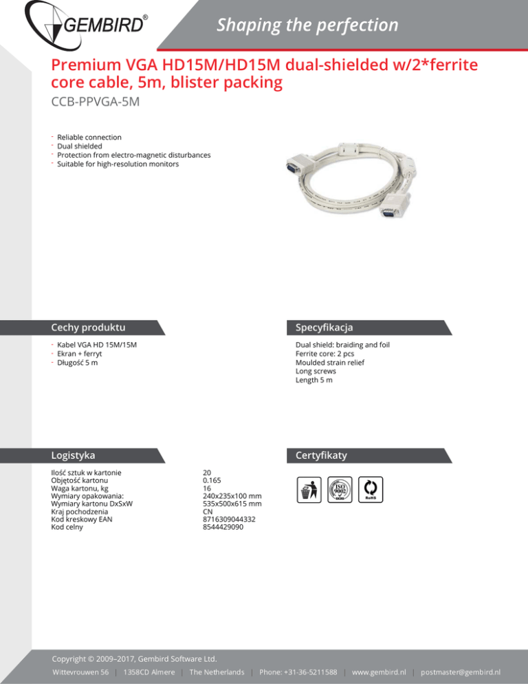 Premium VGA HD15M/HD15M dual-shielded w/2*ferrite core cable, 5m, blister packing CCB-PPVGA-5M - Reliable connection Dual shielded Protection from electro-magnetic disturbances Suitable for high-resolution monitors Cechy produktu Specyfikacja - Kabel VGA HD 15M/15M - Ekran + ferryt - Długość 5 m Dual shield: braiding and foil Ferrite core: 2 pcs Moulded strain relief Long screws Length 5 m Logistyka Certyfikaty Ilość sztuk w kartonie Objętość kartonu Waga kartonu, kg Wymiary opakowania: Wymiary kartonu DxSxW Kraj pochodzenia Kod kreskowy EAN Kod celny 20 0.165 16 240x235x100 mm 535x500x615 mm CN 8716309044332 8544429090 Copyright © 2009–2017, Gembird Software Ltd. ! " # $ ! "