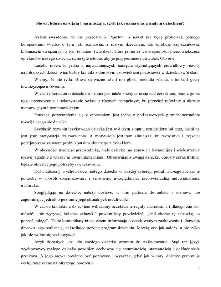 Słowa, które rozwijają i ograniczają, czyli jak rozmawiać z małym dzieckiem? Jestem świadomy, że nie przedstawię Państwu, a nawet nie będę próbował, pełnego kompendium wiedzy o tym jak rozmawiać z małym dzieckiem, ale spróbuje zaprezentować kilkanaście związanych z tym tematem twierdzeń, które pomimo ich znajomości przez większość opiekunów małego dziecka, są na tyle istotne, aby je przypominać i utrwalać. Oto one: Ludzka mowa to jedno z najważniejszych narzędzi stymulujących prawidłowy rozwój najmłodszych dzieci, więc każdy kontakt z dorosłym człowiekiem pozostawia w dziecku swój ślad. Wiemy, że nie tylko słowa są ważne, ale i ton głosu, melodia zdania, mimika i gesty towarzyszące mówieniu. W czasie kontaktu z dzieckiem istotne jest także pochylanie się nad dzieckiem, branie go na ręce, przenoszenie i pokazywanie świata z różnych perspektyw, bo przecież mówimy o okresie niemowlęcym i poniemowlęcym. Potrzeba porozumienia się z otoczeniem jest jedną z podstawowych potrzeb normalnie rozwijającego się dziecka. Szybkość rozwoju językowego dziecka jest w dużym stopniu uzależniona od tego, jak silna jest jego motywacja do mówienia. A motywacja jest tym silniejsza, im wcześniej i częściej podejmowane są nasze próby kontaktu słownego z dzieckiem. W obecności mądrego przewodnika, małe dziecko ma szansę na harmonijny i wielostronny rozwój zgodnie z własnymi uwarunkowaniami. Obserwując z uwagą dziecko, dorosły coraz trafniej będzie określać jego potrzeby i oczekiwania. Doświadczony wychowawca małego dziecka w każdej sytuacji potrafi zareagować na te potrzeby w sposób zorganizowany i sensowny, uwzględniając niepowtarzalną indywidualność maluszka. Spoglądając na dziecko, należy dostrzec w nim partnera do zabaw i rozmów, nie zapominając jednak o poziomie jego aktualnych możliwości. W czasie kontaktu z dzieckiem wdrażamy oczekiwane reguły zachowania i dlatego zamiast mówić: „nie wyrywaj koledze zabawki” powinniśmy powiedzieć, „jeśli chcesz tę zabawkę, to poproś kolegę”. Takie komunikaty niosą zatem informację o oczekiwanym zachowaniu i ułatwiają dziecku jego realizację, nakreślając pewien program działania. Mówią one jak należy, a nie tylko jak nie wolno się zachowywać. Język dorosłych jest dla każdego dziecka wzorem do naśladowania. Stąd też język wychowawcy małego dziecka powinien cechować się naturalnością, starannością i dokładnością przekazu. A jego mowa powinna być poprawna i wyraźna, gdyż jak wiemy, dziecko przejmuje cechy fonetyczne najbliższego otoczenia. 1 Kiedy więc rozmawiamy z dzieckiem poświęćmy mu całą naszą uwagę. Bardzo ważne jest nie tylko co, ale i w jaki sposób mówimy do dziecka. Poza tym niezwykle istotna jest tzw. „kąpiel słowna” – czyli opowiadanie dziecku o wszystkim, co robimy i co je otacza. Do dziecka mówmy jak najczęściej, posługując się prostymi zdaniami i stosując powtórzenia, w szczególności w okresie do 2-go roku życia. Później, w miarę rozwoju językowego wprowadzajmy zdania złożone, zachęcając jednocześnie do dyskusji. Mówmy do małego dziecka w chwili pielęgnacji, zabawy lub spaceru, pamiętając o niestosowaniu zdrobnień oraz by nasza mowa była wyraźna, prawidłowa i artykułowana powoli. Pamiętać także należy, że małe dziecko, szczególnie te do 2-roku życia, ma oczywiste trudności ze zrozumieniem skomplikowanych dla niego poleceń. Wszyscy wiemy, że małe dziecko zafascynowane jest naszym ruchem, więc biorąc to pod uwagę starajmy się, aby nasze polecenia były nie tylko proste i zwięzłe, ale i wsparte komunikacją pozawerbalną. Tak więc kierując do dziecka jakiś komunikat warto wesprzeć go odpowiednią mimiką, ruchem ciała lub gestem np. wypowiadając polecenie „daj” – wyciągnijmy w kierunku dziecka rękę. Dziecko początkowo operuje ubogim słownictwem, co nie powinno jednak wpływać na sposób mówienia do niego. Wręcz przeciwnie - na pojedyncze słowa dziecka należy odpowiadać zawsze całymi zdaniami. Istotną rolę w relacjach dziecka z dorosłymi odgrywają obopólnie wyrażane emocje. Dlatego tak ważne jest to, aby osoby zajmujące się dziećmi umiały rozpoznawać ich oczekiwania po zachowaniu, gestach lub wydawanych dźwiękach. Każdy specjalista opieki nad małym dzieckiem, po kilku tygodniowym okresie adaptacyjnym, potrafi prawidłowo zinterpretować sygnały dziecka i rozróżnić np. czy to płacz z bólu, z nudów, z przyczyn fizjologicznych, czy też jeszcze innych. Bardzo dużą wrażliwością cechują się dzieci szczególnie w wieku żłobkowym, więc doskonale odczytują kierowane przez opiekunkę komunikaty werbalne i pozawerbalne. Są one wyczulone nie tylko na ton głosu dorosłego, ale i na wyraz jego twarzy. Dlatego wychowawca małego dziecka, kiedy bawi się z dzieckiem, gdy bierze je na rękę, przewija czy karmi, powinien być delikatny, opanowany, spokojny i pogodny. Może wówczas oczekiwać, że dziecko także będzie spokojne i otwarte na współpracę. Zauważmy ponownie, że rozmawiając z dzieckiem lub nawiązując z nim kontakt i chcąc przy tym zdobyć jego zaufanie, nie możemy zapomnieć o: - miłym tonie głosu, 2 - uśmiechu na twarzy, - nawiązaniu kontaktu wzrokowego, - rozmowie „na poziomie” małego dziecka, - chwaleniu i dopingowaniu dziecka np. brawo, świetnie, „uda Ci się”, - cierpliwym słuchaniu, - o oferowaniu wsparcia, - zniżeniu ciała do wysokości dziecka, - o wypowiadaniu komunikatów, które dla dziecka są zrozumiałe, - oraz o proponowaniu zamiast rozkazywaniu, szczególnie w sytuacjach nie zagrażających bezpieczeństwu. Realizując określone zadania rozwojowe planujmy je tak, aby dziecko świetnie się z nami bawiło. Emocjonalne zaangażowanie się w te zabawy, niewątpliwie pomoże nam w osiągnięciu zaplanowanych dla niego celów rozwojowych. Należy jeszc