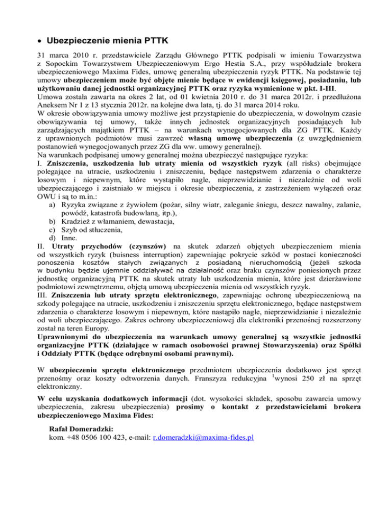 · Ubezpieczenie mienia PTTK 31 marca 2010 r. przedstawiciele Zarządu Głównego PTTK podpisali w imieniu Towarzystwa z Sopockim Towarzystwem Ubezpieczeniowym Ergo Hestia S.A., przy współudziale brokera ubezpieczeniowego Maxima Fides, umowę generalną ubezpieczenia ryzyk PTTK. Na podstawie tej umowy ubezpieczeniem może być objęte mienie będące w ewidencji księgowej, posiadaniu, lub użytkowaniu danej jednostki organizacyjnej PTTK oraz ryzyka wymienione w pkt. I-III. Umowa została zawarta na okres 2 lat, od 01 kwietnia 2010 r. do 31 marca 2012r. i przedłużona Aneksem Nr 1 z 13 stycznia 2012r. na kolejne dwa lata, tj. do 31 marca 2014 roku. W okresie obowiązywania umowy możliwe jest przystąpienie do ubezpieczenia, w dowolnym czasie obowiązywania tej umowy, także innych jednostek organizacyjnych posiadających lub zarządzających majątkiem PTTK – na warunkach wynegocjowanych dla ZG PTTK. Każdy z uprawnionych podmiotów musi zawrzeć własną umowę ubezpieczenia (z uwzględnieniem postanowień wynegocjowanych przez ZG dla ww. umowy generalnej). Na warunkach podpisanej umowy generalnej można ubezpieczyć następujące ryzyka: I. Zniszczenia, uszkodzenia lub utraty mienia od wszystkich ryzyk (all risks) obejmujące polegające na utracie, uszkodzeniu i zniszczeniu, będące następstwem zdarzenia o charakterze losowym i niepewnym, które wystąpiło nagle, nieprzewidzianie i niezależnie od woli ubezpieczającego i zaistniało w miejscu i okresie ubezpieczenia, z zastrzeżeniem wyłączeń oraz OWU i są to m.in.: a) Ryzyka związane z żywiołem (pożar, silny wiatr, zaleganie śniegu, deszcz nawalny, zalanie, powódź, katastrofa budowlaną, itp.), b) Kradzież z włamaniem, dewastacja, c) Szyb od stłuczenia, d) Inne. II. Utraty przychodów (czynszów) na skutek zdarzeń objętych ubezpieczeniem mienia od wszystkich ryzyk (buisness interruption) zapewniając pokrycie szkód w postaci konieczności ponoszenia kosztów stałych związanych z posiadaną nieruchomością (jeżeli szkoda w budynku będzie ujemnie oddziaływać na działalność oraz braku czynszów poniesionych przez jednostkę organizacyjną PTTK na skutek utraty lub uszkodzenia mienia, które jest dzierżawione podmiotowi zewnętrznemu, objętą umową ubezpieczenia mienia od wszystkich ryzyk. III. Zniszczenia lub utraty sprzętu elektronicznego, zapewniając ochronę ubezpieczeniową na szkody polegające na utracie, uszkodzeniu i zniszczeniu sprzętu elektronicznego, będące następstwem zdarzenia o charakterze losowym i niepewnym, które nastąpiło nagle, nieprzewidzianie i niezależnie od woli ubezpieczającego. Zakres ochrony ubezpieczeniowej dla elektroniki przenośnej rozszerzony został na teren Europy. Uprawnionymi do ubezpieczenia na warunkach umowy generalnej są wszystkie jednostki organizacyjne PTTK (działające w ramach osobowości prawnej Stowarzyszenia) oraz Spółki i Oddziały PTTK (będące odrębnymi osobami prawnymi). W ubezpieczeniu sprzętu elektronicznego przedmiotem ubezpieczenia dodatkowo jest sprzęt przenośmy oraz koszty odtworzenia danych. Franszyza redukcyjna 1wynosi 250 zł na sprzęt elektroniczny. W celu uzyskania dodatkowych informacji (dot. wysokości składek, sposobu zawarcia umowy ubezpieczenia, zakresu ubezpieczenia) prosimy o kontakt z przedstawicielami brokera ubezpieczeniowego Maxima Fides: Rafał Domeradzki: kom. +48 0506 100 423, e-mail: [email protected] BBU Maxima Fides Sp. z o.o. ul. E. Ciołka 17 lok. nr 400, 01-445 Warszawa tel: (48) 22 883 41 40 fax. (48) 22 883 41 42 Zachęcamy do skorzystania z ubezpieczenia mienia PTTK na warunkach umowy generalnej z uwagi na atrakcyjne stawki ubezpieczeniowe, szeroki zakres ubezpieczenia oraz uwzględnienie w postanowieniach w/w umowy zapisów odpowiadających specyfice PTTK. Dokumenty dot. ww. polis ubezpieczeniowych dostępne są na stronie internetowej Zarządu Głównego PTTK http://www.pttk.pl/zycie/. Przygotowała: Natalia Wojtyra 1 Franszyza redukcyjna jest to umówiona kwota (lub % kwoty należnego odszkodowania), która będzie potrącana z każdego należnego odszkodowania. Jeżeli wartość szkody nie przekroczy franszyzy redukcyjnej to odszkodowanie nie będzie wypłacone.