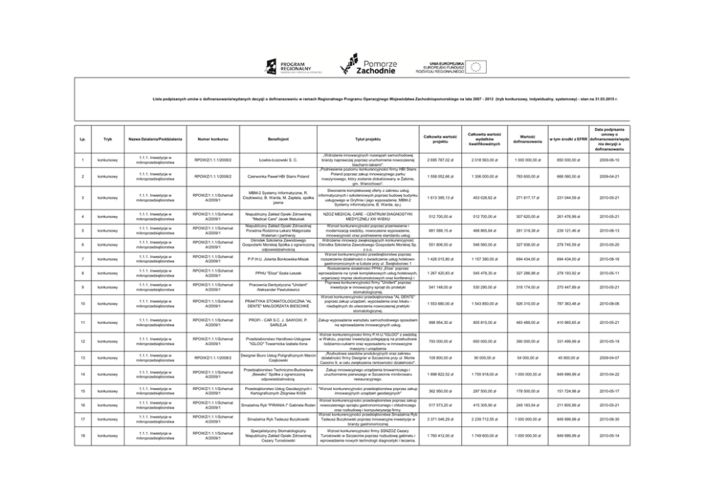 Lista podpisanych umów o dofinansowanie/wydanych decyzji o dofinansowaniu w ramach Regionalnego Programu Operacyjnego Województwa Zachodniopomorskiego na lata 2007 - 2013 (tryb konkursowy, indywidualny, systemowy) - stan na 31.03.2015 r. Całkowita wartość wydatków kwalifikowalnych Wartość dofinansowania 2 695 787,02 zł 2 018 563,00 zł 1 000 000,00 zł 850 000,00 zł 2009-06-10 1 558 052,66 zł 1 306 000,00 zł 783 600,00 zł 666 060,00 zł 2009-04-21 Stworzenie kompleksowej oferty z zakresu usług informatycznych i szkoleniowych poprzez budowę budynku usługowego w Gryfinie i jego wyposażenie, MBM-2 Systemy informatyczne, B. Warda, sp.j. 1 613 395,13 zł 453 028,62 zł 271 817,17 zł 231 044,59 zł 2010-05-21 Niepubliczny Zakład Opieki Zdrowotnej "Medical Care" Jacek Matusiak NZOZ MEDICAL CARE - CENTRUM DIAGNOSTYKI MEDYCZNEJ XXI WIEKU 512 700,00 zł 512 700,00 zł 307 620,00 zł 261 476,99 zł 2010-05-21 Niepubliczny Zakład Opieki Zdrowotnej Poradnia Rodzinna Lekarz Małgorzata Walerian i partnerzy Ośrodek Szkolenia Zawodowego Gospodarki Morskiej Spółka z ograniczoną odpowiedzialnością Wzrost konkurencyjności poprzez przeniesienie i modernizację siedziby, nowoczesne wyposażenie, innowacyjność oraz podniesienie standardu usług Wdrożenie innowacji zwiększających konkurencyjność Ośrodka Szkolenia Zawodowego Gospodarki Morskiej Sp. z o.o. Wzrost konkurencyjności przedsiębiorstwa poprzez rozszerzenie działalności o świadczenie usług hotelowogastronomicznych w Łobzie przy ul. Świętoborzec 1 Rozszerzenie działalności PPHU „Eliza” poprzez wprowadzenie na rynek kompleksowych usług hotelowych, organizacji imprez okolicznościowych oraz konferencji i Poprawa konkurencyjności firmy "Unident" poprzez inwestycje w innowacyjny sprzęt do protetyki stomatologicznej. Wzrost konkurencyjności przedsiębiorstwa "AL DENTE" poprzez zakup urządzeń, wyposażenia oraz lokalu niezbędnych do utworzenia nowoczesnej praktyki stomatologicznej. 881 588,15 zł 468 865,64 zł 281 319,38 zł 239 121,46 zł 2010-08-13 551 806,00 zł 546 560,00 zł 327 936,00 zł 278 745,59 zł 2010-05-20 1 426 015,80 zł 1 157 390,00 zł 694 434,00 zł 694 434,00 zł 2010-08-16 1 267 420,83 zł 545 478,30 zł 327 286,98 zł 278 193,92 zł 2010-05-11 541 148,00 zł 530 290,00 zł 318 174,00 zł 270 447,89 zł 2010-05-21 1 553 680,00 zł 1 543 850,00 zł 926 310,00 zł 787 363,48 zł 2010-08-06 998 954,30 zł 805 815,00 zł 483 489,00 zł 410 965,65 zł 2010-05-21 793 000,00 zł 650 000,00 zł 390 000,00 zł 331 499,99 zł 2010-05-19 109 800,00 zł 90 000,00 zł 54 000,00 zł 45 900,00 zł 2009-04-07 Zakup innowacyjnego urządzenia browarniczego i uruchomienie pierwszego w Szczecinie minibrowaru restauracyjnego. 1 898 822,52 zł 1 755 918,00 zł 1 000 000,00 zł 849 999,99 zł 2010-04-22 "Wzrost konkurencyjności przedsiębiorstwa poprzez zakup innowacyjnych urządzeń geodezyjnych" 362 950,00 zł 297 500,00 zł 178 500,00 zł 151 724,98 zł 2010-05-17 517 573,20 zł 415 305,90 zł 249 183,54 zł 211 805,99 zł 2010-05-21 3 371 046,29 zł 2 239 712,55 zł 1 000 000,00 zł 849 999,98 zł 2010-08-30 1 760 412,00 zł 1 749 600,00 zł 1 000 000,00 zł 849 999,99 zł 2010-05-14 Tryb Nazwa Działania/Poddziałania Numer konkursu Beneficjent 1 konkursowy 1.1.1. Inwestycje w mikroprzedsiębiorstwa RPOWZ/1.1.1/2008/2 Łowkis-Łozowski S. C. 2 konkursowy 1.1.1. Inwestycje w mikroprzedsiębiorstwa RPOWZ/1.1.1/2008/2 Czerwonka Paweł HBI Stairs Poland 3 konkursowy 1.1.1. Inwestycje w mikroprzedsiębiorstwa RPOWZ/1.1.1/Schemat A/2009/1 MBM-2 Systemy Informatyczne, R. Ciszkiewicz, B. Warda, M. Zapłata, spółka jawna 4 konkursowy 1.1.1. Inwestycje w mikroprzedsiębiorstwa RPOWZ/1.1.1/Schemat A/2009/1 konkursowy 1.1.1. Inwestycje w mikroprzedsiębiorstwa RPOWZ/1.1.1/Schemat A/2009/1 6 konkursowy 1.1.1. Inwestycje w mikroprzedsiębiorstwa RPOWZ/1.1.1/Schemat A/2009/1 7 konkursowy 1.1.1. Inwestycje w mikroprzedsiębiorstwa RPOWZ/1.1.1/Schemat A/2009/1 8 konkursowy 1.1.1. Inwestycje w mikroprzedsiębiorstwa RPOWZ/1.1.1/Schemat A/2009/1 PPHU "Eliza" Szala Leszek 9 konkursowy 1.1.1. Inwestycje w mikroprzedsiębiorstwa RPOWZ/1.1.1/Schemat A/2009/1 Pracownia Dentystyczna "Unident" Aleksander Pawlukiewicz 10 konkursowy 1.1.1. Inwestycje w mikroprzedsiębiorstwa RPOWZ/1.1.1/Schemat A/2009/1 PRAKTYKA STOMATOLOGICZNA "AL DENTE" MAŁGORZATA BIESCHKE 11 konkursowy 1.1.1. Inwestycje w mikroprzedsiębiorstwa RPOWZ/1.1.1/Schemat A/2009/1 PROFI - CAR S.C. J. SAWICKI, P. SARLEJA 12 konkursowy 1.1.1. Inwestycje w mikroprzedsiębiorstwa RPOWZ/1.1.1/Schemat A/2009/1 13 konkursowy 1.1.1. Inwestycje w mikroprzedsiębiorstwa RPOWZ/1.1.1/2008/2 14 konkursowy 1.1.1. Inwestycje w mikroprzedsiębiorstwa RPOWZ/1.1.1/Schemat A/2009/1 Przedsiębiorstwo Techniczno-Budowlane „Bewako” Spółka z ograniczoną odpowiedzialnością. 15 konkursowy 1.1.1. Inwestycje w mikroprzedsiębiorstwa RPOWZ/1.1.1/Schemat A/2009/1 Przedsiębiorstwo Usług Geodezyjnych i Kartograficznych Zbigniew Królik 16 konkursowy 1.1.1. Inwestycje w mikroprzedsiębiorstwa RPOWZ/1.1.1/Schemat A/2009/1 17 konkursowy 1.1.1. Inwestycje w mikroprzedsiębiorstwa RPOWZ/1.1.1/Schemat A/2009/1 18 konkursowy 1.1.1. Inwestycje w mikroprzedsiębiorstwa RPOWZ/1.1.1/Schemat A/2009/1 5 Data podpisania umowy o w tym środki z EFRR dofinansowanie/wyda nia decyzji o dofinansowaniu Całkowita wartość projektu Lp. P.P.H.U. Jolanta Bonkowska-Misiak Tytuł projektu „Wdrożenie innowacyjnych rozwiązań samochodowej branży naprawczej poprzez uruchomienie nowoczesnej blacharni-lakierni". „Podniesienie poziomu konkurencyjności firmy HBI Stairs Poland poprzez zakup innowacyjnego parku maszynowego, który zostanie zlokalizowany w Żabinie, gm. Wierzchowo". Zakup wyposażenia warsztatu samochodowego sposobem na wprowadzenie innowacyjnych usług. Wzrost konkurencyjności firmy P.H.U."IGLOO" z siedzibą w Wałczu, poprzez inwestycję polegającą na przebudowie lodziarnio-cukierni o