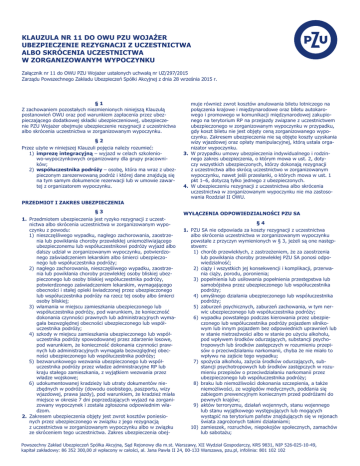 KLAUZULA NR 11 DO OWU PZU WOJAŻER UBEZPIECZENIE REZYGNACJI Z UCZESTNICTWA ALBO SKRÓCENIA UCZESTNICTWA W ZORGANIZOWANYM WYPOCZYNKU Załącznik nr 11 do OWU PZU Wojażer ustalonych uchwałą nr UZ/297/2015 Zarządu Powszechnego Zakładu Ubezpieczeń Spółki Akcyjnej z dnia 28 września 2015 r. §1 Z zachowaniem pozostałych niezmienionych niniejszą Klauzulą postanowień OWU oraz pod warunkiem zapłacenia przez ubezpieczającego dodatkowej składki ubezpieczeniowej, ubezpieczenie PZU Wojażer obejmuje ubezpieczenie rezygnacji z uczestnictwa albo skrócenia uczestnictwa w zorganizowanym wypoczynku. §2 Przez użyte w niniejszej Klauzuli pojęcia należy rozumieć: 1) imprezę integracyjną – wyjazd w celach szkoleniowo-wypoczynkowych organizowany dla grupy pracowników; 2) współuczestnika podróży – osobę, która ma wraz z ubezpieczonym zarezerwowaną podróż i której dane znajdują się na tym samym dokumencie rezerwacji lub w umowie zawartej z organizatorem wypoczynku. PRZEDMIOT I ZAKRES UBEZPIECZENIA §3 1. Przedmiotem ubezpieczenia jest ryzyko rezygnacji z uczestnictwa albo skrócenia uczestnictwa w zorganizowanym wypoczynku z powodu: 1) nieszczęśliwego wypadku, nagłego zachorowania, zaostrzenia lub powikłania choroby przewlekłej uniemożliwiającego ubezpieczonemu lub współuczestnikowi podróży wyjazd albo dalszy udział w zorganizowanym wypoczynku, potwierdzonego zaświadczeniem lekarskim albo śmierci ubezpieczonego lub współuczestnika podróży; 2) nagłego zachorowania, nieszczęśliwego wypadku, zaostrzenia lub powikłania choroby przewlekłej osoby bliskiej ubezpieczonego lub osoby bliskiej współuczestnika podróży, potwierdzonego zaświadczeniem lekarskim, wymagającego obecności i stałej opieki świadczonej przez ubezpieczonego lub współuczestnika podróży na rzecz tej osoby albo śmierci osoby bliskiej; 3) włamania w miejscu zamieszkania ubezpieczonego lub współuczestnika podróży, pod warunkiem, że konieczność dokonania czynności prawnych lub administracyjnych wymagała bezwzględnej obecności ubezpieczonego lub współuczestnika podróży; 4) szkody w miejscu zamieszkania ubezpieczonego lub współuczestnika podróży spowodowanej przez zdarzenie losowe, pod warunkiem, że konieczność dokonania czynności prawnych lub administracyjnych wymagała bezwzględnej obecności ubezpieczonego lub współuczestnika podróży; 5) bezwarunkowego wezwania ubezpieczonego lub współuczestnika podróży przez władze administracyjne RP lub kraju stałego zamieszkania, z wyjątkiem wezwania przez władze wojskowe; 6) udokumentowanej kradzieży lub utraty dokumentów niezbędnych w podróży (dowodu osobistego, paszportu, wizy wjazdowej, prawa jazdy), pod warunkiem, że kradzież miała miejsce w okresie 7 dni poprzedzających wyjazd na zorganizowany wypoczynek i została zgłoszona odpowiednim władzom. 2. Zakresem ubezpieczenia objęty jest zwrot kosztów poniesionych przez ubezpieczonego w związku z jego rezygnacją z uczestnictwa w zorganizowanym wypoczynku albo w związku ze skróceniem tego uczestnictwa. Zakres ubezpieczenia obej- muje również zwrot kosztów anulowania biletu lotniczego na połączenia krajowe i międzynarodowe oraz biletu autokarowego i promowego w komunikacji międzynarodowej zakupionego na terytorium RP na przejazdy związane z uczestnictwem ubezpieczonego w zorganizowanym wypoczynku w przypadku, gdy koszt biletu nie jest objęty ceną zorganizowanego wypoczynku. Zakresem ubezpieczenia nie są objęte koszty uzyskania wizy wjazdowej oraz opłaty manipulacyjnej, którą ustala organizator wypoczynku. 3. W przypadku umowy ubezpieczenia indywidualnego i rodzinnego zakres ubezpieczenia, o którym mowa w ust. 2, dotyczy wszystkich ubezpieczonych, którzy dokonają rezygnacji z uczestnictwa albo skrócą uczestnictwo w zorganizowanym wypoczynku, nawet jeśli przesłanki, o których mowa w ust. 1 pkt 1–6, dotyczą tylko jednego z ubezpieczonych. 4. W ubezpieczeniu rezygnacji z uczestnictwa albo skrócenia uczestnictwa w zorganizowanym wypoczynku nie ma zastosowania Rozdział II OWU. WYŁĄCZENIA ODPOWIEDZIALNOŚCI PZU SA §4 1. PZU SA nie odpowiada za koszty rezygnacji z uczestnictwa albo skrócenia uczestnictwa w zorganizowanym wypoczynku powstałe z przyczyn wymienionych w § 3, jeżeli są one następstwem: 1) chorób przewlekłych, z zastrzeżeniem, że za zaostrzenia lub powikłania choroby przewlekłej PZU SA ponosi odpowiedzialność; 2) ciąży i wszystkich jej konsekwencji i komplikacji, przerwania ciąży, porodu, poronienia; 3) popełnienia lub usiłowania popełnienia przestępstwa lub samobójstwa przez ubezpieczonego lub współuczestnika podróży; 4) umyślnego działania ubezpieczonego lub współuczestnika podróży; 5) zaburzeń psychicznych, zaburzeń zachowania, w tym nerwic ubezpieczonego lub współuczestnika podróży; 6) wypadku powstałego podczas kierowania przez ubezpieczonego lub współuczestnika podróży pojazdem silnikowym lub innym pojazdem bez odpowiednich uprawnień lub w stanie nietrzeźwości albo w stanie po użyciu alkoholu, pod wpływem środków odurzających, substancji psychotropowych lub środków zastępczych w rozumieniu przepisów o przeciwdziałaniu narkomanii, chyba że nie miało to wpływu na zajście tego wypadku; 7) spożycia alkoholu, zażycia środków odurzających, substancji psychotropowych lub środków zastępczych w rozumieniu przepisów o przeciwdziałaniu narkomanii przez ubezpieczonego lub współuczestnika podróży; 8) braku lub niemożliwości dokonania szczepienia, a także niemożliwości, ze względów medycznych, poddania się zabiegom prewencyjnym koniecznym przed podróżami do pewnych krajów; 9) aktów terroryzmu, działań wojennych, stanu wojennego lub stanu wyjątkowego występujących lub mogących wystąpić na terytorium państw znajdujących się w rejonach świata zagrożonych takimi działaniami; 10) zamieszek, rozruchów, niepokojów społe