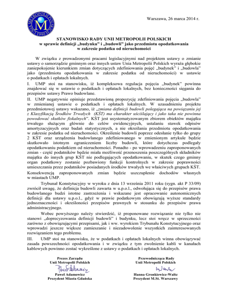 Warszawa, 26 marca 2014 r. STANOWISKO RADY UNII METROPOLII POLSKICH w sprawie definicji „budynku” i „budowli” jako przedmiotu opodatkowania w zakresie podatku od nieruchomości W związku z prowadzonymi pracami legislacyjnymi nad projektem ustawy o zmianie ustawy o samorządzie gminnym oraz innych ustaw Unia Metropolii Polskich wyraża głębokie zaniepokojenie kierunkiem zmian dotyczących zdefiniowania pojęć „budynek” i „budowla” jako (przedmiotu opodatkowania w zakresie podatku od nieruchomości) w ustawie o podatkach i opłatach lokalnych. I. UMP stoi na stanowisku, iż kompleksowa regulacja pojęcia „budynek” powinna znajdować się w ustawie o podatkach i opłatach lokalnych, bez konieczności sięgania do przepisów ustawy Prawo budowlane. II. UMP negatywnie opiniuje przedstawioną propozycję zdefiniowania pojęcia „budowla” w zmienianej ustawie o podatkach i opłatach lokalnych. W uzasadnieniu projektu przedmiotowej ustawy wskazano, iż „zmiana definicji budowli polegająca na powiązaniu jej z Klasyfikacją Środków Trwałych (KŚT) ma charakter uściślający i jako taka nie powinna powodować skutków fiskalnych”. KŚT jest usystematyzowanym zbiorem obiektów majątku trwałego służącym głównie do celów ewidencyjnych, ustalaniu stawek odpisów amortyzacyjnych oraz badań statystycznych, a nie określania przedmiotu opodatkowania w zakresie podatku od nieruchomości. Określenie budowli poprzez odesłanie tylko do grupy 2 KŚT oraz urządzenia budowlanego zdefiniowanego w zmienionym artykule będzie skutkowało istotnym ograniczeniem liczby budowli, które dotychczas podlegały opodatkowaniu podatkiem od nieruchomości. Ponadto - po wprowadzeniu zaproponowanych zmian - część podatników będzie miała możliwość przenoszenia poszczególnych składników majątku do innych grup KŚT nie podlegających opodatkowaniu, w skutek czego gminny organ podatkowy zostanie pozbawiony funkcji kontrolnych w zakresie poprawności umieszczania przez podatników posiadanych środków trwałych we właściwych grupach KŚT. Konsekwencją zaproponowanych zmian będzie uszczuplenie dochodów własnych w miastach UMP. Trybunał Konstytucyjny w wyroku z dnia 13 września 2011 roku (sygn. akt P 33/09) zwrócił uwagę, że definicja budowli zawarta w u.p.o.l., odwołująca się do przepisów prawa budowlanego budzi istotne zastrzeżenia i wskazane jest opracowanie autonomicznych definicji dla ustawy u.p.o.l., gdyż w prawie podatkowym obowiązują wyższe standardy jednoznaczności i określoności przepisów prawnych w stosunku do przepisów prawa administracyjnego. Wobec powyższego należy stwierdzić, iż proponowane rozwiązanie nie tylko nie stanowi „doprecyzowania definicji budowli” i budynku, lecz stoi wręcz w sprzeczności zarówno z obowiązującymi przepisami, jak i ww. wyrokiem Trybunału Konstytucyjnego oraz wprowadzi jeszcze większe zamieszanie i niezadowolenie wszystkich zainteresowanych rozwiązaniem tego problemu. III. UMP stoi na stanowisku, że w podatkach i opłatach lokalnych winna obowiązywać zasada powszechności opodatkowania i w związku z tym zwolnienie kabli w kanałach kablowych powinno zostać wykreślone z ustawy o podatkach i opłatach lokalnych. Prezes Zarządu Unii Metropolii Polskich Przewodnicząca Rady Unii Metropolii Polskich Paweł Adamowicz Prezydent Miasta Gdańska Hanna Gronkiewicz-Waltz Prezydent M.St. Warszawy