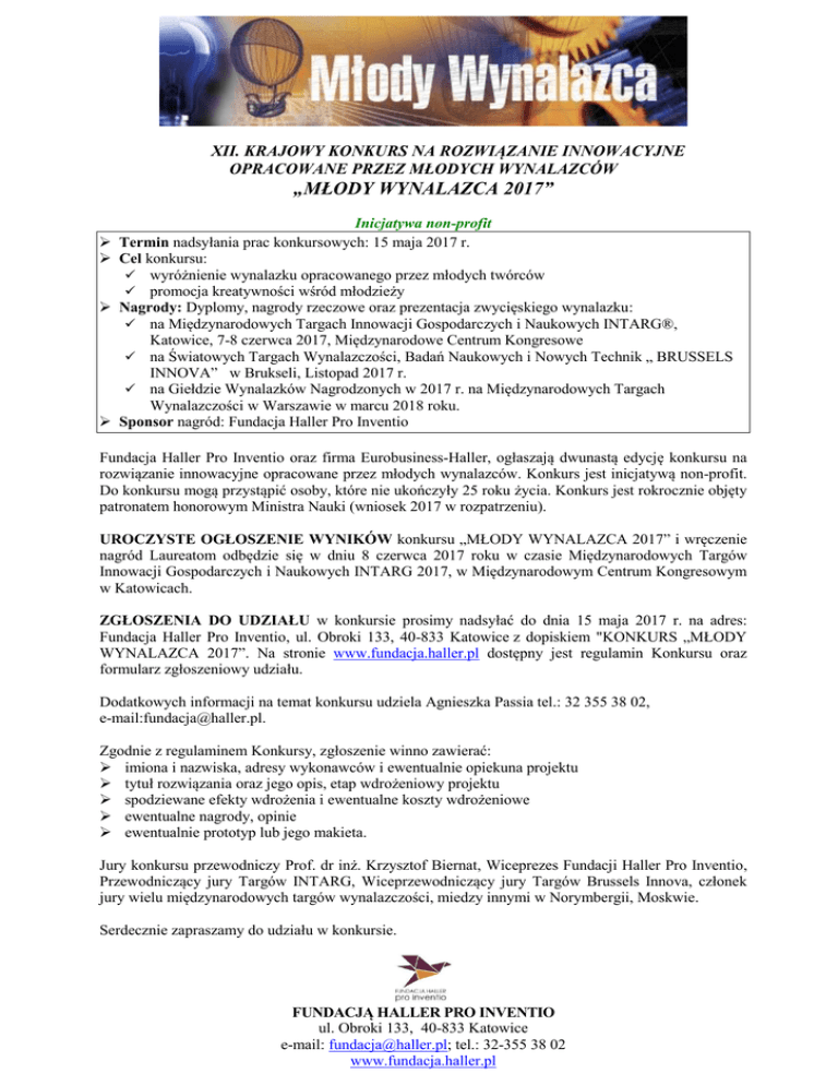 XII. KRAJOWY KONKURS NA ROZWIĄZANIE INNOWACYJNE OPRACOWANE PRZEZ MŁODYCH WYNALAZCÓW „MŁODY WYNALAZCA 2017” Inicjatywa non-profit Termin nadsyłania prac konkursowych: 15 maja 2017 r. Cel konkursu: wyróżnienie wynalazku opracowanego przez młodych twórców promocja kreatywności wśród młodzieży Nagrody: Dyplomy, nagrody rzeczowe oraz prezentacja zwycięskiego wynalazku: na Międzynarodowych Targach Innowacji Gospodarczych i Naukowych INTARG®, Katowice, 7-8 czerwca 2017, Międzynarodowe Centrum Kongresowe na Światowych Targach Wynalazczości, Badań Naukowych i Nowych Technik „ BRUSSELS INNOVA” w Brukseli, Listopad 2017 r. na Giełdzie Wynalazków Nagrodzonych w 2017 r. na Międzynarodowych Targach Wynalazczości w Warszawie w marcu 2018 roku. Sponsor nagród: Fundacja Haller Pro Inventio Fundacja Haller Pro Inventio oraz firma Eurobusiness-Haller, ogłaszają dwunastą edycję konkursu na rozwiązanie innowacyjne opracowane przez młodych wynalazców. Konkurs jest inicjatywą non-profit. Do konkursu mogą przystąpić osoby, które nie ukończyły 25 roku życia. Konkurs jest rokrocznie objęty patronatem honorowym Ministra Nauki (wniosek 2017 w rozpatrzeniu). UROCZYSTE OGŁOSZENIE WYNIKÓW konkursu „MŁODY WYNALAZCA 2017” i wręczenie nagród Laureatom odbędzie się w dniu 8 czerwca 2017 roku w czasie Międzynarodowych Targów Innowacji Gospodarczych i Naukowych INTARG 2017, w Międzynarodowym Centrum Kongresowym w Katowicach. ZGŁOSZENIA DO UDZIAŁU w konkursie prosimy nadsyłać do dnia 15 maja 2017 r. na adres: Fundacja Haller Pro Inventio, ul. Obroki 133, 40-833 Katowice z dopiskiem "KONKURS „MŁODY WYNALAZCA 2017”. Na stronie www.fundacja.haller.pl dostępny jest regulamin Konkursu oraz formularz zgłoszeniowy udziału. Dodatkowych informacji na temat konkursu udziela Agnieszka Passia tel.: 32 355 38 02, e-mail:[email protected]. Zgodnie z regulaminem Konkursy, zgłoszenie winno zawierać: imiona i nazwiska, adresy wykonawców i ewentualnie opiekuna projektu tytuł rozwiązania oraz jego opis, etap wdrożeniowy projektu spodziewane efekty wdrożenia i ewentualne koszty wdrożeniowe ewentualne nagrody, opinie ewentualnie prototyp lub jego makieta. Jury konkursu przewodniczy Prof. dr inż. Krzysztof Biernat, Wiceprezes Fundacji Haller Pro Inventio, Przewodniczący jury Targów INTARG, Wiceprzewodniczący jury Targów Brussels Innova, członek jury wielu międzynarodowych targów wynalazczości, miedzy innymi w Norymbergii, Moskwie. Serdecznie zapraszamy do udziału w konkursie. FUNDACJĄ HALLER PRO INVENTIO ul. Obroki 133, 40-833 Katowice e-mail: [email protected]; tel.: 32-355 38 02 www.fundacja.haller.pl Patronat medialny: *********************************************************************************** X. Jubileuszowe Międzynarodowe Targi Innowacji INTARG® odbędą się w czerwcu 2017 w Katowicach w Międzynarodowym Centrum Kongresowym. Targi są platformą bezpośredniego kontaktu i spotkań przedstawicieli nauki, innowacyjnych przedsiębiorstw, przemysłu, podmiotów otoczenia biznesu oraz wspomagających i finansujących badania. Celem INTARG’u jest promocja wynalazków i innowacji zarówno jeszcze nie wdrożonych, jak i tych, które już weszły na rynek i rozpoczęła się ich komercjalizacja. Targi mają charakter interdyscyplinarny. W programie Targów między innymi: Prezentacja wynalazków i innowacyjnych produktów, technologii i usług Konferencje, panele dyskusyjne, spotkania biznesowe B2B, Konkurs INTARG Ocena wynalazków i innowacji przez jury (w ramach Konkursu INTARG) Gala wręczenia medali i dyplomów za najlepsze wynalazki i innowacje INTARG® 2017 Gala wręczenia statuetek LIDER INNOWACJI® 2017, Gala ogłoszenia wyników MŁODY WYNALAZCA 2017 *********************************************************************************** Targi „ BRUSSELS INNOVA” odbywają się w listopadzie w Brukseli. Stanowią czołową międzynarodową imprezę wystawienniczą w dziedzinie wynalazczości. Poświęcone są transferowi technologii i wdrażaniu postępu technicznego. Targom towarzyszy międzynarodowy konkurs innowacji „EUREKA” w ramach, którego, każdy z prezentowanych rozwiązań (prototypów, nowości już wdrożonych lub oczekujących na wdrożenie) podlega ocenie ekspertów międzynarodowego jury. Polska uczestniczy w tej imprezie od 1990 roku. *********************************************************************************** Krajowa Wystawa - Giełda Wynalazków Nagrodzonych na Międzynarodowych Targach Wynalazczości organizowana jest od 27 lat w lutym lub marcu w Warszawie, w Centrum Nauki Kopernik. Celem imprezy jest promocja w kraju polskich wynalazków i innowacji nagrodzonych na arenie międzynarodowej. Giełda przyczynia się do zwiększenia zainteresowania krajowych podmiotów gospodarczych polskimi rozwiązaniami naukowo – technicznymi oraz innowacyjnymi produktami. *********************************************************************************** FUNDACJĄ HALLER PRO INVENTIO ul. Obroki 133, 40-833 Katowice e-mail: [email protected]; tel.: 32-355 38 02 www.fundacja.haller.pl