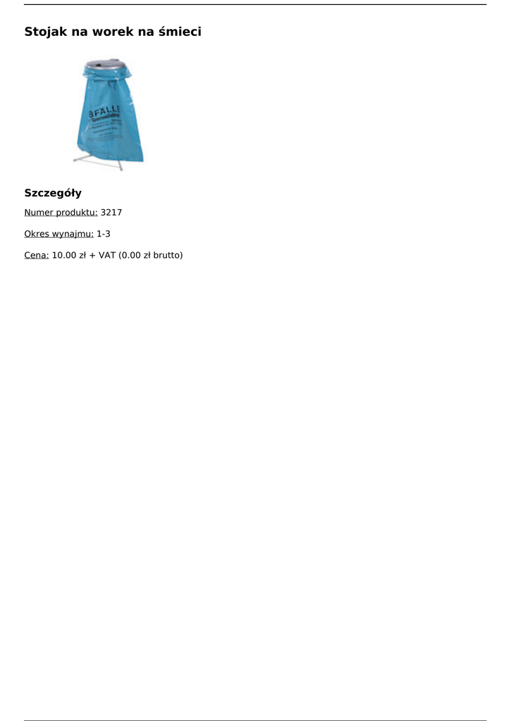 Stojak na worek na śmieci Szczegóły Numer produktu: 3217 Okres wynajmu: 1-3 Cena: 10.00 zł + VAT (0.00 zł brutto) Powered by TCPDF (www.tcpdf.org)