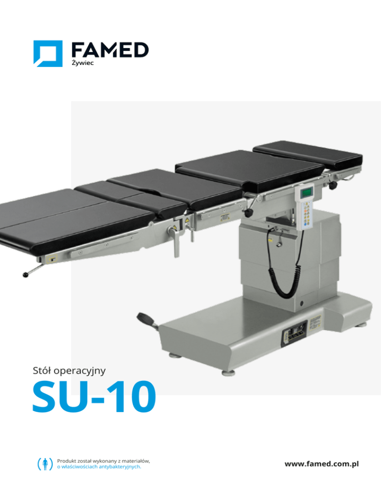 Stół operacyjny SU-10 Produkt został wykonany z materiałów, o właściwościach antybakteryjnych. www.famed.com.pl Materace antystatyczne z pianki poliuretanowej, odejmowane SU-10 Segment siedzenia Segment oparcia pleców Podgłówek Stół operacyjny Podnóżki Pilot przewodowy Przeznaczenie Przeznaczony jest do podtrzymywania pacjenta podczas przeprowadzania zabiegów i operacji w zakresie większości dyscyplin chirurgicznych, a zwłaszcza w zakresie chirurgii ogólnej, chirurgii naczyniowej, kardiochirurgii, neurochirurgii, urologii, ginekologii, proktologii, laryngologii, okulistyki, endoskopii, laparoskopii, chirurgii urazowej, onkologicznej, stomatologicznej, plastycznej i innych. Funkcje i napędy Regulacja odchylania i blokowania podnóżków Regulacja nachylenia podnóżków Dźwignia blokady ruchu Pełna oferta wyposażenia specjalistycznego przedstawiona jest w katalogu „Wyposażenie stołów operacyjnych”. Budowa standardowa • Stół wykonany jest ze stali nierdzewnej, kwasoodpornej • Podstawa stołu przejezdna z centralną blokadą uruchamianą dźwignią nożną. • Blat stołu nie posiada żadnych poprzecznych belek metalowych, co w połączeniu z asymetrycznie umieszczoną kolumną stołu zapewnia możliwość swobodnego monitorowania pacjenta aparatem „C” w trakcie zabiegów i operacji, bez koniecznosci używania funkcji przesuwu wzdłużnego blatu. Blat jest przystosowany do używania specjalistycznego wyposażenia neurochirurgicznego, jak np. Mayfield czy Doro. • Blat stołu jest przenikalny dla promieni RTG. Materace są zdejmowalne, bezszwowe, antystatyczne, odporne na działanie środków dezynfekcyjnych. • Powierzchnie stołu łatwe do czyszczenia i odporne na działanie środków dezynfekcyjnych. • W celu zwiększenia funkcjonalności stołu wprowadzono możliwość zamiany miejscami segmentów: podnóżka, siedzenia oraz podgłówka. 2 Sterowniki do stołu SU-10 Panel przyłączeniowy • Regulacja wysokości blatu, przechyły boczne, pozycja Trendelenburga i antyTrendelenburga, regulacja segmentu siedzenia oraz poziomowanie blatu wykonywane są z pilota za pomocą układu elektrohydraulicznego zasilanego akumulatorowo napięciem 24 V DC. • Regulacja nachylenia podgłówka oraz podnóżków wykonywana jest manualnie przy wspomaganiu sprężyn gazowych wyposażonych w blokadę. Opcje wykonania stołu SU-10 Alternatywny napęd stołu Pilot przewodowy WS-62.6 Panel sterujący Pilot bezprzewodowy WS-63.61 Zmiana orientacji blatu stołu z pilota przewodowego Pilot przewodowy wyposażony jest w dwa przyciski, które służą do orientacji blatu stołu. Są one niezbędne w związku z możliwością zamiany segmentów nóg i głowy (o kąt 180°). Wersja stołu z alternatywnym napędem posiada dwa niezależnie działające układy napędowe: elektro-hydrauliczny i mechaniczno-hydrauliczny. Alternatywny układ mechaniczno-hydrauliczny pozwala na realizowanie wszystkich funkcji dostępnych za pomocą systemu elektrycznego. Poszczególne funkcje stołu wybierane są za pomocą dźwigni umieszczonej w podstawie stołu i realizowane są za pomocą pompy nożnej. Panel sterujący znajduje się na kolumnie stołu i umożliwia sterowanie układem elektrohydraulicznym. Na panelu znajdują się przyciski funkcyjne i informacyjne takie same jak na pilocie. 3 Standardowe funkcje i rozwiązania Współpraca z ramieniem C Blat stołu nie posiada żadnych metalowych belek poprzecznych, co w połączeniu z asymetrycznie umieszczoną kolumną stołu zapewnia możliwość swobodnego monitorowania pacjenta ramieniem C w trakcie zabiegów i operacji, bez potrzeby używania funkcji przesuwu wzdłużnego blatu stołu. Możliwość zdejmowania segmentów blatu stołu Następujące segmenty mogą być zamieniane: segment podgłówka, podnóżka oraz siedzenia. Jedynie segment oparcia pleców jest na stałe przymocowany do kolumny stołu. Dzięki możliwości zamiany segmentów stół może występować w czterech różnych konfiguracjach – jak zaprezentowano poniżej. Zamienność segmentów blatu Konstrukcja stołu operacyjnego pozwala na odpływ ładunku statycznego poprzez koła antystatyczne do przewodzącej podłogi i/lub przez instalację wyrównanie potencjału Zasilanie bateryjne Przepuszczalność promieni RTG Zakres prześwietlalności dla promieni RTG przy użyciu tacy RTG 4 Możliwość zdejmowania materaców 5 Standardowe funkcje i rozwiązania Przykłady zastosowań Pozycja ginekologiczna z zastosowaniem przystawki ginekologicznej WS-28.5 i podkolanników WS-05.5 Operacje klatki piersiowej i pęcherzyka żółciowego Operacje ręki (blat stołu wyposażony w podpórkę do operacji ręki WS-48.5) Operacje głowy i szyi Przystawka wykonana jest ze stali nierdzewnej, kwasoodpornej. Mocowana jest do blatu i posiada wraz z blatem regulację przechyłów bocznych, wzdłużnych oraz zmianę wysokości. Przystawka umożliwia śródoperacyjne monitorowanie ramieniem C i zapewnia dogodny dostęp chirurga do chorego. Pozycja Trendelenburga Pozycja boczna ustalona Przechył boczny Pozycja siedząca Ułożenie do zabiegów laparoskopowych (segment nóg rozchylony i obniżony by zapewnić anatomiczne ułożenie pacjenta podczas zabiegu) 6 7 Dane techniczne Całkowita długość blatu 2050 mm Całkowita szerokość blatu 550 mm Szerokość x grubość materaców 500 x 50 mm Regulacja wysokości blatu 760 do 1170 mm Pozycja Trendelenburga 25° / 30° Pozycja anty-Trendelenburga 30° / 25° Przechyły boczne ±20° Regulacja segmentu siedzenia/segmentu oparcia pleców -40° do +70° Regulacja podgłówka -25° do + 50° Regulacja nachylenia podnóżków -90° do +15° Kąt rozchylenia podnóżków 100° Zasilanie bateryjne 24 V DC Zasilanie sieciowe 230 V~, 50/60 Hz Pobór mocy 100 VA Dopuszczalne obciążenie 180 kg Masa stołu 300 kg Famed Żywiec Sp. z o.o. ul. Fabryczna 1 34-300 Żywiec, Polska Centrala: tel.: +48 33 866 62 00 fax: +48 33 475 58 90 Dział Handlowy