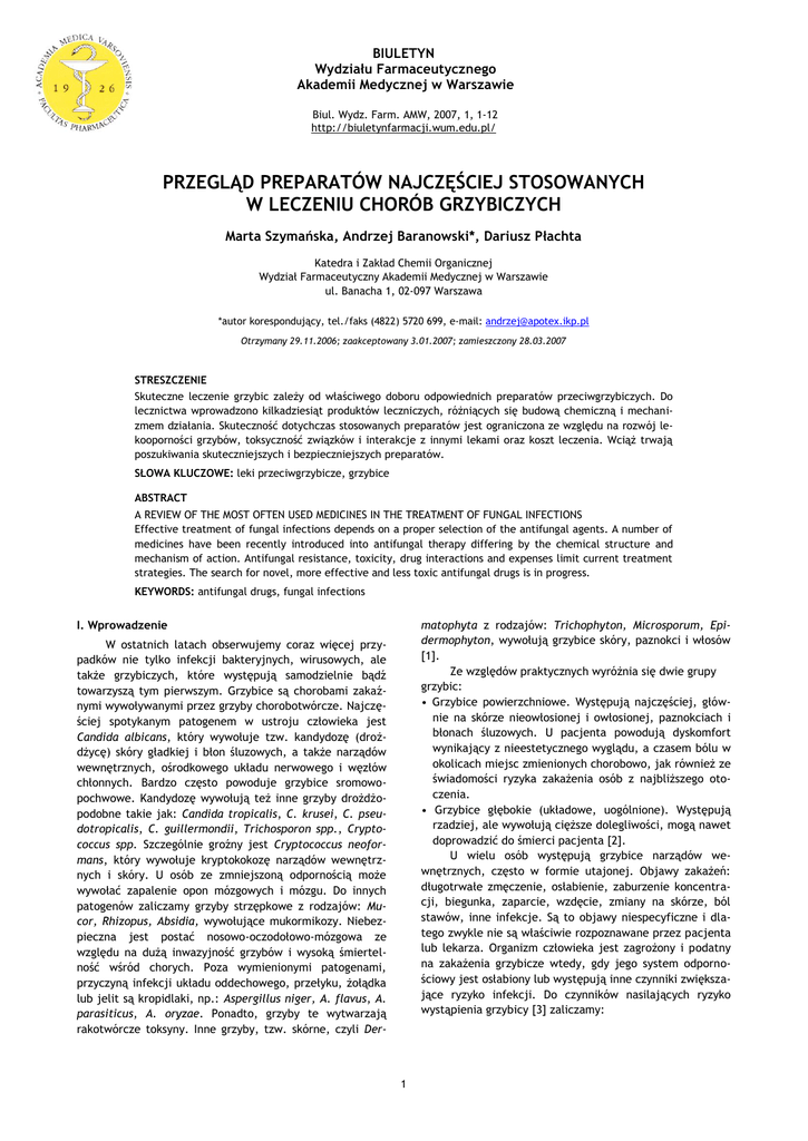 BIULETYN Wydziału Farmaceutycznego Akademii Medycznej w Warszawie Biul. Wydz. Farm. AMW, 2007, 1, 1-12 http://biuletynfarmacji.wum.edu.pl/ PRZEGLĄD PREPARATÓW NAJCZĘŚCIEJ STOSOWANYCH W LECZENIU CHORÓB GRZYBICZYCH Marta Szymańska, Andrzej Baranowski*, Dariusz Płachta Katedra i Zakład Chemii Organicznej Wydział Farmaceutyczny Akademii Medycznej w Warszawie ul. Banacha 1, 02-097 Warszawa *autor korespondujący, tel./faks (4822) 5720 699, e-mail: [email protected] Otrzymany 29.11.2006; zaakceptowany 3.01.2007; zamieszczony 28.03.2007 STRESZCZENIE Skuteczne leczenie grzybic zależy od właściwego doboru odpowiednich preparatów przeciwgrzybiczych. Do lecznictwa wprowadzono kilkadziesiąt produktów leczniczych, różniących się budową chemiczną i mechanizmem działania. Skuteczność dotychczas stosowanych preparatów jest ograniczona ze względu na rozwój lekooporności grzybów, toksyczność związków i interakcje z innymi lekami oraz koszt leczenia. Wciąż trwają poszukiwania skuteczniejszych i bezpieczniejszych preparatów. SŁOWA KLUCZOWE: leki przeciwgrzybicze, grzybice ABSTRACT A REVIEW OF THE MOST OFTEN USED MEDICINES IN THE TREATMENT OF FUNGAL INFECTIONS Effective treatment of fungal infections depends on a proper selection of the antifungal agents. A number of medicines have been recently introduced into antifungal therapy differing by the chemical structure and mechanism of action. Antifungal resistance, toxicity, drug interactions and expenses limit current treatment strategies. The search for novel, more effective and less toxic antifungal drugs is in progress. KEYWORDS: antifungal drugs, fungal infections I. Wprowadzenie matophyta z rodzajów: Trichophyton, Microsporum, Epidermophyton, wywołują grzybice skóry, paznokci i włosów [1]. Ze względów praktycznych wyróżnia się dwie grupy grzybic: • Grzybice powierzchniowe. Występują najczęściej, głównie na skórze nieowłosionej i owłosionej, paznokciach i błonach śluzowych. U pacjenta powodują dyskomfort wynikający z nieestetycznego wyglądu, a czasem bólu w okolicach miejsc zmienionych chorobowo, jak również ze świadomości ryzyka zakażenia osób z najbliższego otoczenia. • Grzybice głębokie (układowe, uogólnione). Występują rzadziej, ale wywołują cięższe dolegliwości, mogą nawet doprowadzić do śmierci pacjenta [2]. U wielu osób występują grzybice narządów wewnętrznych, często w formie utajonej. Objawy zakażeń: długotrwałe zmęczenie, osłabienie, zaburzenie koncentracji, biegunka, zaparcie, wzdęcie, zmiany na skórze, ból stawów, inne infekcje. Są to objawy niespecyficzne i dlatego zwykle nie są właściwie rozpoznawane przez pacjenta lub lekarza. Organizm człowieka jest zagrożony i podatny na zakażenia grzybicze wtedy, gdy jego system odpornościowy jest osłabiony lub występują inne czynniki zwiększające ryzyko infekcji. Do czynników nasilających ryzyko wystąpienia grzybicy [3] zaliczamy: W ostatnich latach obserwujemy coraz więcej przypadków nie tylko infekcji bakteryjnych, wirusowych, ale także grzybiczych, które występują samodzielnie bądź towarzyszą tym pierwszym. Grzybice są chorobami zakaźnymi wywoływanymi przez grzyby chorobotwórcze. Najczęściej spotykanym patogenem w ustroju człowieka jest Candida albicans, który wywołuje tzw. kandydozę (drożdżycę) skóry gładkiej i błon śluzowych, a także narządów wewnętrznych, ośrodkowego układu nerwowego i węzłów chłonnych. Bardzo często powoduje grzybice sromowopochwowe. Kandydozę wywołują też inne grzyby drożdżopodobne takie jak: Candida tropicalis, C. krusei, C. pseudotropicalis, C. guillermondii, Trichosporon spp., Cryptococcus spp. Szczególnie groźny jest Cryptococcus neoformans, który wywołuje kryptokokozę narządów wewnętrznych i skóry. U osób ze zmniejszoną odpornością może wywołać zapalenie opon mózgowych i mózgu. Do innych patogenów zaliczamy grzyby strzępkowe z rodzajów: Mucor, Rhizopus, Absidia, wywołujące mukormikozy. Niebezpieczna jest postać nosowo-oczodołowo-mózgowa ze względu na dużą inwazyjność grzybów i wysoką śmiertelność wśród chorych. Poza wymienionymi patogenami, przyczyną infekcji układu oddechowego, przełyku, żołądka lub jelit są kropidlaki, np.: Aspergillus niger, A. flavus, A. parasiticus, A. oryzae. Ponadto, grzyby te wytwarzają rakotwórcze toksyny. Inne grzyby, tzw. skórne, czyli Der- 1 M. Szymańska et al. /Biul. Wydz. Farm. AMW, 2007, 1, 1-12 - stosowanie antybiotyków, szczególnie tych o szerokim zakresie działania, - stosowanie kortykosteroidów, cytostatyków lub preparatów immunosupresyjnych, - stosowanie chemicznych środków antykoncepcyjnych, - zaburzenia odporności u pacjentów: • z cukrzycą, która osłabia system immunologiczny, • z chorobami nowotworowymi, • z zaburzeniami immunologicznymi, np. u chorych na AIDS, • z chorobami przewlekłymi, np.: astmą, schorzeniami reumatologicznymi, wymagającymi długotrwałego stosowania leków, które mogą mieć niekorzystne działanie na system immunologiczny, • w podeszłym wieku, gdyż u osób, które przekroczyły 50. rok życia paznokcie rosną wolniej, a system odpornościowy ulega osłabieniu, • przeżywających silny, długotrwały stres, - rozpylanie niektórych antybiotyków, np. streptomycyny lub tetracykliny na sady owocowe, - dodawanie antybiotyków do pasz zwierząt hodowlanych, jako stymulatorów wzrostu, - zanieczyszczenie środowiska środkami grzybobójczymi, które zwiększają oporność grzybów, - wady ortopedyczne stóp powodujące przykurcz palców, - noszenie nieodpowiedniego obuwia [4]. Żródłem zakażeń grzybiczych są osoby chore, zwierzęta, a także gleba lub zainfekowane przedmioty. Aby zapobiec infekcji należy przestrzegać zasad higieny osobistej, a więc nie należy nosić cudzego obuwia ani używać wspólnego ręcznika, grzebienia do włosów, itd. Należy zachować ostro