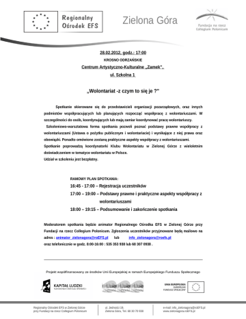 Zielona Góra 28.02.2012, godz.: 17:00 KROSNO ODRZAŃSKIE Centrum Artystyczno-Kulturalne „Zamek”, ul. Szkolna 1 „Wolontariat -z czym to się je ?” Spotkanie skierowane się do przedstawicieli organizacji pozarządowych, oraz innych podmiotów współpracujących lub planujących rozpocząć współpracę z wolontariuszami. W szczególności do osób, koordynujących lub mają zamiar koordynować pracę wolontariuszy. Szkoleniowo-warsztatowa forma spotkania pozwoli poznać podstawy prawne współpracy z wolontariuszami (Ustawa o pożytku publicznym i wolontariacie) i wynikające z niej prawa oraz obowiązki. Ponadto omówione zostaną praktyczne aspekty współpracy z wolontariuszami. Spotkanie poprowadzą koordynatorki Klubu Wolontariatu w Zielonej Górze z wieloletnim doświadczeniem w tematyce wolontariatu w Polsce. Udział w szkoleniu jest bezpłatny. RAMOWY PLAN SPOTKANIA: 16:45 - 17:00 – Rejestracja uczestników 17:00 – 19:00 – Podstawy prawne i praktyczne aspekty współpracy z wolontariuszami 18:00 – 19:15 – Podsumowanie i zakończenie spotkania Moderatorem spotkania będzie animator Regionalnego Ośrodka EFS w Zielonej Górze przy Fundacji na rzecz Collegium Polonicum. Zgłoszenia uczestników przyjmowane będą mailowo na adres : [email protected] lub [email protected] oraz telefonicznie w godz. 8:00-16:00 : 535 353 938 lub 68 307 0938 . Projekt współfinansowany ze środków Unii Europejskiej w ramach Europejskiego Funduszu Społecznego Regionalny Ośrodek EFS w Zielonej Górze przy Fundacji na rzecz Collegium Polonicum ul. Jedności 19, Zielona Góra, Tel. 68 30 70 938 e-mail: [email protected] www.zielonagora.roEFS.pl