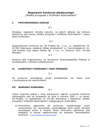 Regulamin konkursu plastycznego „Wielka przygoda z Królikiem Bystrzakiem” I. POSTANOWIENIA OGÓLNE §1 Niniejszy regulamin określa warunki, na jakich odbywa się konkurs plastyczny pod nazwą „Wielka przygoda z Królikiem Bystrzakiem”, zwany dalej konkursem. §2 Organizatorami konkursu są: CD Projekt Sp. z o.o., ul. Jagiellońska 74, 03-301 Warszawa, redakcja „Bliżej przedszkola” ul. Czarnowiejska 8, 31126 Kraków oraz Alpino Polska Sp. z o.o., ul. Poranna 19/2, 53-026 Wrocław. §3 Konkurs jest organizowany na terytorium Rzeczypospolitej Polskiej w przedszkolach i szkołach podstawowych. II. UCZESTNICY KONKURSU I JEGO PRZEBIEG §1 Do konkursu przystępuje grupa z wychowawcą lub nauczycielem. III. przedszkolna lub klasa wraz WARUNKI KONKURSU §1 Celem wygrania jednej z niżej wskazanych nagród, uczestnik konkursu zobowiązany jest do przesłania do dnia 8 czerwca 2007 r. na adres: CD Projekt, ul. Jagiellońska 74, 03-301 Warszawa, z dopiskiem „Wielka przygoda z Królikiem Bystrzakiem” następujących materiałów: a) Formularza zgłoszenia do konkursu wypełnionego przez wychowawcę lub nauczyciela, zawierającego dane osoby dorosłej wysyłającej prace w imieniu dzieci (formularz zgłoszenia jest dostępny w formie elektronicznej na stronach internetowych konkursu – www.inteklasa.pl/krolikbystrzak) Strona 1 z (5) ) b) Prac plastycznych wykonanych dowolną techniką plastyczną, na dowolnym formacie. Na odwrocie każdej z prac muszą się znaleźć dane jej autora: imię i nazwisko, grupa przedszkolna lub klasa, nazwa i adres przedszkola/szkoły. §2 1. Termin uważa się za dotrzymany, jeżeli przesyłka zawierająca prace plastyczne i formularz zgłoszeniowy zostanie przesłana pod wyżej wskazany adres do dnia 8 czerwca 2007 r. O terminie zgłoszenia decyduje data stempla pocztowego. Wszelkie zgłoszenia dokonane po dniu 8 czerwca 2007 r. nie będą rozpatrywane. 2. Nagrody zostaną przyznane w dwóch kategoriach wiekowych: i. Grupy przedszkolne ii. Klasy I-III. 3. Organizatorzy nie są zobowiązani do zwrotu nadesłanych prac. IV NAGRODY §1 1. Spośród nadesłanych prac plastycznych, jury składające się z osób wskazanych przez organizatorów, zwane w dalszej części regulaminu „Jury”, wybierze prace plastyczne, które zostaną nagrodzone. 2. Jury przyzna nagrody grupom przedszkolnym i klasom, które nadesłały najlepsze prace. Spośród wszystkich prac zostaną wybrane najciekawsze, które jury nagrodzi nagrodami indywidualnymi. 3. Nagrodami w konkursie, przyznawanymi przez Jury, są: - nagrody dla grup przedszkolnych i klas – 500 zestawów komputerowych programów edukacyjnych „Królik Bystrzak” oraz programów do nauki matematyki, 50 zestawów plastycznych, 10 rocznych prenumerat miesięcznika „Bliżej przedszkola”, 10 kwartalnych prenumerat „Świerszczyka” oraz 20 podkładek pod mysz od portalu Interklasa. - nagrody indywidualne dla autorów najlepszych prac – koszulki z logo Królika Bystrzaka, książki oraz puzzle. 4. Decyzja Jury co do wyboru nagrodzonych prac jest ostateczna i nie podlega zaskarżeniu. 5. Jury dokona wyboru prac plastycznych oraz przyzna nagrody w terminie do dnia 13 czerwca 2007 r. Strona 2 z (5) ) 6. Lista nagrodzonych placówek oraz autorów prac będzie dostępna w siedzibie organizatorów oraz umieszczona na stronie internetowej konkursu (www.interklasa.pl/krolikbystrzak) w dniu 14 czerwca 2007 r. 7. Nagrody zostaną przesłane ogłoszeniu wyników konkursu. do zwycięzców niezwłocznie po 8. Prawo uczestnika konkursu do domagania się wydania którejkolwiek z nagród lub wyróżnień, określonych niniejszym regulaminem, jest niezbywalne. 9. Nagrody i wyróżnienia nie podlegają wymianie na jakikolwiek ekwiwalent. 10. Organizatorzy nie ponoszą odpowiedzialności za niezawinione przez organizatora działania P.P.U.P. „ Poczty Polskiej”. 11. Organizatorzy konkursu zapewniają sobie prawo do prezentacji prac plastycznych na wystawach oraz na internetowej stronie konkursu (www.interklasa.pl/krolikbystrzak). §2 W przypadku zmiany wskazanego w Formularzu zgłoszeniowym adresu szkoły uczestnik konkursu powinien niezwłocznie zawiadomić o tym fakcie organizatorów na piśmie, podając nowy adres. §3 Regulamin w jego pełnym brzmieniu będzie dostępny do wglądu dla uczestników konkursu pod adresem organizatorów, wskazanym w § 2 niniejszego regulaminu oraz na stronie internetowej (www.interklasa.pl/krolikbystrzak). V. POSTĘPOWANIE REKLAMACYJNE §1 1. Wszelkie reklamacje z tytułu organizowanego konkursu, które mogą być wnoszone przez jej uczestników, powinny być składane organizatorom na piśmie do dnia 30 czerwca 2007 r. Strona 3 z (5) ) 2. Organizatorzy, w terminie 30 (trzydzieści) dni od otrzymania reklamacji, rozpatrzą zgłoszoną reklamację i pisemnie poinformują zgłaszającego o zajętym stanowisku. 3. W przypadku braku akceptacji przez uczestnika konkursu stanowiska organizatorów, o którym mowa w ust. 2 powyżej, uczestnik może dochodzić swych praw na zasadach ogólnych. Strona 4 z (5) )