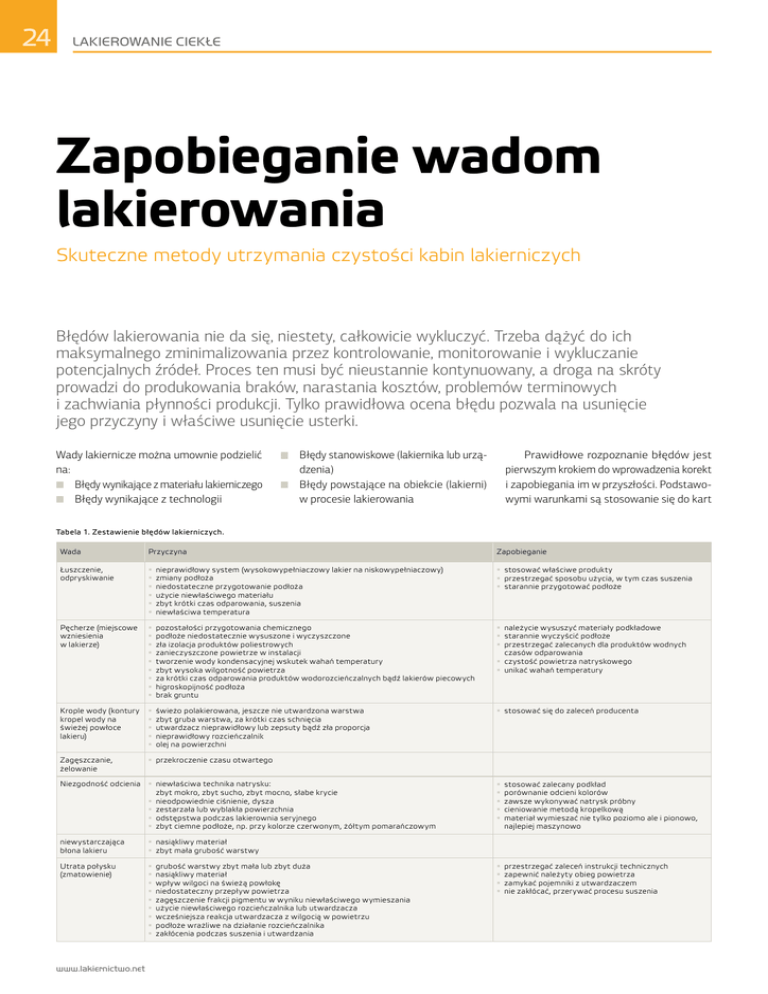 24 lakierowanie ciekłe Zapobieganie wadom lakierowania Skuteczne metody utrzymania czystości kabin lakierniczych Błędów lakierowania nie da się, niestety, całkowicie wykluczyć. Trzeba dążyć do ich maksymalnego zminimalizowania przez kontrolowanie, monitorowanie i wykluczanie potencjalnych źródeł. Proces ten musi być nieustannie kontynuowany, a droga na skróty prowadzi do produkowania braków, narastania kosztów, problemów terminowych i zachwiania płynności produkcji. Tylko prawidłowa ocena błędu pozwala na usunięcie jego przyczyny i właściwe usunięcie usterki. Wady lakiernicze można umownie podzielić na: Błędy wynikające z materiału lakierniczego Błędy wynikające z technologii Błędy stanowiskowe (lakiernika lub urządzenia) Błędy powstające na obiekcie (lakierni) w procesie lakierowania Prawidłowe rozpoznanie błędów jest pierwszym krokiem do wprowadzenia korekt i zapobiegania im w przyszłości. Podstawowymi warunkami są stosowanie się do kart Tabela 1. Zestawienie błędów lakierniczych. Wada Przyczyna Zapobieganie Łuszczenie, odpryskiwanie nieprawidłowy system (wysokowypełniaczowy lakier na niskowypełniaczowy) zmiany podłoża niedostateczne przygotowanie podłoża użycie niewłaściwego materiału zbyt krótki czas odparowania, suszenia niewłaściwa temperatura stosować właściwe produkty przestrzegać sposobu użycia, w tym czas suszenia starannie przygotować podłoże Pęcherze (miejscowe wzniesienia w lakierze) pozostałości przygotowania chemicznego podłoże niedostatecznie wysuszone i wyczyszczone zła izolacja produktów poliestrowych zanieczyszczone powietrze w instalacji tworzenie wody kondensacyjnej wskutek wahań temperatury zbyt wysoka wilgotność powietrza za krótki czas odparowania produktów wodorozcieńczalnych bądź lakierów piecowych higroskopijność podłoża brak gruntu należycie wysuszyć materiały podkładowe starannie wyczyścić podłoże przestrzegać zalecanych dla produktów wodnych czasów odparowania czystość powietrza natryskowego unikać wahań temperatury Krople wody (kontury kropel wody na świeżej powłoce lakieru) świeżo polakierowana, jeszcze nie utwardzona warstwa zbyt gruba warstwa, za krótki czas schnięcia utwardzacz nieprawidłowy lub zepsuty bądź zła proporcja nieprawidłowy rozcieńczalnik olej na powierzchni stosować się do zaleceń producenta Zagęszczanie, żelowanie przekroczenie czasu otwartego Niezgodność odcienia niewłaściwa technika natrysku: zbyt mokro, zbyt sucho, zbyt mocno, słabe krycie nieodpowiednie ciśnienie, dysza zestarzała lub wyblakła powierzchnia odstępstwa podczas lakierownia seryjnego zbyt ciemne podłoże, np. przy kolorze czerwonym, żółtym pomarańczowym niewystarczająca błona lakieru nasiąkliwy materiał zbyt mała grubość warstwy Utrata połysku (zmatowienie) grubość warstwy zbyt mała lub zbyt duża nasiąkliwy materiał wpływ wilgoci na świeżą powłokę niedostateczny przepływ powietrza zagęszczenie frakcji pigmentu w wyniku niewłaściwego wymieszania użycie niewłaściwego rozcieńczalnika lub utwardzacza wcześniejsza reakcja utwardzacza z wilgocią w powietrzu podłoże wrażliwe na działanie rozcieńczalnika zakłócenia podczas suszenia i utwardzania www.lakiernictwo.net stosować zalecany podkład porównanie odcieni kolorów zawsze wykonywać natrysk próbny cieniowanie metodą kropelkową materiał wymieszać nie tylko poziomo ale i pionowo, najlepiej maszynowo przestrzegać zaleceń instrukcji technicznych zapewnić należyty obieg powietrza zamykać pojemniki z utwardzaczem nie zakłócać, przerywać procesu suszenia lakierowanie ciekłe Wada Przyczyna Zapobieganie Zła przyczepność niewystarczające przygotowanie podłoża niewłaściwe podłoże tworzenie wody kondensacyjnej wskutek wahań temperatury i przekroczenia punktu rosy nieprawidłowy system zbyt krótkie czasy suszenia/odparowania niedostateczna reakcja z podłożem wskutek przekroczenia czasu otwartego stosować się do zaleceń producentów Wznoszenie/ marszczenie (powłoka nawierzchniowa wznosi się i marszczy) przeszlifowanie do warstwy bazowej nieizolowanej izolowane niewłaściwym wypełniaczem wypełniacz niewłaściwie nałożony powierzchnia niedostatecznie wysuszona zastosowanie niewłaściwego zestawu podkładu, lakieru i rozcieńczalnika nieutwardzona lub rozpuszczalna poprzednia warstwa lakieru (np. świeże farby alkidowe) niewłaściwe podłoże, np. wrażliwe tworzywo zbyt grube warstwy podnoszenie w wyniku zbyt wczesnego lub zbyt późnego polakierowania (dotyczy szczególnie systemów alkidowych) test rozcieńczalnikowy izolować wypełniaczem 2-skł., aplikując go kilkoma cienkimi warstwami i przestrzegając czasów odparowania unikać przeszlifowań zachować zalecane czasy schnięcia wrażliwe podłoża usunąć lub izolować Zażółcenie lakieru bezbarwnego nieprawidłowy utwardzacz utwardzacz zamykać szczelnie po użyciu zachować stosunek lakier/utwardzacz wg zaleceń Zgazowanie (częściowo popękane pęcherzyki rozcieńczalnika lub powietrza) niedokładnie wysuszony wypełniacz lakier naniesiony za grubo niedotrzymanie zalecanej lepkości, ciśnienia za krótkie czasy odparowania między aplikacjami zbyt długie czasy odparowania przed suszeniem piecowym lub IR zbyt wysokie temperatury podczas suszenia IR w lakierowaniu „mokro na mokro” zbyt krótkie czasy odparowania nieprawidłowy utwardzacz lub rozcieńczalnik przerwane suszenie skorygować grubość warstwy regularnie sprawdzać utwardzacz przestrzegać czasów odparowania kontrolować temperaturę pieca stosować się do zaleceń producenta Kratery, rybie oczka zanieczyszczenia silikonem, olejem, woskiem, tłuszczem zanieczyszczone powietrze w instalacji wodą kondensacyjną lub olejem opad pyłu zbyt krótki czas odparowania skrupulatne pilnowanie czystości i nieużywania produktów zawierających silikon regularna konserwacja separatora wody i olej