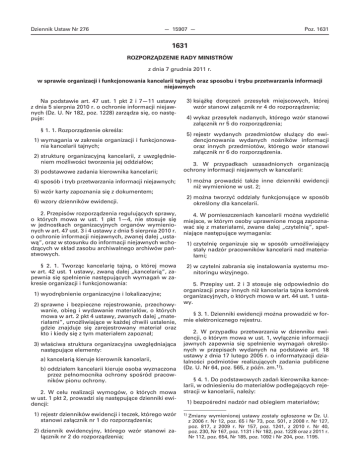 Dziennik Ustaw Nr 276 — 15907 — Poz. 1631 1631 ROZPORZĄDZENIE RADY MINISTRÓW z dnia 7 grudnia 2011 r. w sprawie organizacji i funkcjonowania kancelarii tajnych oraz sposobu i trybu przetwarzania informacji niejawnych Na podstawie art. 47 ust. 1 pkt 2 i 7—11 ustawy z dnia 5 sierpnia 2010 r. o ochronie informacji niejawnych (Dz. U. Nr 182, poz. 1228) zarządza się, co następuje: § 1. 1. Rozporządzenie określa: 1) wymagania w zakresie organizacji i funkcjonowania kancelarii tajnych; 2) strukturę organizacyjną kancelarii, z uwzględnieniem możliwości tworzenia jej oddziałów; 3) podstawowe zadania kierownika kancelarii; 4) sposób i tryb przetwarzania informacji niejawnych; 3) książkę doręczeń przesyłek miejscowych, której wzór stanowi załącznik nr 4 do rozporządzenia; 4) wykaz przesyłek nadanych, którego wzór stanowi załącznik nr 5 do rozporządzenia; 5) rejestr wydanych przedmiotów służący do ewidencjonowania wydanych nośników informacji oraz innych przedmiotów, którego wzór stanowi załącznik nr 6 do rozporządzenia. 3. W przypadkach uzasadnionych organizacją ochrony informacji niejawnych w kancelarii: 1) można prowadzić także inne dzienniki ewidencji niż wymienione w ust. 2; 5) wzór karty zapoznania się z dokumentem; 6) wzory dzienników ewidencji. 2) można tworzyć oddziały funkcjonujące w sposób określony dla kancelarii. 2. Przepisów rozporządzenia regulujących sprawy, o których mowa w ust. 1 pkt 1—4, nie stosuje się w jednostkach organizacyjnych organów wymienionych w art. 47 ust. 3 i 4 ustawy z dnia 5 sierpnia 2010 r. o ochronie informacji niejawnych, zwanej dalej „ustawą”, oraz w stosunku do informacji niejawnych wchodzących w skład zasobu archiwalnego archiwów państwowych. 4. W pomieszczeniach kancelarii można wydzielić miejsce, w którym osoby uprawnione mogą zapoznawać się z materiałami, zwane dalej „czytelnią”, spełniające następujące wymagania: § 2. 1. Tworząc kancelarię tajną, o której mowa w art. 42 ust. 1 ustawy, zwaną dalej „kancelarią”, zapewnia się spełnienie następujących wymagań w zakresie organizacji i funkcjonowania: 2) w czytelni zabrania się instalowania systemu monitoringu wizyjnego. 1) wyodrębnienie organizacyjne i lokalizacyjne; 2) sprawne i bezpieczne rejestrowanie, przechowywanie, obieg i wydawanie materiałów, o których mowa w art. 2 pkt 4 ustawy, zwanych dalej „materiałami”, umożliwiające w każdej chwili ustalenie, gdzie znajduje się zarejestrowany materiał oraz kto i kiedy się z tym materiałem zapoznał; 3) właściwa struktura organizacyjna uwzględniająca następujące elementy: a) kancelarią kieruje kierownik kancelarii, b) oddziałem kancelarii kieruje osoba wyznaczona przez pełnomocnika ochrony spośród pracowników pionu ochrony. 2. W celu realizacji wymogów, o których mowa w ust. 1 pkt 2, prowadzi się następujące dzienniki ewidencji: 1) rejestr dzienników ewidencji i teczek, którego wzór stanowi załącznik nr 1 do rozporządzenia; 2) dziennik ewidencyjny, którego wzór stanowi załącznik nr 2 do rozporządzenia; 1) czytelnię organizuje się w sposób umożliwiający stały nadzór pracowników kancelarii nad materiałami; 5. Przepisy ust. 2 i 3 stosuje się odpowiednio do organizacji pracy innych niż kancelaria tajna komórek organizacyjnych, o których mowa w art. 44 ust. 1 ustawy. § 3. 1. Dzienniki ewidencji można prowadzić w formie elektronicznego rejestru. 2. W przypadku przetwarzania w dzienniku ewidencji, o którym mowa w ust. 1, wyłącznie informacji jawnych zapewnia się spełnienie wymagań określonych w przepisach wydanych na podstawie art. 18 ustawy z dnia 17 lutego 2005 r. o informatyzacji działalności podmiotów realizujących zadania publiczne (Dz. U. Nr 64, poz. 565, z późn. zm.1)). § 4. 1. Do podstawowych zadań kierownika kancelarii, w odniesieniu do materiałów podlegających rejestracji w kancelarii, należy: 1) bezpośredni nadzór nad obiegiem materiałów; 1) Zmiany wymienionej ustawy zostały ogłoszone w Dz. U. z 2006 r. Nr 12, poz. 65 i Nr 73, poz. 501, z 2008 r. Nr 127, poz. 817, z 2009 r. Nr 157, poz. 1241, z 2010 r. Nr 40, poz. 230, Nr 167, poz. 1131 i Nr 182, poz. 1228 oraz z 2011 r. Nr 112, poz. 654, Nr 185, poz. 1092 i Nr 204, poz. 1195. Dziennik Ustaw Nr 276 — 15908 — 2) udostępnianie materiałów osobom do tego uprawnionym; 3) wydawanie materiałów osobom do tego uprawnionym, które zapewniają odpowiednie warunki do ich przechowywania; 4) egzekwowanie zwrotu materiałów; 5) kontrola przestrzegania właściwego oznaczania i rejestrowania materiałów w kancelarii oraz jednostce organizacyjnej; 6) nadzór nad pracą oddziałów kancelarii. 2. Osoba kierująca oddziałem kancelarii wykonuje obowiązki kierownika kancelarii określone w ust. 1 pkt 1—5. § 5. 1. W przypadku zmiany na stanowisku kierownika kancelarii lub osoby kierującej oddziałem kancelarii sporządza się protokół zdawczo-odbiorczy. 2. Protokół, o którym mowa w ust. 1, sporządza się w obecności osoby zdającej obowiązki, osoby przejmującej obowiązki oraz pełnomocnika ochrony lub upoważnionej przez niego osoby. Protokół sporządza się w dwóch egzemplarzach; pierwszy egzemplarz przechowuje się w kancelarii, drugi przechowuje pełnomocnik ochrony. 3. W przypadku czasowej nieobecności kierownika kancelarii lub osoby kierującej oddziałem kancelarii ich obowiązki przejmuje pełnomocnik ochrony lub pracownik kancelarii pisemnie przez niego upoważniony. § 6. 1. Po zakończeniu pracy kierownik kancelarii lub inny upoważniony pracownik jest obowiązany sprawdzić prawidłowość zamknięcia szaf i pomieszczeń kancelarii. 2. Wszelkie przypadki naruszenia zasad ochrony informacji niejawnych należy niezwłocznie zgłaszać pełnomocnikowi ochrony. Poz. 1631 5. Po otwarciu przesyłki kierownik kancelarii tajnej lub inny upoważniony pracownik komórki organizacyjnej, w której rejestrow