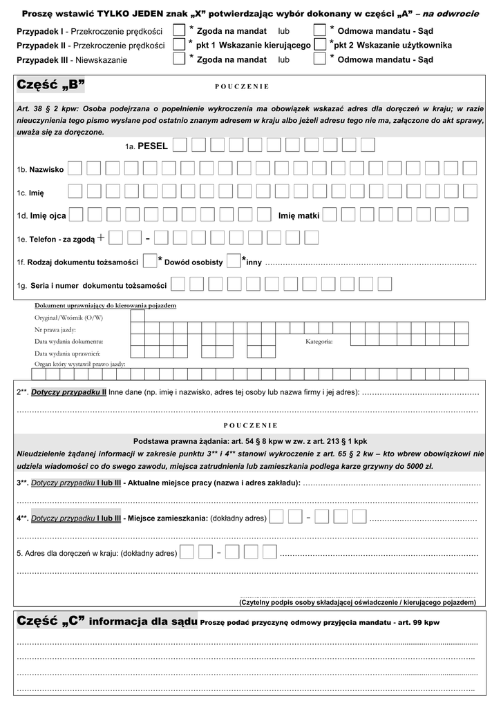 Proszę wstawić TYLKO JEDEN znak „X” potwierdzając wybór dokonany w części „A” – na odwrocie Przypadek I - Przekroczenie prędkości Przypadek II - Przekroczenie prędkości Przypadek III - Niewskazanie * Zgoda na mandat lub * pkt 1 Wskazanie kierującego * Zgoda na mandat lub * Odmowa mandatu - Sąd *pkt 2 Wskazanie użytkownika Odmowa mandatu- Sąd - Sąd (pkt 2) * Odmowa mandatu lub lub Wskazanie użytkownika (pkt 2) lub Część „B” Odmowa mandatu - Sąd (pkt 2) POUCZENIE Art. 38 § 2 kpw: Osoba podejrzana o popełnienie wykroczenia ma obowiązek wskazać adres dla doręczeń w kraju; w razie nieuczynienia tego pismo wysłane pod ostatnio znanym adresem w kraju albo jeżeli adresu tego nie ma, załączone do akt sprawy, uważa się za doręczone. 1a. PESEL 1b. Nazwisko 1c. Imię 1d. Imię ojca Imię matki 1e. Telefon - za zgodą + - 1f. Rodzaj dokumentu tożsamości * Dowód osobisty *inny ………………………………………………………………………… 1g. Seria i numer dokumentu tożsamości Dokument uprawniający do kierowania pojazdem Oryginał/Wtórnik (O/W) Nr prawa jazdy: Data wydania dokumentu: Kategoria: Data wydania uprawnień: Organ który wystawił prawo jazdy: 2**. Dotyczy przypadku II Inne dane (np. imię i nazwisko, adres tej osoby lub nazwa firmy i jej adres): ………………………..……………… ………………………………………………………………………………………………………………………………………………………………… POUCZENIE Podstawa prawna żądania: art. 54 § 8 kpw w zw. z art. 213 § 1 kpk Nieudzielenie żądanej informacji w zakresie punktu 3** i 4** stanowi wykroczenie z art. 65 § 2 kw – kto wbrew obowiązkowi nie udziela wiadomości co do swego zawodu, miejsca zatrudnienia lub zamieszkania podlega karze grzywny do 5000 zł. 3**. Dotyczy przypadku I lub III - Aktualne miejsce pracy (nazwa i adres zakładu): ………………………………………………………..…… ………………………………………………………………………………………………………………………………………………………………… 4**. Dotyczy przypadku I lub III - Miejsce zamieszkania: (dokładny adres) - ………….………………………… ………………………………………………………………………………………………………………………………………………………………… 5. Adres dla doręczeń w kraju: (dokładny adres) - ………………………………………….………………………… ………………………………………………………………………………………………………………………………………………………………… ………..…………….…………………………………………………………………………..…..…………. (Czytelny podpis osoby składającej oświadczenie / kierującego pojazdem) Część „C” informacja dla sądu Proszę podać przyczynę odmowy przyjęcia mandatu - art. 99 kpw …………………………………………………………………………………………………………………………………........................................... ……………………………………………………………………………………………………………………………………………………………….. …………………………………………………………………………………………………………………………………........................................... ……………………………………………………………………………………………………………………………………………………………….. Proszę zapoznać się z instrukcją na drugiej stronie raportu ze zdarzenia, po czym wypełnić czytelnie oświadczenie, niepotrzebne skreślić, uzupełnić właściwe dane, także na drugiej stronie, a następnie podpisać i odesłać na adres Straży Miejskiej w Bochni lub pocztą mailową na adres [email protected] w terminie do 7 dni od otrzymania CZĘŚĆ „A” Uwaga bardzo ważne. Na tej stronie proszę złożyć tylko JEDEN czytelny podpis. O Ś W I A D C Z E N I E - Nr SPRAWY - ............................(wpisać) PRZYPADEK I wypełnia kierujący pojazdem. Oświadczam, że to JA kierowałem/-am pojazdem o nr rej. ………………. w dniu ………………, którym przekroczyłem/-am dozwoloną prędkość o ……. km/h. Art. 97 § 2 kodeksu postępowania w sprawach o wykroczenia – sprawca wykroczenia ma prawo odmówić przyjęcia mandatu karnego. ZGODA na mandat za przekroczenie prędkości ODMOWA przyjęcia mandatu za przekroczenie prędkości Pouczony o prawie odmowy przyjęcia mandatu przyjmuję mandat karny Pouczony o treści art. 97 § 2 kpw odmawiam przyjęcia mandatu z art. 92a kw. kredytowany w wysokości ……. zł i …. pkt karny/-e/-ych z art. 92a kw Wiem, że będzie to skutkować skierowaniem sprawy do sądu. …………………… ………….……………………………… (data) (Imię i nazwisko kierującego pojazdem) …………………… Proszę wypełnić część „B” na drugiej stronie. PRZYPADEK II ………….……………………………… (data) (Imię i nazwisko kierującego pojazdem) Proszę wypełnić część „B” i „C” na drugiej stronie. wypełnia właściciel/posiadacz pojazdu wskazujący osobę, której powierzył pojazd do kierowania lub używania. Świadom treści art. 78 ust. 4 i 5 ustawy prawo o ruchu drogowym (tekst w instrukcji) oświadczam, że osobą, której powierzyłem pojazd o nr rej. Pkt.1 * do kierowania - wstawić znak „X” - zaznaczając pkt 1 wypełnić część „B” na drugiej stronie. * do używania - wstawić znak „X” Pkt. 2 - zaznacza