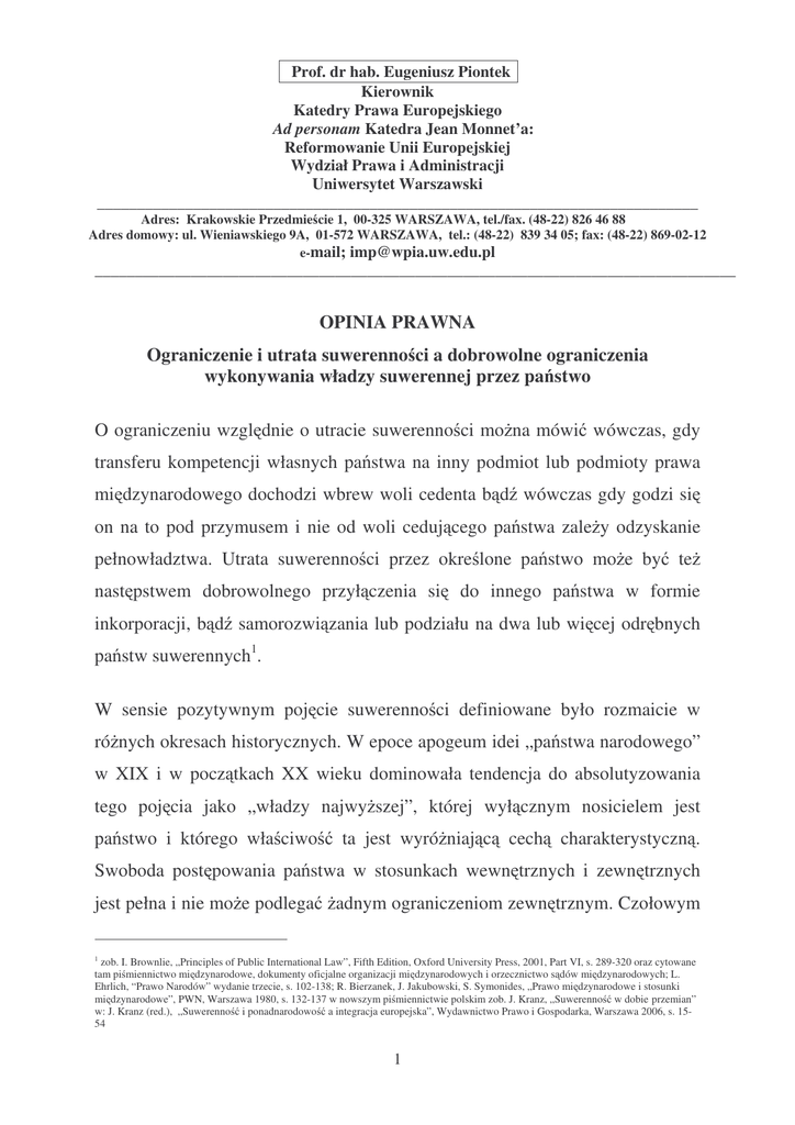 Prof. dr hab. Eugeniusz Piontek Kierownik Katedry Prawa Europejskiego Ad personam Katedra Jean Monnet’a: Reformowanie Unii Europejskiej Wydział Prawa i Administracji Uniwersytet Warszawski ___________________________________________________________________________ Adres: Krakowskie Przedmie cie 1, 00-325 WARSZAWA, tel./fax. (48-22) 826 46 88 Adres domowy: ul. Wieniawskiego 9A, 01-572 WARSZAWA, tel.: (48-22) 839 34 05; fax: (48-22) 869-02-12 e-mail; [email protected] ________________________________________________________________________________ OPINIA PRAWNA Ograniczenie i utrata suwerenno ci a dobrowolne ograniczenia wykonywania władzy suwerennej przez pa stwo O ograniczeniu wzgl dnie o utracie suwerenno ci mo na mówi wówczas, gdy transferu kompetencji własnych pa stwa na inny podmiot lub podmioty prawa mi dzynarodowego dochodzi wbrew woli cedenta b d wówczas gdy godzi si on na to pod przymusem i nie od woli ceduj cego pa stwa zale y odzyskanie pełnowładztwa. Utrata suwerenno ci przez okre lone pa stwo mo e by te nast pstwem dobrowolnego przył czenia si do innego pa stwa w formie inkorporacji, b d samorozwi zania lub podziału na dwa lub wi cej odr bnych pa stw suwerennych1. W sensie pozytywnym poj cie suwerenno ci definiowane było rozmaicie w ró nych okresach historycznych. W epoce apogeum idei „pa stwa narodowego” w XIX i w pocz tkach XX wieku dominowała tendencja do absolutyzowania tego poj cia jako „władzy najwy szej”, której wył cznym nosicielem jest pa stwo i którego wła ciwo ta jest wyró niaj c cech charakterystyczn . Swoboda post powania pa stwa w stosunkach wewn trznych i zewn trznych jest pełna i nie mo e podlega adnym ograniczeniom zewn trznym. Czołowym 1 zob. I. Brownlie, „Principles of Public International Law”, Fifth Edition, Oxford University Press, 2001, Part VI, s. 289-320 oraz cytowane tam pi miennictwo mi dzynarodowe, dokumenty oficjalne organizacji mi dzynarodowych i orzecznictwo s dów mi dzynarodowych; L. Ehrlich, “Prawo Narodów” wydanie trzecie, s. 102-138; R. Bierzanek, J. Jakubowski, S. Symonides, „Prawo mi dzynarodowe i stosunki mi dzynarodowe”, PWN, Warszawa 1980, s. 132-137 w nowszym pi miennictwie polskim zob. J. Kranz, „Suwerenno w dobie przemian” w: J. Kranz (red.), „Suwerenno i ponadnarodowo a integracja europejska”, Wydawnictwo Prawo i Gospodarka, Warszawa 2006, s. 1554 1 przedstawicielem tej orientacji doktrynalnej był niemiecki filozof Georg Wilhelm Friedrich Hegel. Id cy w jego lady, profesor prawa w Heidelbergu i Bazylei, Georg Jellinek dowodził, e „tam gdzie stosowanie si do prawa narodów wchodzi w konflikt z istnieniem pa stwa, tam (…) ust puje norma prawna (…) prawo narodów istnieje dla pa stw, a nie pa stwa dla prawa narodów2. Pod wpływem takiego rozumienia wzajemnych relacji mi dzy wol i interesem pa stwa a prawem mi dzynarodowym, S d Rzeszy w orzeczeniu z 1 listopada 1922 r. nie zawahał si stwierdzi , jakoby „jest zasad uznan w prawie mi dzynarodowym, e prawo samozachowania pa stwa jest wy sze od wszelkich zobowi za przyj tych w traktatach”3. Pół wieku pó niej, oceniaj c takie podej cie do koncepcji suwerenno ci, jeden z wybitnych badaczy tej problematyki napisał, e „jest w tpliwe, czy jakiekolwiek pojedyncze słowo spowodowało kiedykolwiek tak du o intelektualnego zamieszania i bezprawia mi dzynarodowego”4. W ka dym b d kategoriach absolutnych jest ju razie pojmowanie suwerenno ci w od dawna poczytywane za szkodliwy anachronizm5. Współcze nie przewa a pogl d, e suwerenno jest cech jako ciow pa stwa. Polega ona na zdolno ci oraz wolno ci wyboru sposobów wykonywania przez pa stwo jego funkcji i nie ma nic wspólnego z wszechwładz , czy arbitralno ci 6. Suwerenno mo na wi c uzna za synonim pełnowładztwa w rozumieniu jako ciowym, lecz nie jako sumy wszystkich kompetencji władczych, czy cho by tylko ich spornego sk din d co do tre ci tzw. „rdzenia”, które koniecznie musz by wykonywane bezpo rednio przez samo pa stwo7. 2 G. Jellinek, „Allgemeine Staatslehre”, 1814, s. 377 zob. Entscheidungen des Reichgericht in Zivilsachen (RGZS), CV 326, 328 4 zob. P. Malanczuk, „Akehurst’s Modern Introduction to International Law” (7ed.) 1977, s. 17 5 zob. szerzej: A. Raczy ska, „Reinterpretacja poj cia suwerenno ci wobec członkostwa w Unii Europejskiej”, (2001) 1, Przegl d Europejski s. 101-192) 6 zob. J. Kranz, op.cit., w szczególno ci s. 19 oraz 30-38 i cytowane tam pi miennictwo polskie i obce 7 Jak dowodzi prof. Cezary Mik: „suwerenno nale y ujmowa w kategoriach normatywnych, tj. jako niezbywalny składnik pojmowania pa stwa, ródło jego wszelkich kompetencji (…) jako pierwotne ródło władzy pa stwowej, a nie jako sum kompetencji władczych (…)” C. Mik, „Powierzenie Unii Europejskiej władzy przez pa stwa członkowskie i jego podstawowe konsekwencje prawne”, w: J. Kranz, op.cit. s. 92; por. S. Biele , „Suwerenno pa stw a integracja europejska – wpływy i zale no ci” w: „Integracja europejska, 3 2 Jak trafnie uj ł to syntetycznie prof. Jerzy Pie kos: „Pa stwo z mocy swej samowładno ci mo e kształtowa zakres i sposób wykonywania swej suwerenno ci. Przyjmuj c w płaszczy nie prawa mi dzynarodowego okre lone zobowi zania do działania, zaniechania lub znoszenia, pa stwo nie umniejsza (nie ogranicza) swej suwerenno ci, a jedynie ogranicza jej wykonywanie. Ograniczenie wykonywania suwerenno ci nast puje w ka dej umowie mi dzynarodowej zobowi zuj cej pa stwo do okre lonego zachowania; mo e wynika tak e z norm prawa zwyczajowego. Takie ograniczenie wykonywania suwerenno ci nie narusza istoty suwerenno ci pa stwa: dysponentem uprawnienia pozostaje nadal pa stwo”8, jak ma to wła nie miejsce w wypadku poło enia prawnego pa stw członkowskich Unii Europejskiej. Ju w orzeczeniu z 1923 roku w sprawie statku „Wimbledon” Stały Trybunał Sprawiedliwo ci Mi dzynarodowej (Ligi Narodów) stwierdził jednoznacznie, e: „… odmawia dopat