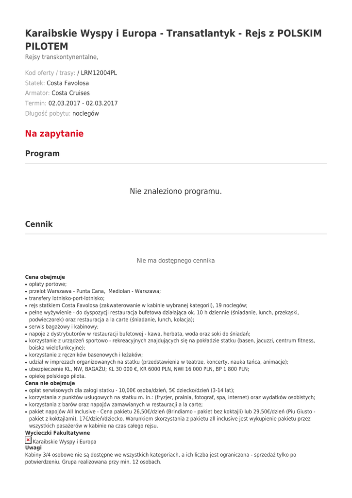 Karaibskie Wyspy i Europa - Transatlantyk - Rejs z POLSKIM PILOTEM Rejsy transkontynentalne, Kod oferty / trasy: / LRM12004PL Statek: Costa Favolosa Armator: Costa Cruises Termin: 02.03.2017 - 02.03.2017 Długość pobytu: noclegów Na zapytanie Program Nie znaleziono programu. Cennik Nie ma dostępnego cennika Cena obejmuje opłaty portowe; przelot Warszawa - Punta Cana, Mediolan - Warszawa; transfery lotnisko-port-lotnisko; rejs statkiem Costa Favolosa (zakwaterowanie w kabinie wybranej kategorii), 19 noclegów; pełne wyżywienie - do dyspozycji restauracja bufetowa działająca ok. 10 h dziennie (śniadanie, lunch, przekąski, podwieczorek) oraz restauracja a la carte (śniadanie, lunch, kolacja); serwis bagażowy i kabinowy; napoje z dystrybutorów w restauracji bufetowej - kawa, herbata, woda oraz soki do śniadań; korzystanie z urządzeń sportowo - rekreacyjnych znajdujących się na pokładzie statku (basen, jacuzzi, centrum fitness, boiska wielofunkcyjne); korzystanie z ręczników basenowych i leżaków; udział w imprezach organizowanych na statku (przedstawienia w teatrze, koncerty, nauka tańca, animacje); ubezpieczenie KL, NW, BAGAŻU; KL 30 000 €, KR 6000 PLN, NWI 16 000 PLN, BP 1 800 PLN; opiekę polskiego pilota. Cena nie obejmuje opłat serwisowych dla załogi statku - 10,00€ osoba/dzień, 5€ dziecko/dzień (3-14 lat); korzystania z punktów usługowych na statku m. in.: (fryzjer, pralnia, fotograf, spa, internet) oraz wydatków osobistych; korzystania z barów oraz napojów zamawianych w restauracji a la carte; pakiet napojów All Inclusive - Cena pakietu 26,50€/dzień (Brindiamo - pakiet bez koktajli) lub 29,50€/dzień (Piu Giusto pakiet z koktajlami), 17€/dzień/dziecko. Warunkiem skorzystania z pakietu all inclusive jest wykupienie pakietu przez wszystkich pasażerów w kabinie na czas całego rejsu. Wycieczki Fakultatywne ● ● ● ● ● ● ● ● ● ● ● ● ● ● ● ● Karaibskie Wyspy i Europa Uwagi Kabiny 3/4 osobowe nie są dostępne we wszystkich kategoriach, a ich liczba jest ograniczona - sprzedaż tylko po potwierdzeniu. Grupa realizowana przy min. 12 osobach. Transport Przelot samolotem: Wylot w dniu rozpoczęcia rejsu, powrót wieczorny w dniu zakończenia rejsu. W cenie zawarte transfery lotnisko/port/lotnisko. Przy wylotach z Warszawy dla chętnych możliwość skorzystania z transferu na lotnisko w Warszawie (opcjonalnie) - cena 50€/os. w dwie strony * * miejsca wsiadania: Kraków, Katowice, Żory, Rybnik, Częstochowa. Możliwy transfer z Wrocławia przy minimum 6 osobach. Opublikowane informacje nie stanowią oferty handlowej w rozumieniu kodeksu cywilnego