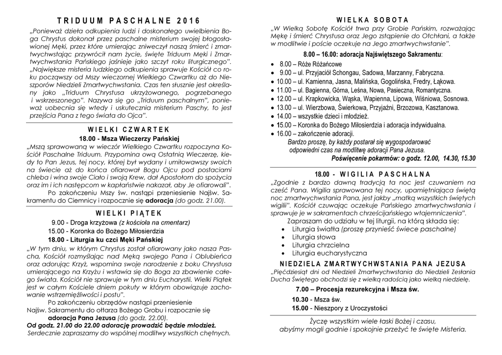 WIELKA SOBOTA TRIDUUM PASCHALNE 2016 „Ponieważ dzieła odkupienia ludzi i doskonałego uwielbienia Boga Chrystus dokonał przez paschalne misterium swojej błogosławionej Męki, przez które umierając zniweczył naszą śmierć i zmartwychwstając przywrócił nam życie, święte Triduum Męki i Zmartwychwstania Pańskiego jaśnieje jako szczyt roku liturgicznego”. „Największe misteria ludzkiego odkupienia sprawuje Kościół co roku począwszy od Mszy wieczornej Wielkiego Czwartku aż do Nieszporów Niedzieli Zmartwychwstania. Czas ten słusznie jest określany jako „Triduum Chrystusa ukrzyżowanego, pogrzebanego i wskrzeszonego”. Nazywa się go „Triduum paschalnym”, ponieważ uobecnia się wtedy i uskutecznia misterium Paschy, to jest przejścia Pana z tego świata do Ojca”. WIELKI CZWARTEK 18.00 - Msza Wieczerzy Pańskiej „Mszą sprawowaną w wieczór Wielkiego Czwartku rozpoczyna Kościół Paschalne Triduum. Przypomina ową Ostatnią Wieczerzę, kiedy to Pan Jezus, tej nocy, której był wydany i umiłowawszy swoich na świecie aż do końca ofiarował Bogu Ojcu pod postaciami chleba i wina swoje Ciało i swoją Krew, dał Apostołom do spożycia oraz im i ich następcom w kapłaństwie nakazał, aby Je ofiarowali”. Po zakończeniu Mszy św. nastąpi przeniesienie Najśw. Sakramentu do Ciemnicy i rozpocznie się adoracja (do godz. 21.00). WIELKI PIĄTEK 9.00 - Droga krzyżowa (z kościoła na cmentarz) 15.00 - Koronka do Bożego Miłosierdzia 18.00 - Liturgia ku czci Męki Pańskiej „W tym dniu, w którym Chrystus został ofiarowany jako nasza Pascha, Kościół rozmyślając nad Męką swojego Pana i Oblubieńca oraz adorując Krzyż, wspomina swoje narodzenie z boku Chrystusa umierającego na Krzyżu i wstawia się do Boga za zbawienie całego świata. Kościół nie sprawuje w tym dniu Eucharystii. Wielki Piątek jest w całym Kościele dniem pokuty w którym obowiązuje zachowanie wstrzemięźliwości i postu”. Po zakończeniu obrzędów nastąpi przeniesienie Najśw. Sakramentu do ołtarza Bożego Grobu i rozpocznie się adoracja Pana Jezusa (do godz. 22.00). Od godz. 21.00 do 22.00 adorację prowadzić będzie młodzież. Serdecznie zapraszamy do wspólnej modlitwy wszystkich chętnych. „W Wielką Sobotę Kościół trwa przy Grobie Pańskim, rozważając Mękę i śmierć Chrystusa oraz Jego zstąpienie do Otchłani, a także w modlitwie i poście oczekuje na Jego zmartwychwstanie”. • • • • • • • • • 8.00 – 16.00: adoracja Najświętszego Sakramentu: 8.00 – Róże Różańcowe 9.00 – ul. Przyjaciół Schongau, Sadowa, Marzanny, Fabryczna. 10.00 – ul. Kamienna, Jasna, Malińska, Gogolińska, Fredry, Łąkowa. 11.00 – ul. Bagienna, Górna, Leśna, Nowa, Pasieczna, Romantyczna. 12.00 – ul. Krapkowicka, Wąska, Wapienna, Lipowa, Wiśniowa, Sosnowa. 13.00 – ul. Wierzbowa, Świerkowa, Przyjaźni, Brzozowa, Kasztanowa. 14.00 – wszystkie dzieci i młodzież. 15.00 – Koronka do Bożego Miłosierdzia i adoracja indywidualna. 16.00 – zakończenie adoracji. Bardzo proszę, by każdy postarał się wygospodarować odpowiedni czas na modlitwę adoracji Pana Jezusa. Poświęcenie pokarmów: o godz. 12.00, 14.30, 15.30 18.00 - W I G I L I A P A S C H A L N A „Zgodnie z bardzo dawną tradycją ta noc jest czuwaniem na cześć Pana. Wigilia sprawowana tej nocy, upamiętniająca świętą noc zmartwychwstania Pana, jest jakby „matką wszystkich świętych wigilii”. Kościół czuwając oczekuje Pańskiego zmartwychwstania i sprawuje je w sakramentach chrześcijańskiego wtajemniczenia”. Zapraszam do udziału w tej liturgii, na którą składa się: • Liturgia światła (proszę przynieść świece paschalne) • Liturgia słowa • Liturgia chrzcielna • Liturgia eucharystyczna NIEDZIELA ZMARTWYCHWSTANIA PANA JEZUSA „Pięćdziesiąt dni od Niedzieli Zmartwychwstania do Niedzieli Zesłania Ducha Świętego obchodzi się z wielką radością jako wielką niedzielę. 7.00 – Procesja rezurekcyjna i Msza św. 10.30 - Msza św. 15.00 - Nieszpory z Uroczystości Życzę wszystkim wiele łaski Bożej i czasu, abyśmy mogli godnie i spokojnie przeżyć te święte Misteria.